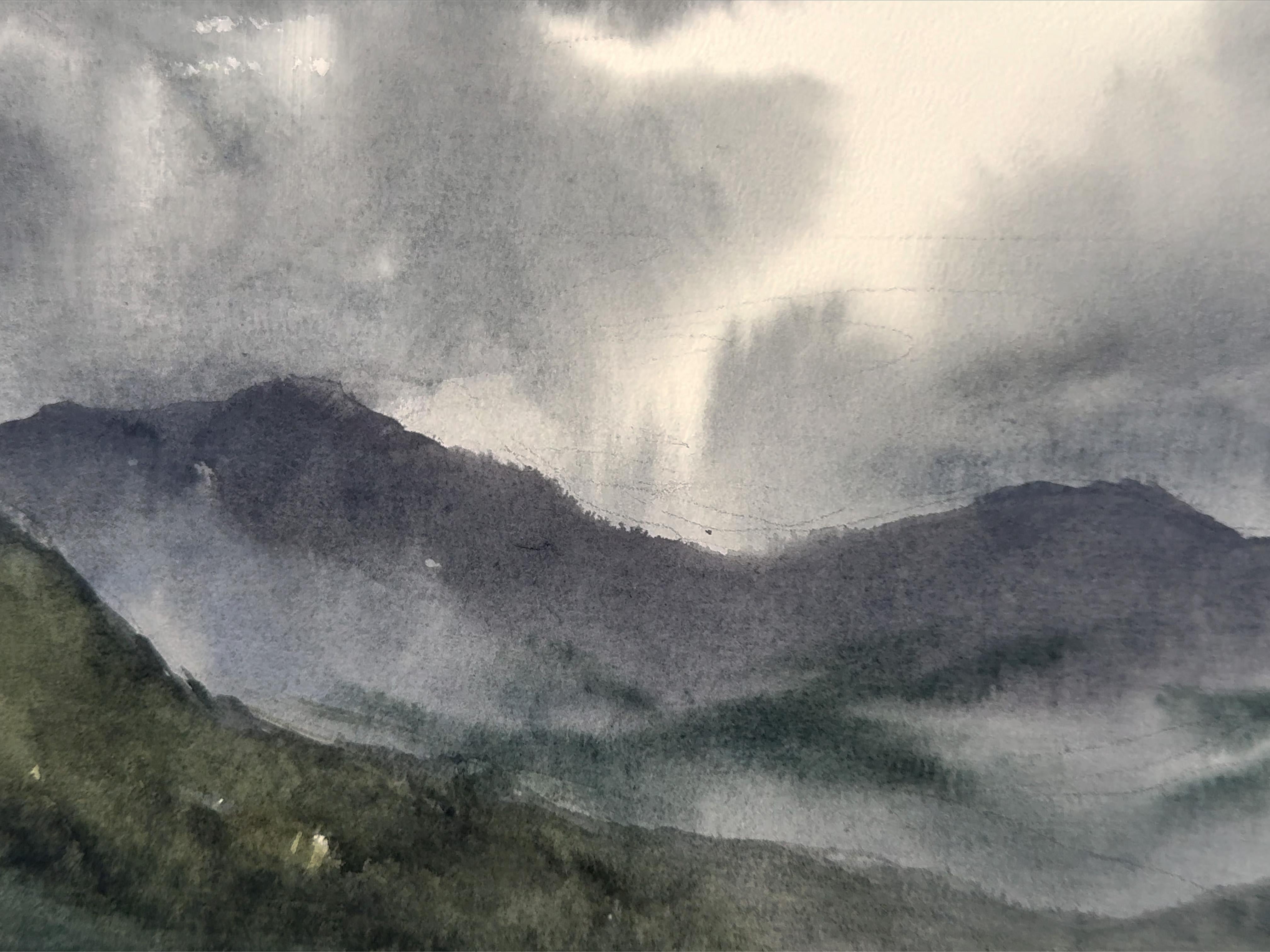 "Storm in the Mountains" is a powerful and immersive watercolor that captures the awe-inspiring, volatile atmosphere of a high-altitude tempest. The painting conveys a dramatic sense of scale, with massive, dark forms of the mountain range appearing dwarfed beneath an even more immense, turbulent sky.