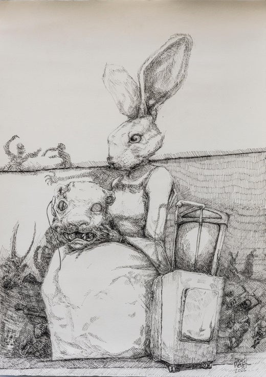 Daniel Piérart, 50 Jahre alt, ist ein Eskapist. Seit dem Ausbruch seiner posttraumatischen Belastungsstörung (PTBS) zeichnet und gestaltet er als eine Form der Selbsttherapie. In seiner inneren Welt - der Welt, die sich in seinen Zeichnungen manifestiert - gewinnt er die Kontrolle zurück. Er projiziert alle seine Konflikte auf die Figuren. Das Zeichnen in Schwarz-Weiß ermöglicht es ihm, mit dem Lichteinfall auf das Objekt zu spielen und es direkt mit dem aufgeladenen Problem in ihm zu verbinden. Während des Prozesses löst die Figur in der Zeichnung ihr Problem - oder erlaubt ihm zumindest, es von außen zu betrachten, sich damit auseinanderzusetzen oder es aus einer anderen Perspektive zu akzeptieren. "Die Figuren, die ich erschaffe, sind oft imaginäre Wesen mit tierischen Eigenschaften - meist ein menschlicher Körper mit einem Tierkopf -, die eine bestimmte Emotion symbolisieren: der Wolf steht für Wut, das Kaninchen für Wachsamkeit und Panik, der Hahn für Stolz und so weiter. Der Vogelmann - die erste Figur, der "OG" der Serie - verkörpert den Aufruhr selbst. Er wurde nach einem Besuch in einem Vogelschutzgebiet in Eilat geboren, wo ich zum ersten Mal ein Tier in einem Zustand der Versteinerung sah. Ein Führer hielt einen Vogel regungslos in der Hand, der wie tot erstarrt war - ich erkannte, dass er sich angesichts eines Raubtiers für die Strategie der Bewegungslosigkeit entschieden hatte, als letzten Ausweg, um sich tot zu stellen und auf das Beste zu hoffen. Dieses Bild hat mich einige Tage zuvor an einen persönlichen Moment auf dem Boden meiner Küche erinnert. So wurde die Figur geboren. Nach dem Vogelmann kamen die anderen Figuren, um die emotionale Komplexität des Traumas auszudrücken. Für mich ist das Schaffen eine Möglichkeit, diese Gefühle aus einer distanzierten, relativ kalten Position heraus auszudrücken.