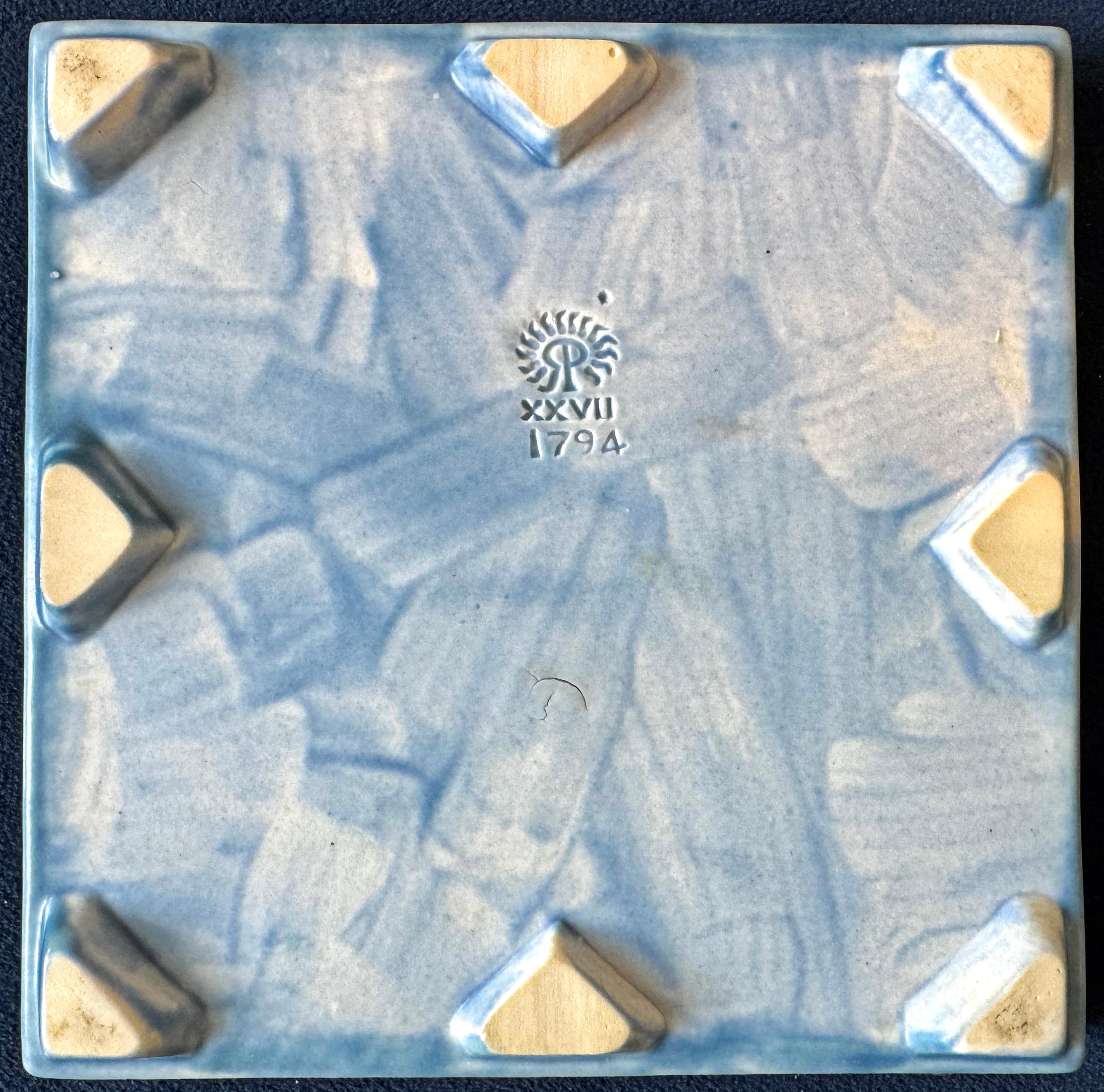 Diese Fußfliese oder Untersetzer mit ihrem Markenzeichen, dem dunkelblau glasierten Turm im Flachrelief, wurde von der famosen Firma Rookwood in Cincinnati hergestellt. Die Saatkrähe wird von einer ineinander verschlungenen geometrischen Figuration in chinesischer Manier abgesetzt, die in Blau und Weiß glasiert ist. Rookwood war mehrere Jahrzehnte lang die größte und erfolgreichste Kunsttöpferei Amerikas und produzierte vom späten 19. Jahrhundert bis in die 1950er Jahre hinein künstlerische Waren. Das Unternehmen, das zu Beginn des 20. Jahrhunderts vor allem für seine Arts-and-Crafts-Stücke bekannt war, produzierte bis in die 1940er Jahre hinein auch feines Art-Déco-Geschirr. Der Untersetzer ist vollständig markiert und auf 1927 datiert.