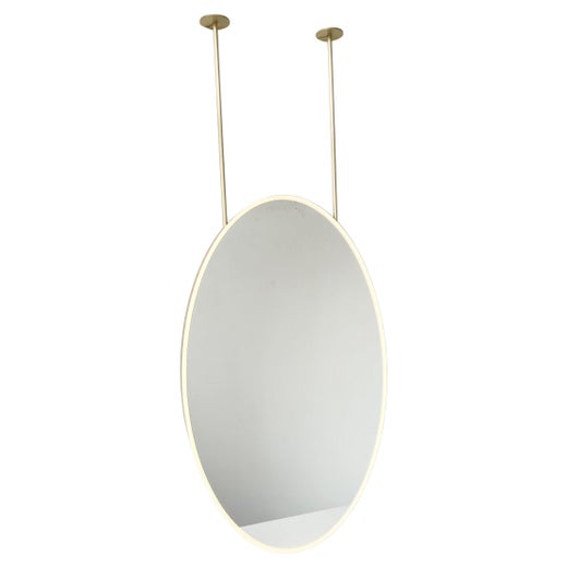 Minimalistischer, halbmondförmiger, goldfarbener, rahmenloser Spiegel Luna™ mit Schwebeeffekt. Ausgestattet mit einem hochwertigen und ausgeklügelten Aufhängesystem für eine flexible...