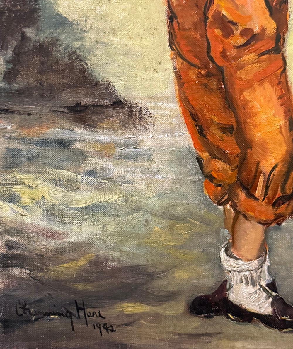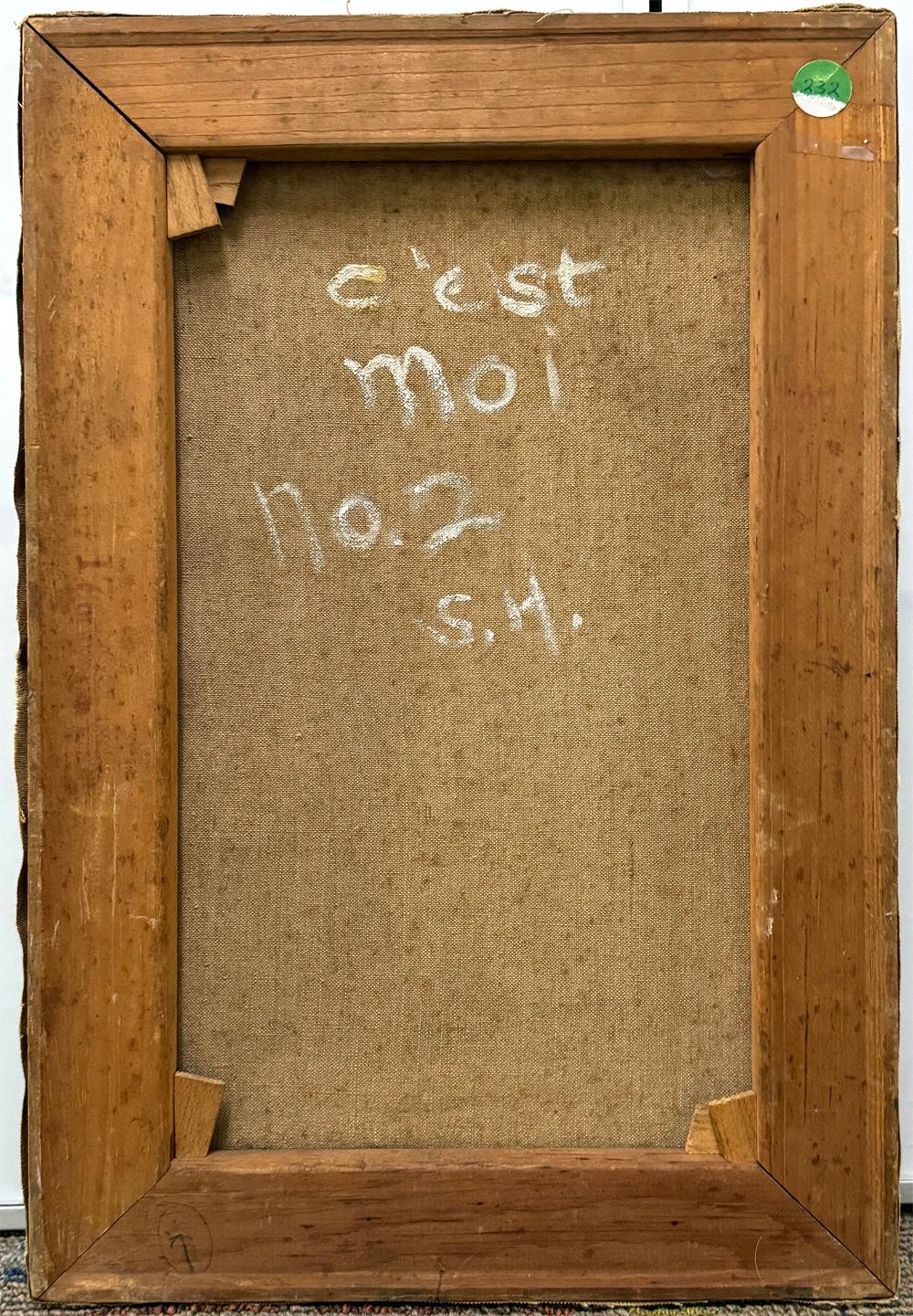 Dieses schrullige und etwas grenzüberschreitende Selbstporträt von Channing Weir Hare verweist auf sein fabelhaftes Leben in Palm Beach und Maine sowie auf die High Society, mit der er über Jahrzehnte hinweg gemalt und verkehrt hat. Hier zeigt er sich auf einer Art Bühne, mit einer Rose in der einen und einem Strohhut in der anderen Hand, was das triumphale Ende einer Varieté-Revue andeutet. Hare wuchs in Vermont und New York auf, studierte an den besten Schulen - unter anderem an der Art Student League of New York bei Robert Henri, George Bellows und William Zorach - und begann ein Leben als Porträtmaler und Antiquitätensammler. Er malte die Konterfeis von Phyllis Rhinelander, Alexander Woolcott, Beatrice Lillie und Booth Tarkington, und seine Bilder befinden sich unter anderem in den Sammlungen des Boston Museum of Fine Arts und der Pennsylvania Academy of Fine Arts. Er war verheiratet, lebte aber offen schwul, eine Seltenheit in dieser Zeit. Das Gemälde ist in Öl auf Leinwand gemalt und wird aufgespannt, aber nicht gerahmt. Es ist signiert, datiert und auf der Rückseite betitelt.