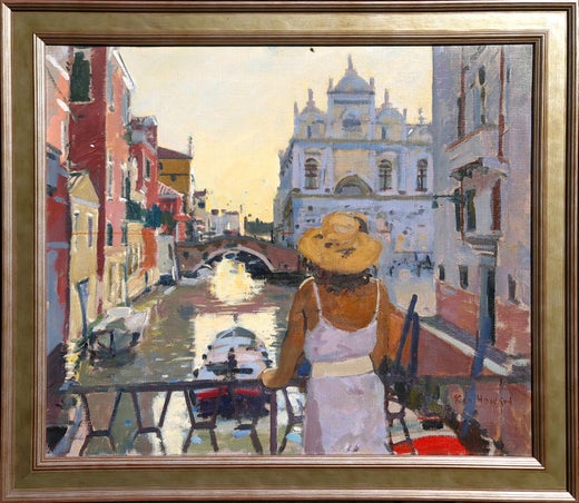 Der moderne britische Maler Ken Howard malt regelmäßig Motive wie den Akt im Studio, venezianische Szenen und Strände in Cornwall. Howard wurde 1932 in London geboren und studierte von 1949 bis 1953 an der Hornsey School of Art, bevor er seinen Wehrdienst bei den Royal Marines ableistete. 1955 kehrte er zurück, um am Royal College of Art zu studieren, und im selben Jahr hatte er seine erste Einzelausstellung im Plymouth Art Centre. Von da an stellte er ausgiebig im In- und Ausland aus, insbesondere mit der New Grafton Gallery in den frühen 1970er Jahren. 1973 wurde er vom Imperial War Museum zum offiziellen Kriegskünstler in Nordirland ernannt. Im Laufe seiner künstlerischen Karriere hat Howard eine Reihe bedeutender Preise gewonnen und ist Mitglied in einer Reihe angesehener Organisationen geworden. Er wurde 1966 zum Mitglied des Royal Institute of Oil Painters und 1981 zum Mitglied der Royal West of England Academy gewählt und 1988 zum Ehrenmitglied der Royal Society of British Artists ernannt. Howard, der seit 1964 regelmäßig an der Royal Academy ausstellt, wurde 1991 zum Royal Academician gewählt und 1998 zum Präsidenten des New English Art Club ernannt. Zu seinen zahlreichen Auszeichnungen gehören der erste Preis des Lord Mayor's Art Award 1966, der erste Preis der Hunting Group Awards und der Kritikerpreis der Sparkasse Karlsruhe, Deutschland 1985. Heute teilt er seine Zeit zwischen seinen Studios in Cornwall und London auf. Seine Werke sind in vielen privaten und öffentlichen Sammlungen zu finden, darunter das Imperial War Museum und die Plymouth City Art Gallery.
