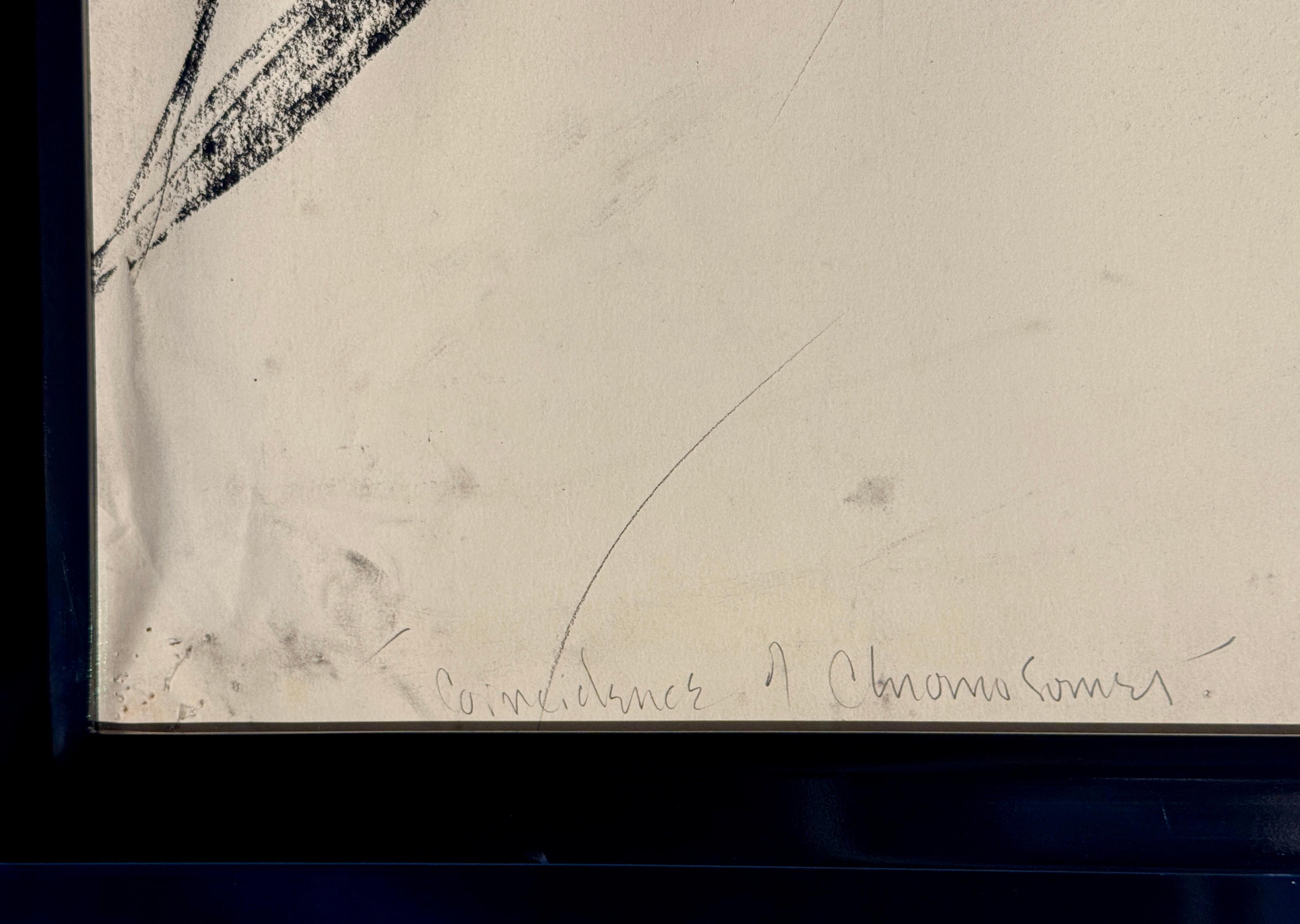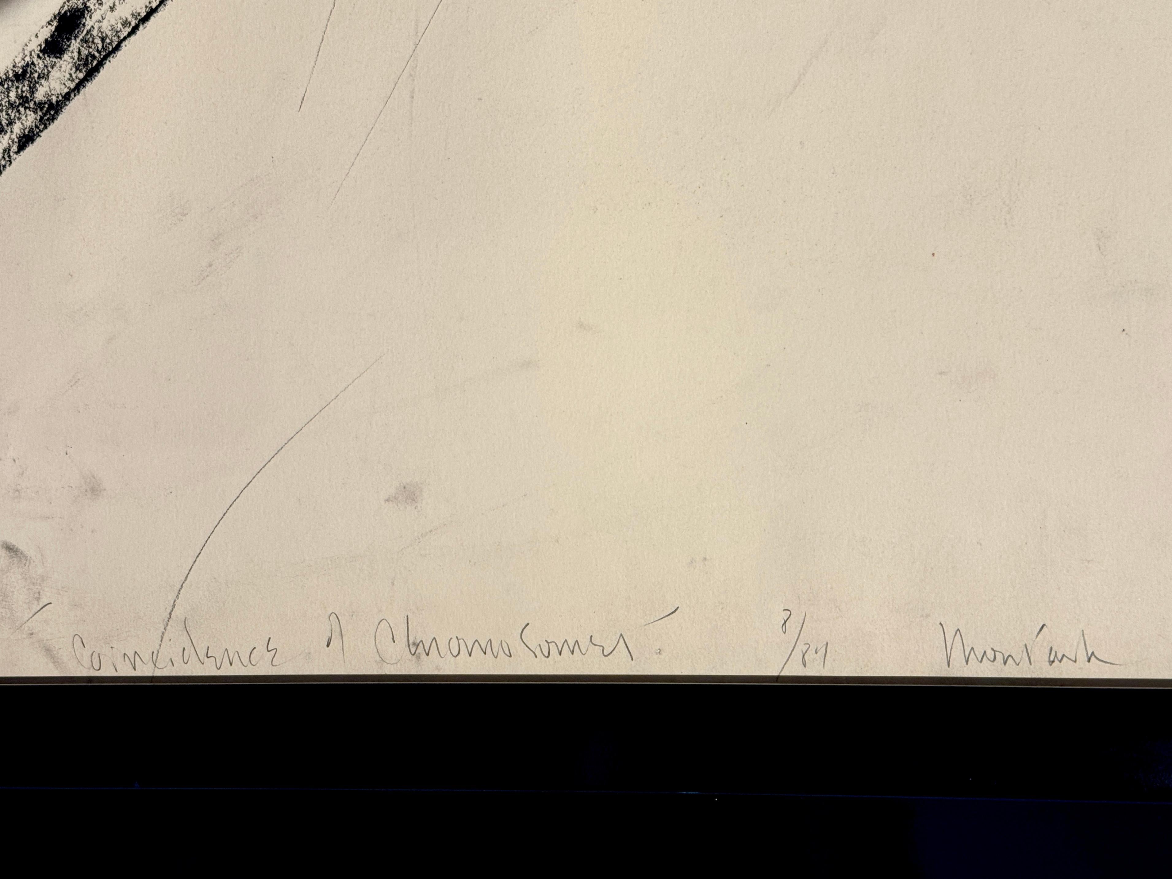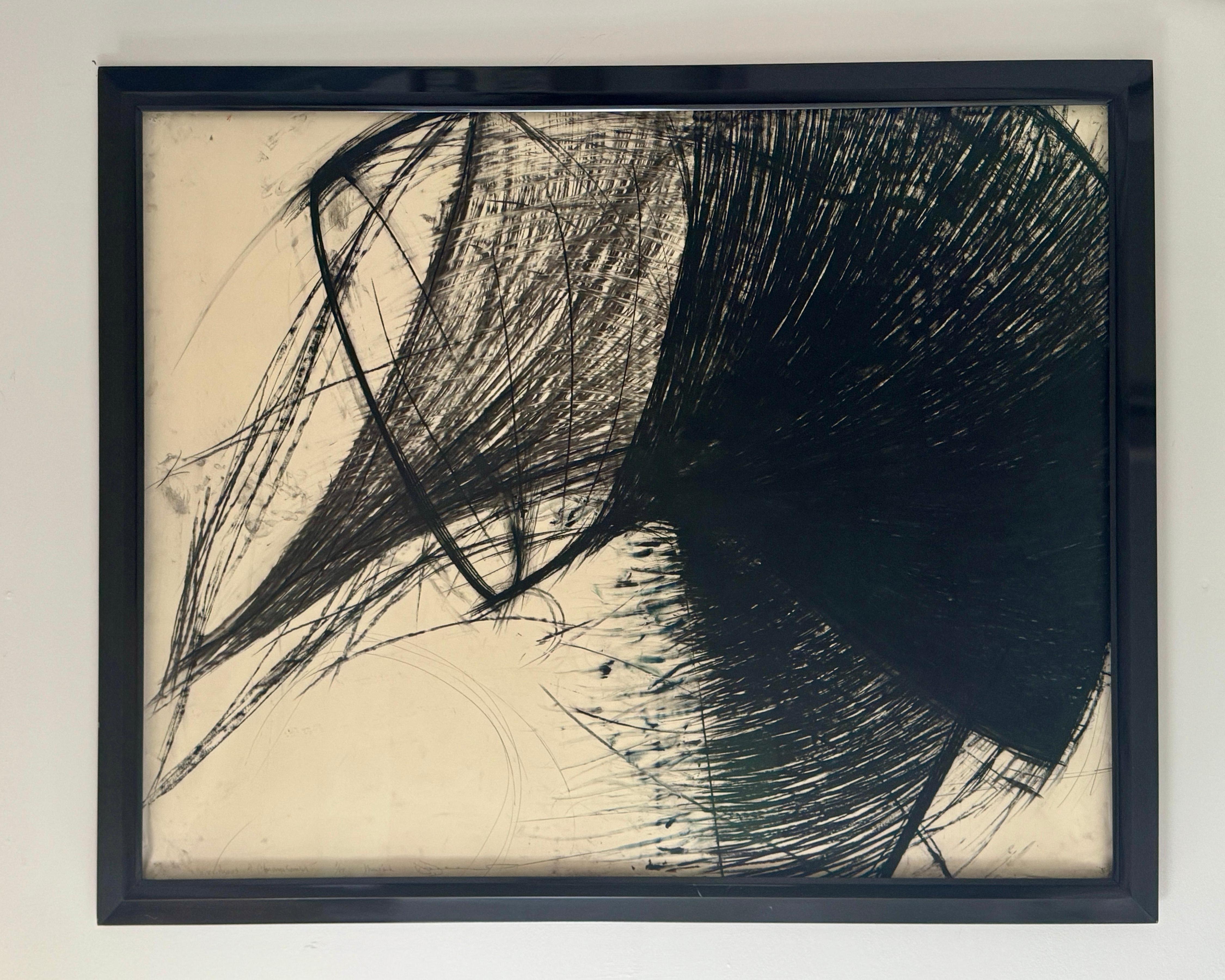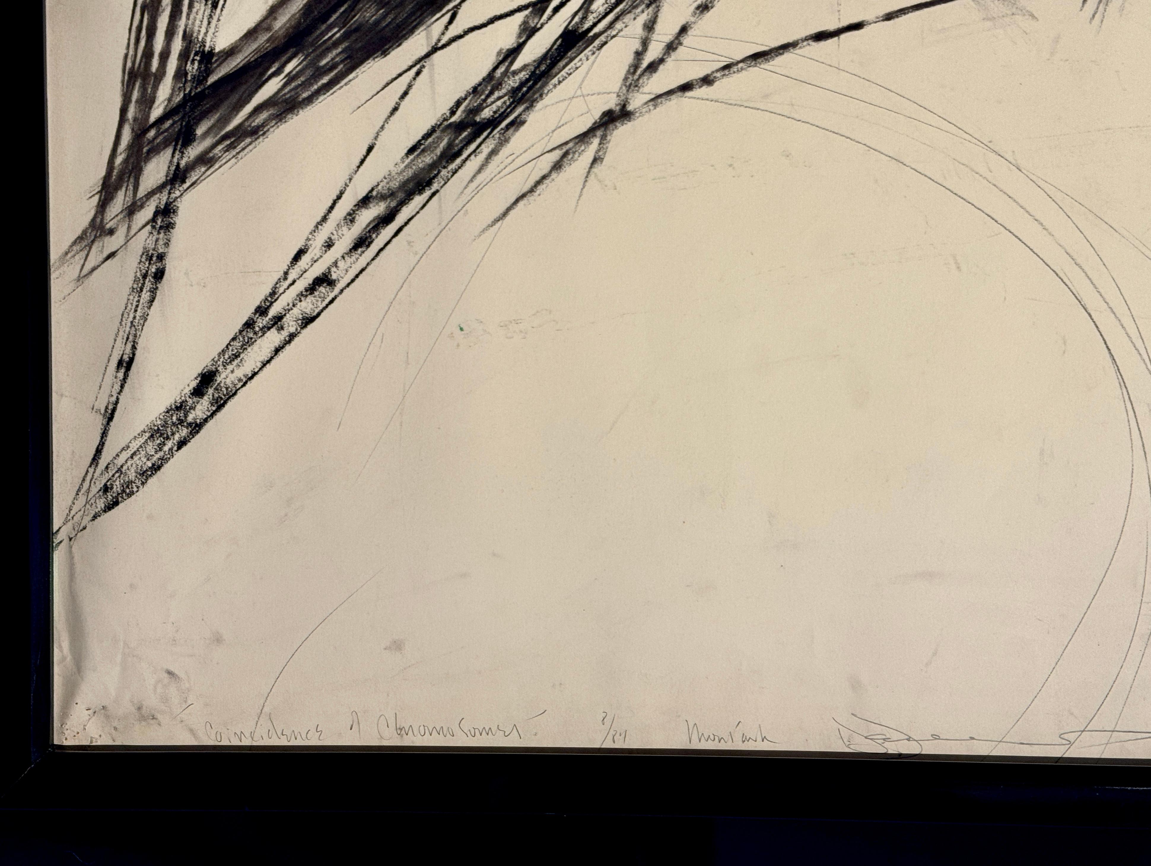 Eine dynamische abstrakte Lithografie der amerikanischen Künstlerin Heide Fasnacht mit dem Titel "Montauk Coincidence". Dieses 1984 entstandene Werk verkörpert Fasnachts Erkundung von Bewegung, Spannung und räumlicher Energie durch kühne gestische Zeichen.