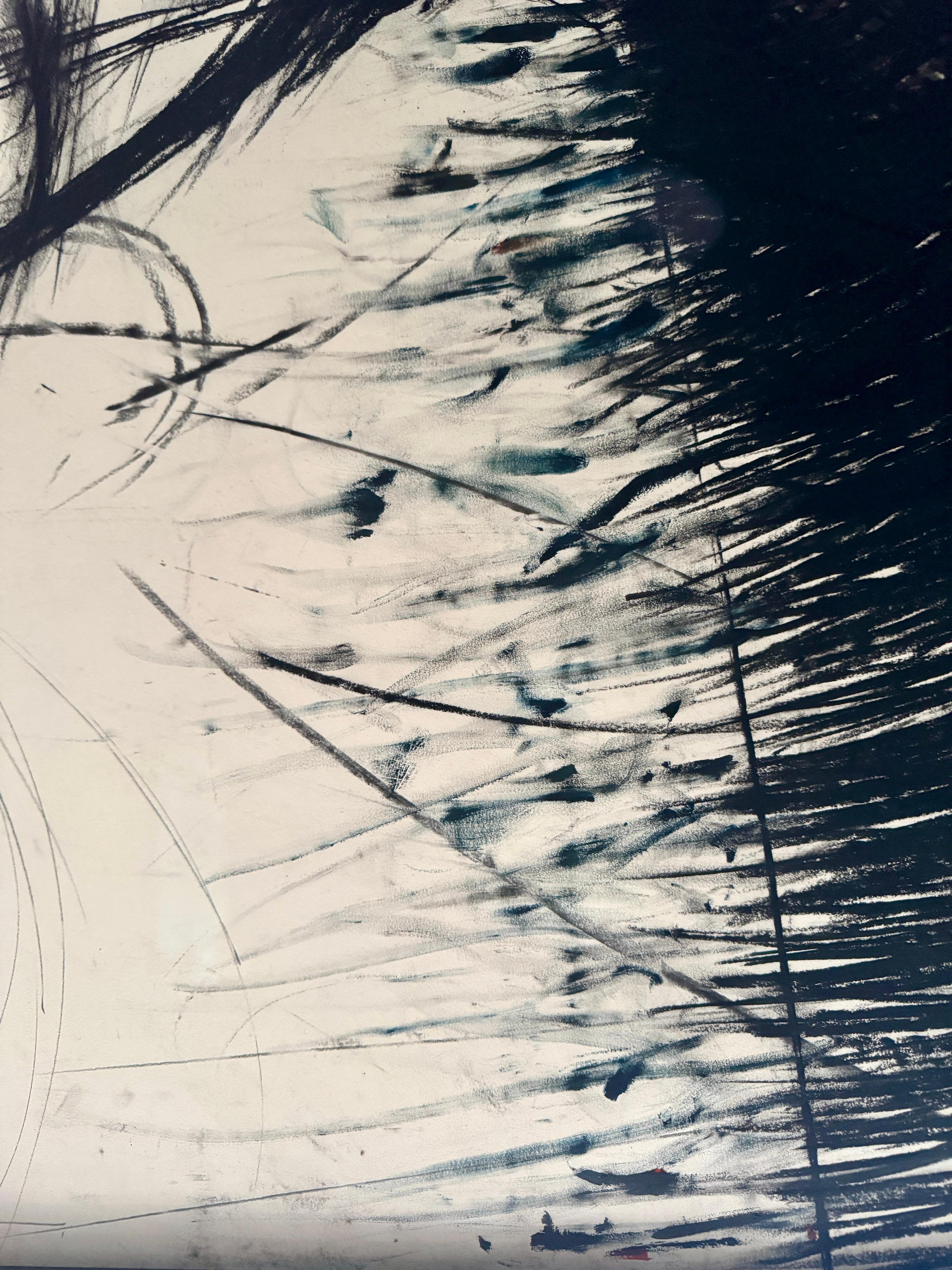 Gedruckt auf schwerem Papier mit ausdrucksstarken schwarzen Formen, die sich in Bögen über die Oberfläche ziehen, vermittelt das Werk ein Gefühl von Rhythmus und kontrolliertem Chaos - Markenzeichen von Fasnachts frühen Arbeiten auf Papier.