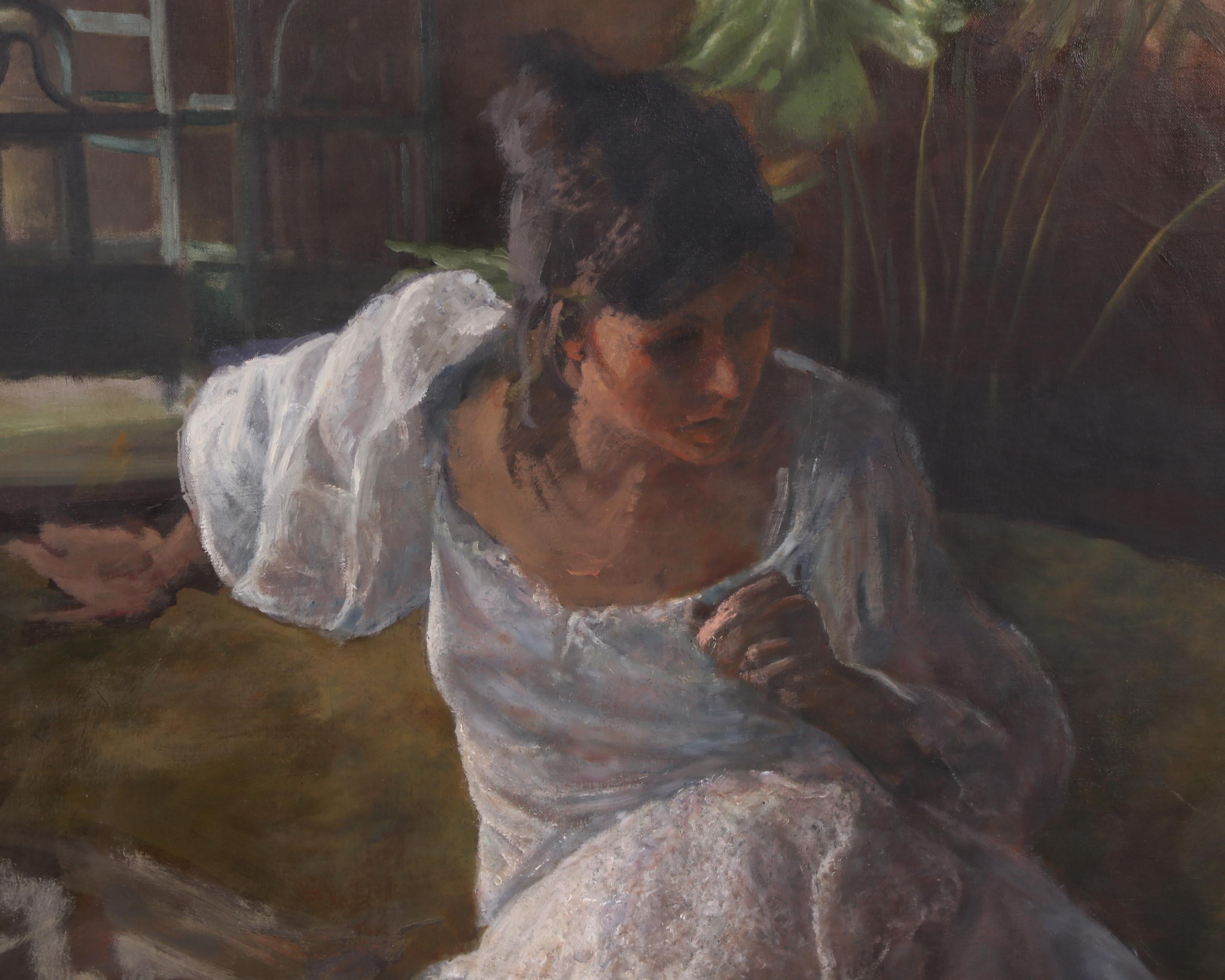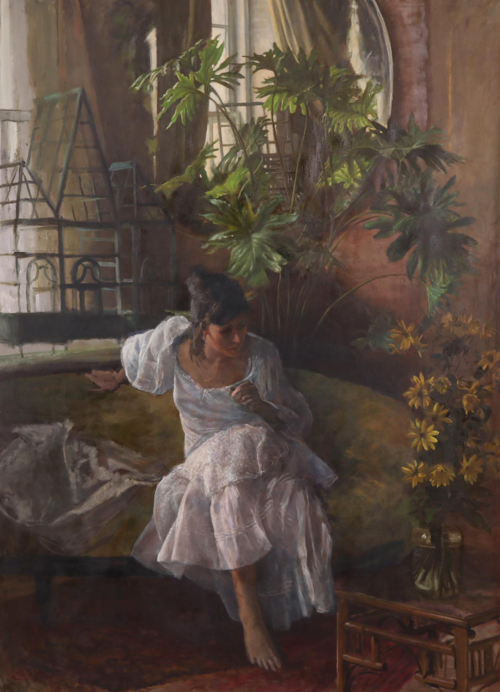 Ein Ölgemälde aus dem frühen 20. Jahrhundert, das eine junge Frau in ihrem Salon zeigt, der mit warmen Farbtönen und zartem natürlichem Licht ausgestattet ist. Signiert und datiert 1...