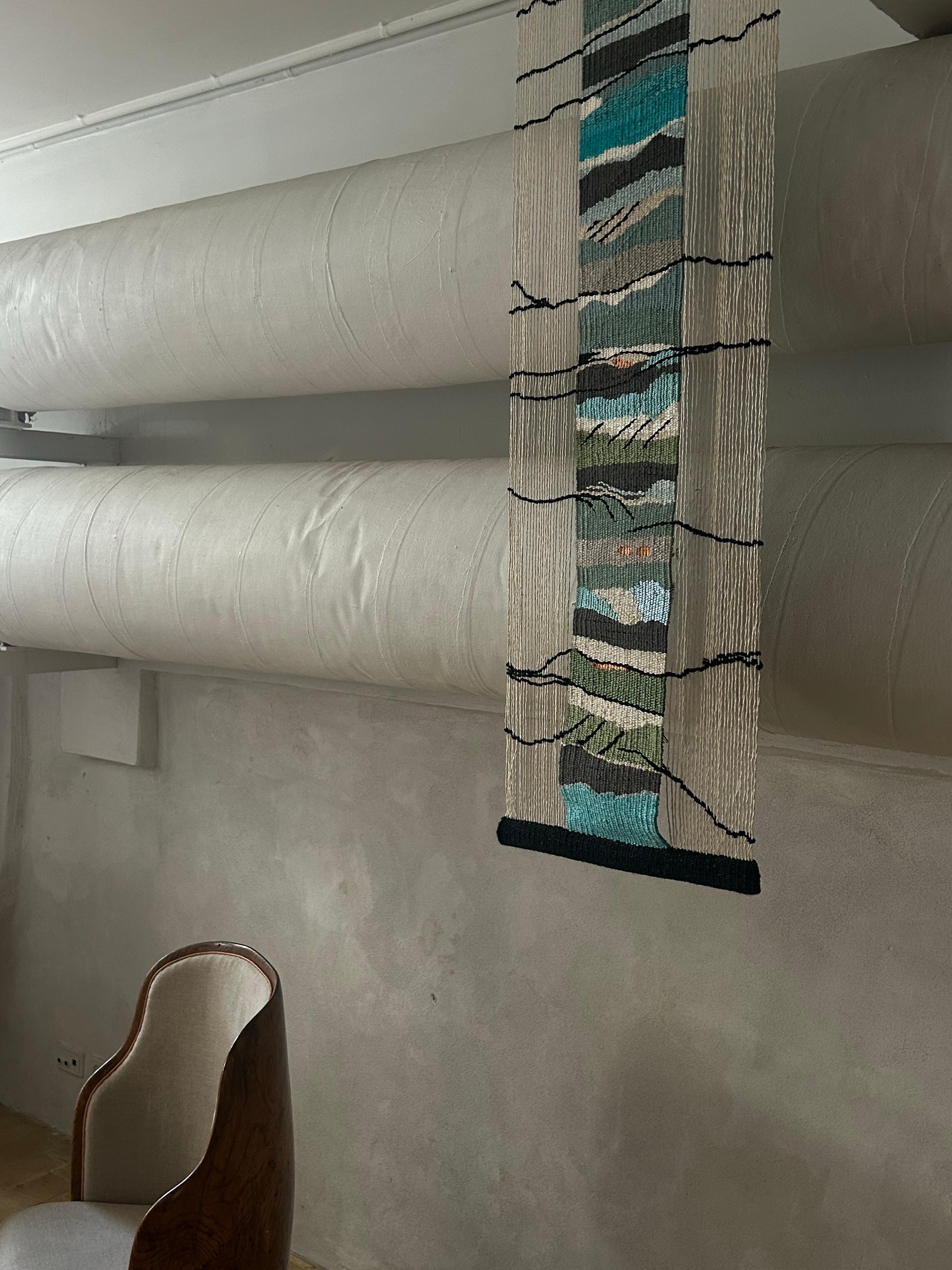 "Islandsk landskab", handgewebter Wandteppich aus Wolle und Leinen.