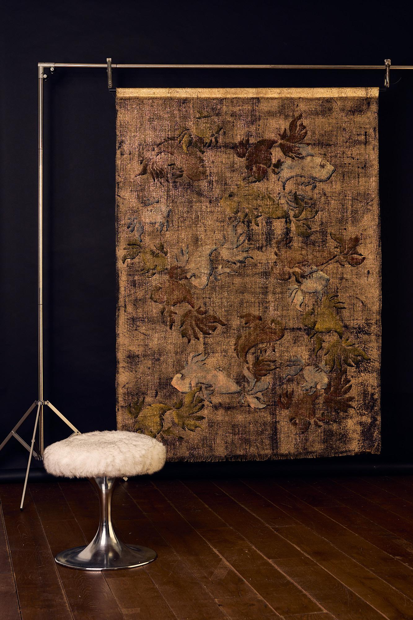 "Big Fish" ist ein großformatiges Wandobjekt aus naturbelassener Jute, inspiriert von herbstlichen Tagen am Meer. Auf einem dunkleren Hintergrund bewegen sich weich nuancierte, leicht transparente Fischformen, die dem Werk eine ruhige, organische Dynamik verleihen.