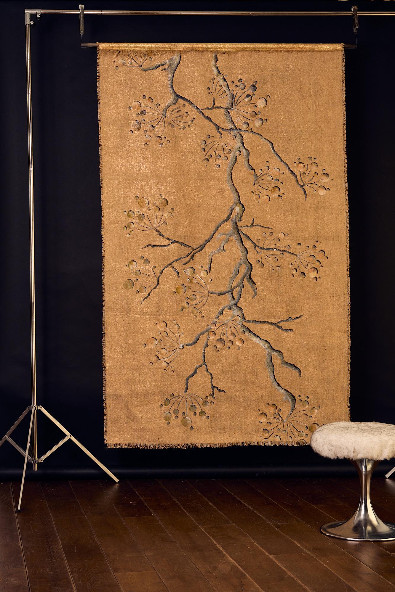 "Dark Magnolia" entstand aus naturbelassener Jute und wurde in mehreren Schichten mit handgeschnittenen Schablonen und Acrylfarben bemalt. Die Rückseite ist mit goldfarbenen Metallbl...