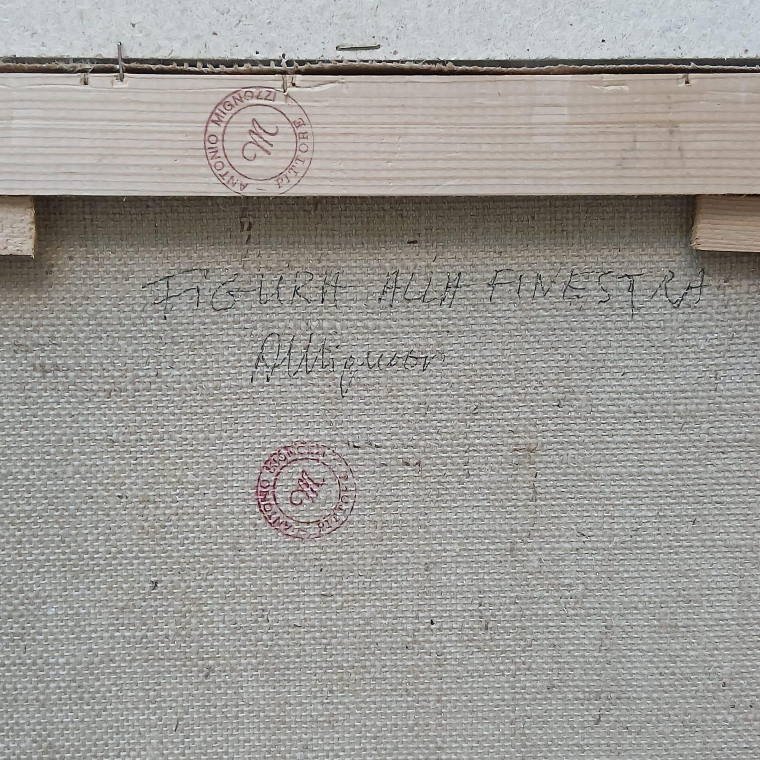 "Figura alla finestra" ist ein Originalwerk von Antonio Mignozzi, das mit der charakteristischen Technik des Künstlers realisiert wurde: ein Kunstwerk auf Leinwand, das mit einer materiellen Beschichtung vorbereitet wurde, die alte Töne, Graffiti und sichtbare Oberflächen wiedergibt. Die Frontalfigur, die durch essenzielle Linien und einen spitzen Winkel definiert ist, ist typisch für die reifste Fase von Mignozzi, die zwischen den Jahren Settanta und Ottanta stattfand. Auf der Vorderseite der Oper befinden sich das Firmenlogo und auf der Rückseite der handgeschriebene Titel und das Künstlertimbre, Elemente, die die Herkunft und Autorität des Künstlers unterstreichen.
