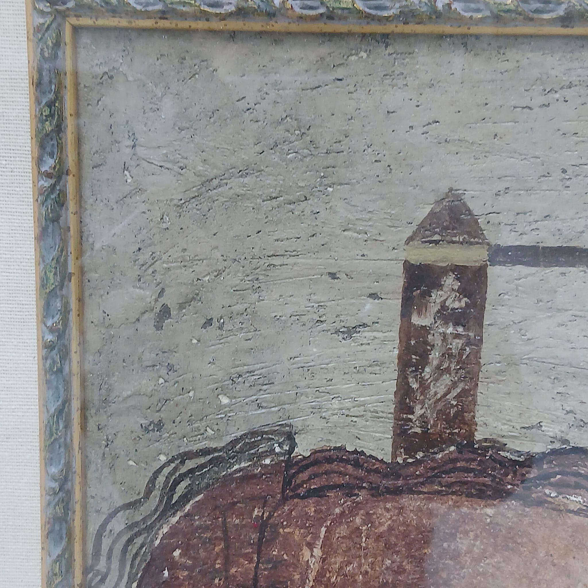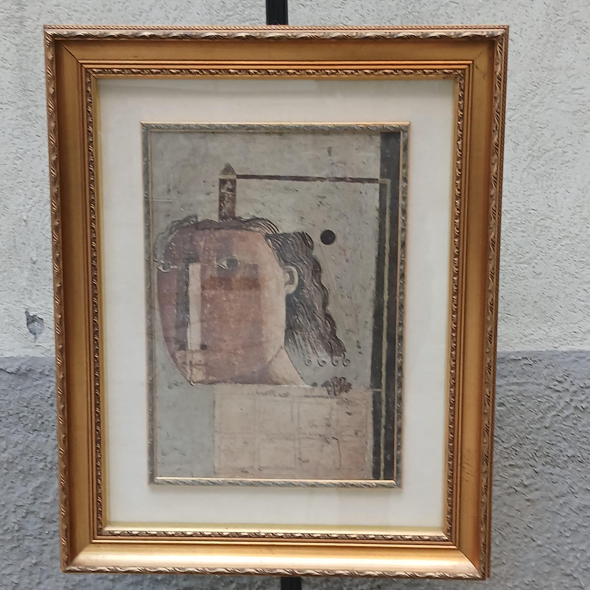 "Figura" ist eine originale Oper von Antonio Mignozzi, die auf einem mit Affresstechnik präparierten Stoff gedruckt und im modernen Stil neu interpretiert wurde. Die Malerei, materiell und visuell, präsentiert eine stilisierte Frontalfigur, essentielle Elemente und eine Wiederholung, die den Verlauf und die Struktur des Bildträgers trennt - typische Elemente der Poesie von Mignozzi, die in einer Malerei zwischen Erinnerung und Metafaszität zusammenfließen. Die Figur mit dem brennenden Kopf und dem nachdenklichen Blick erscheint auf einem neutralen, materiellen Untergrund, der durch ein schönes Gesims verziert ist. L'opera misura 50 × 35 cm (tela) e 78 × 62 cm (con cornice). Firmata sul retro, a conferma dell'autenticità. Erhaltungszustand: Altersspuren, die mit der Technik und der Materie übereinstimmen, ohne erkennbare Schäden. Diese Tafel entsteht in der Fase der Reifung des Künstlers - in den Jahren '70/'80 -, als sich seine Suche auf die Essenzialität des Segments und die evokative Materialität konzentriert. Ein ideales Werk für Sammler italienischer Malerei aus der zweiten Hälfte des XX. Jahrhunderts oder für zeitgenössische Kunstliebhaber, die eine raffinierte und meditative Ästhetik bevorzugen.