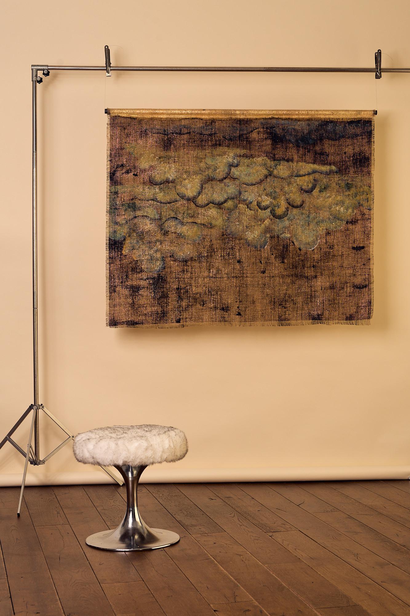 "Stormy Day" wurde auf naturbelassener Jute mit handgefertigten Schablonen und Acrylfarben gestaltet. Die Rückseite ist mit goldfarbenen Metallblättchen gearbeitet, die sich durch das Gewebe leicht abzeichnen und dem Werk einen beinahe transparenten, atmosphärischen Charakter verleihen.