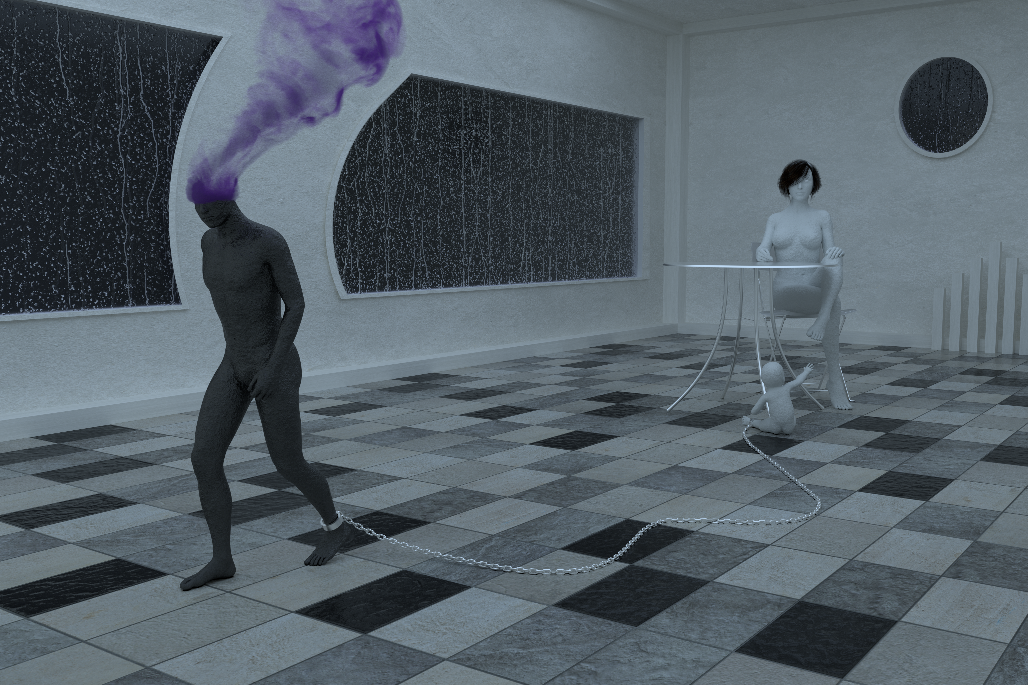 The scene depicts an irreconcilable impasse between two lovers occupying separate positions. Each position reflects a particular tendency caught up in a unique (yet familiar) expression of a gendered logic. The feminine subject watches from a short distance as the masculine figure walks away, chained to a baby and expunging smoke from their head. The baby reaches up toward the feminine subject in a desire for maternal comfort, as the feminine subject pays no attention to it. In psychoanalysis, when an intimate relationship ends an unconscious fantasy possibly also comes to an end. In one expression, as the relationship reaches its conclusion, the masculine subject is infantilized and fettered by the leftover experience of being like a baby to their lover. Whereas the feminine subject initially identifies with, and even accepts the authority of maternal care, only for it to in excess become ambivalent repulsion by its rigid unevenness, signaling the end of fantasy.