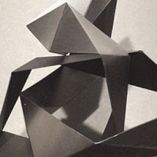 Bruno transforms the flat into spatial design. More important is the transition from one dimension to another and not so much the end result. He actually puts the flat shape (or parts of it) into motion, until it is what it should be. Due to the dynamics of the process, the movement in the design continues to exist and creates an unambiguous and non-static end product.