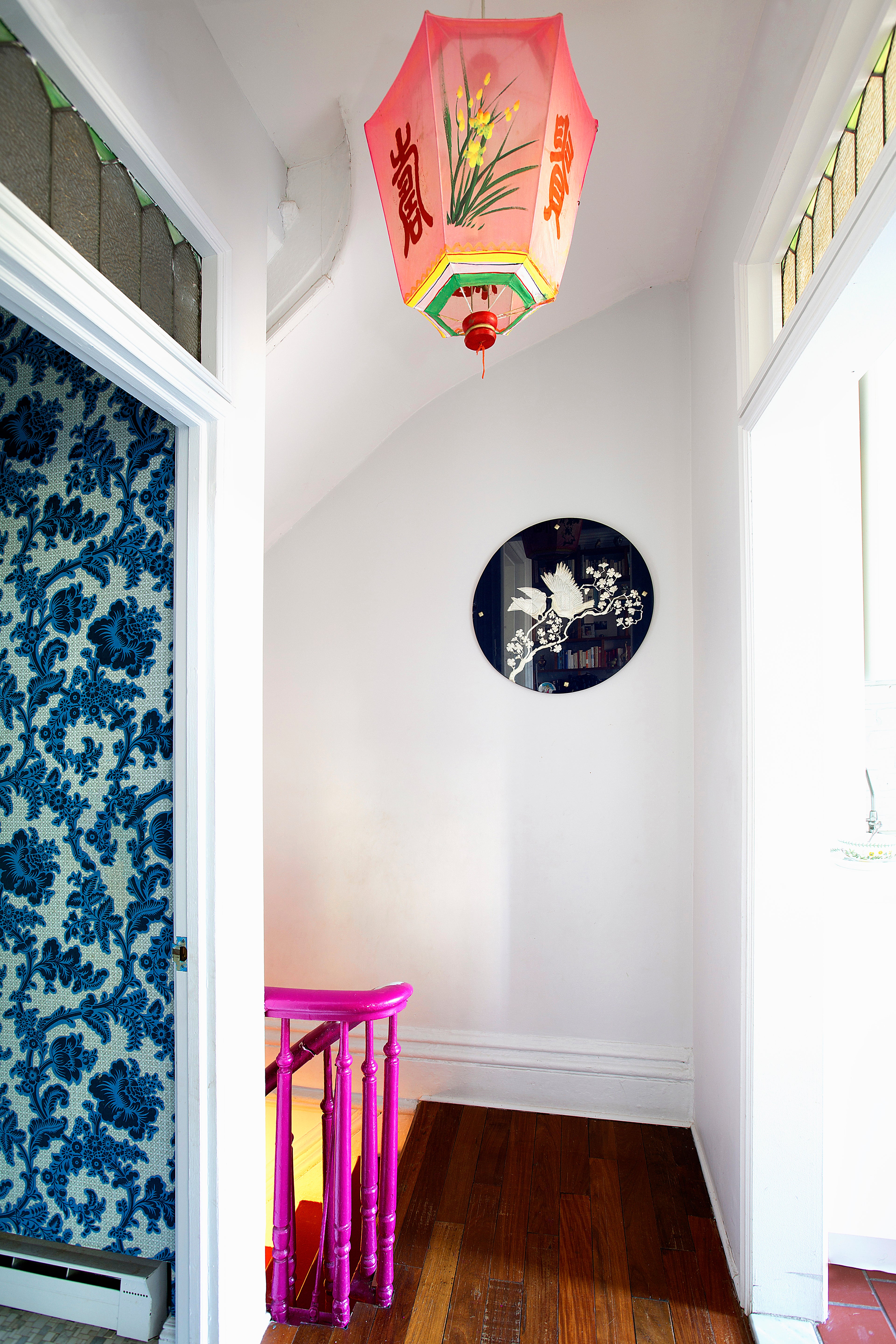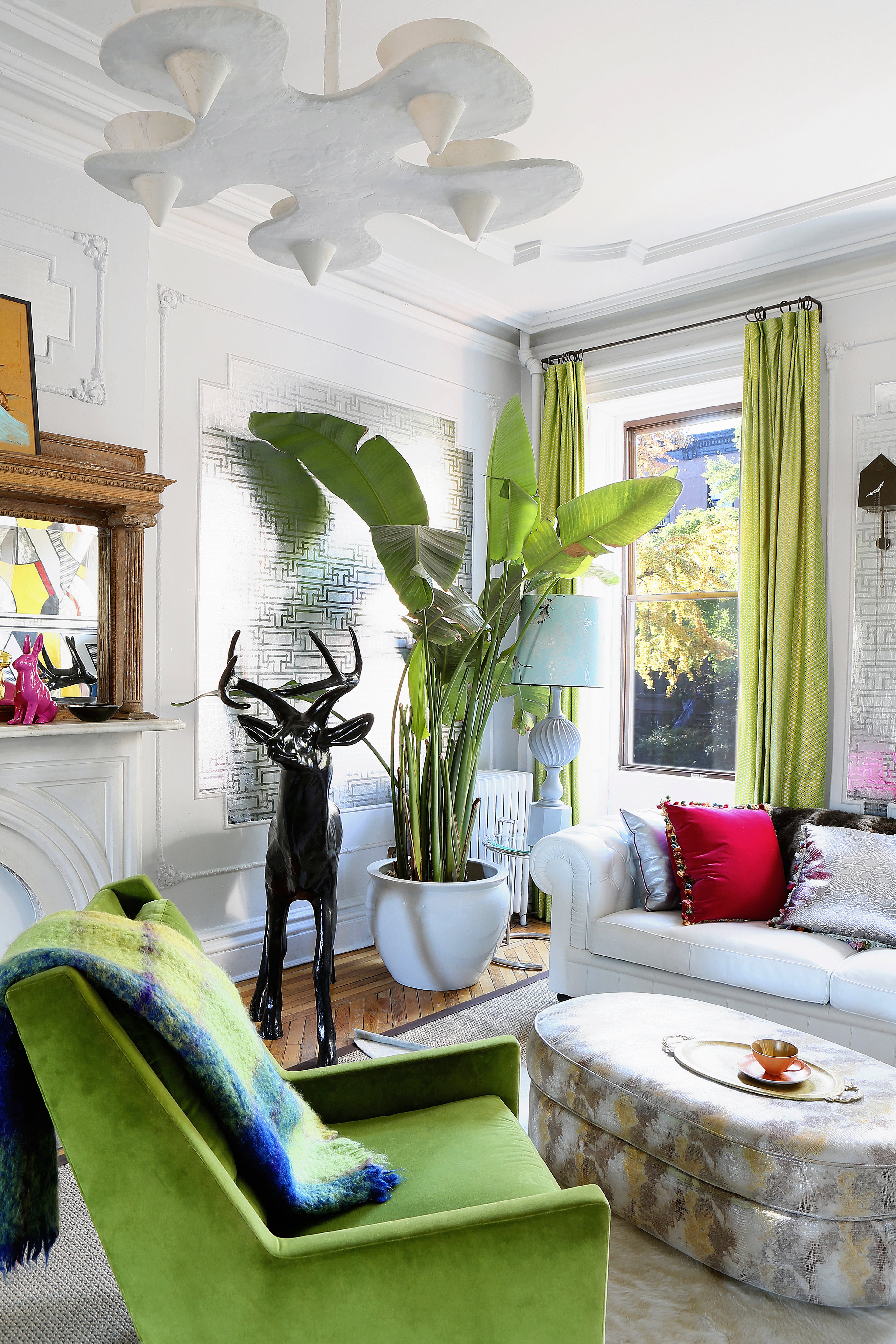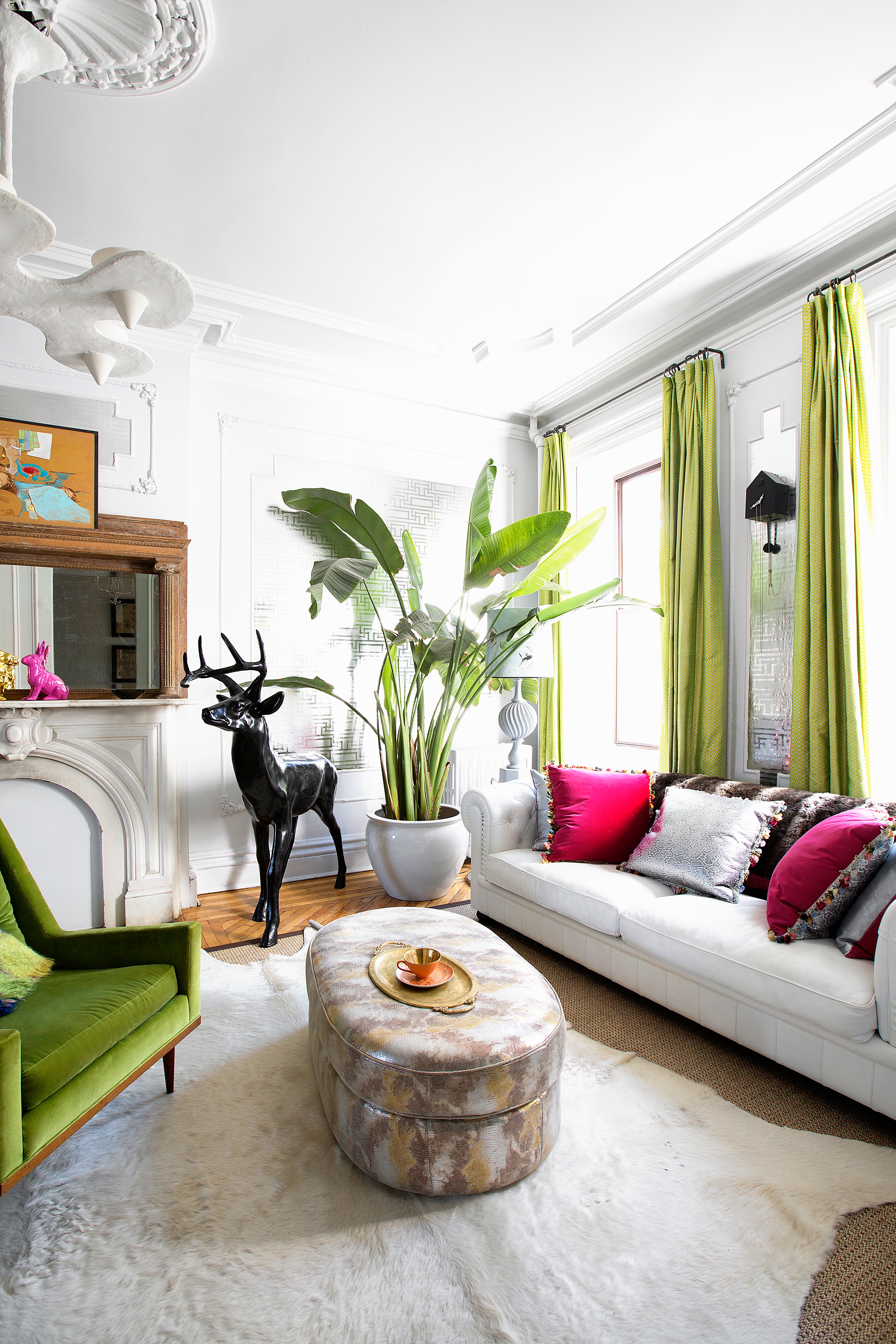 Alice in wonderland with a surrealist sensibility. This home is wild and comfortable with mostly vintage furnishings. The interior is meant to invoke a forest feeling with disco glamour mixed in. Hot pink and chartreuse green color scheme should be preppy but with this mix of furniture it feels wild.