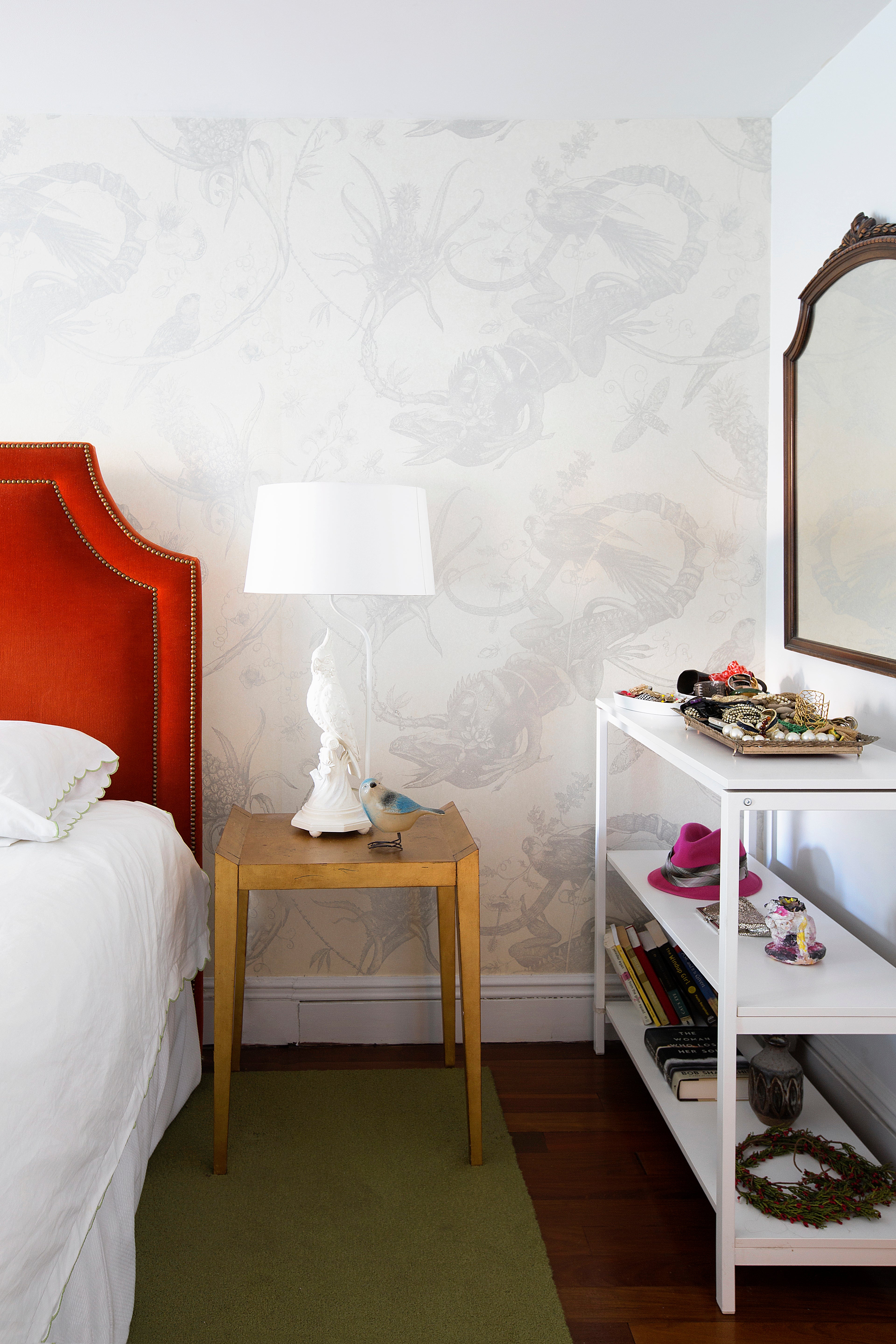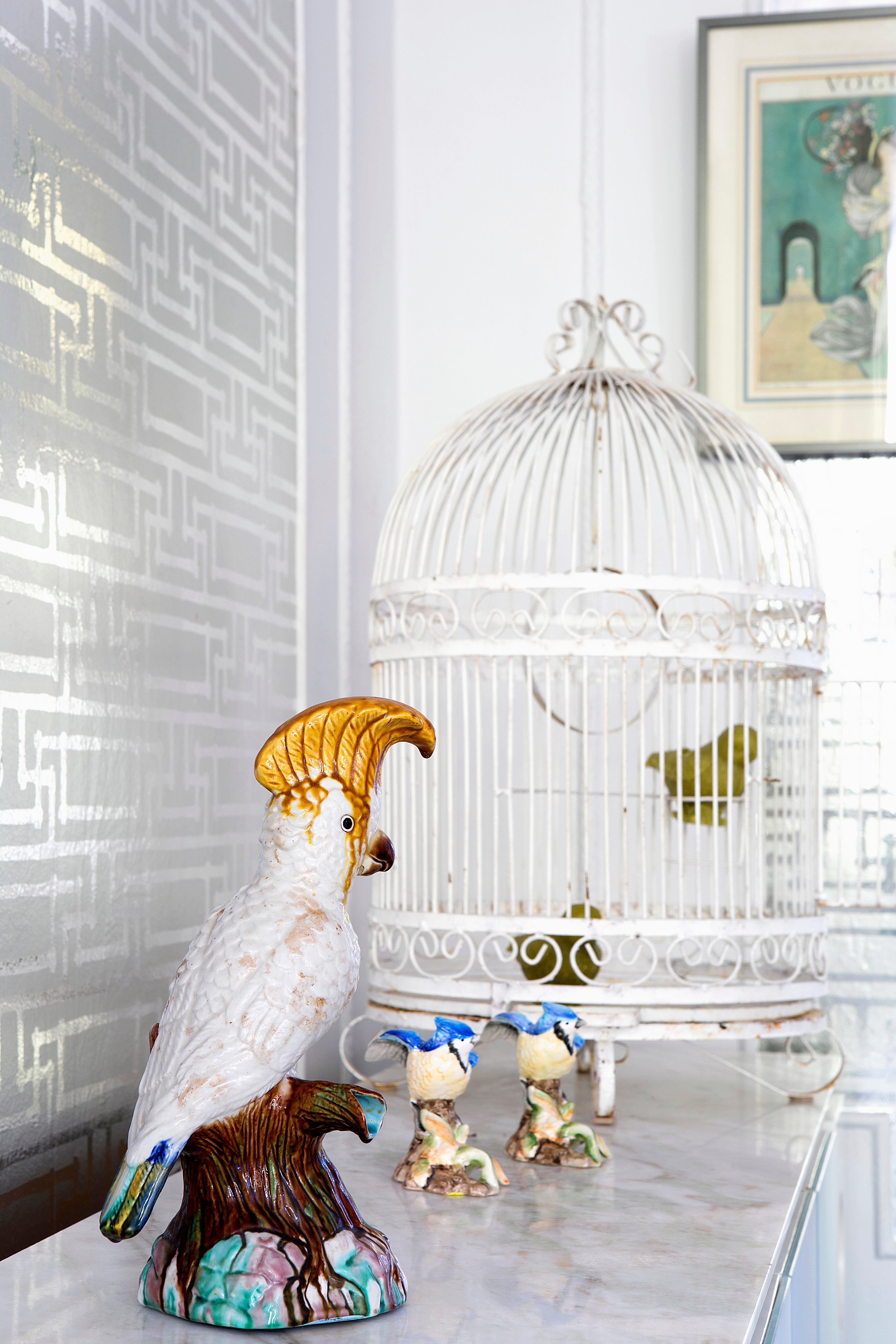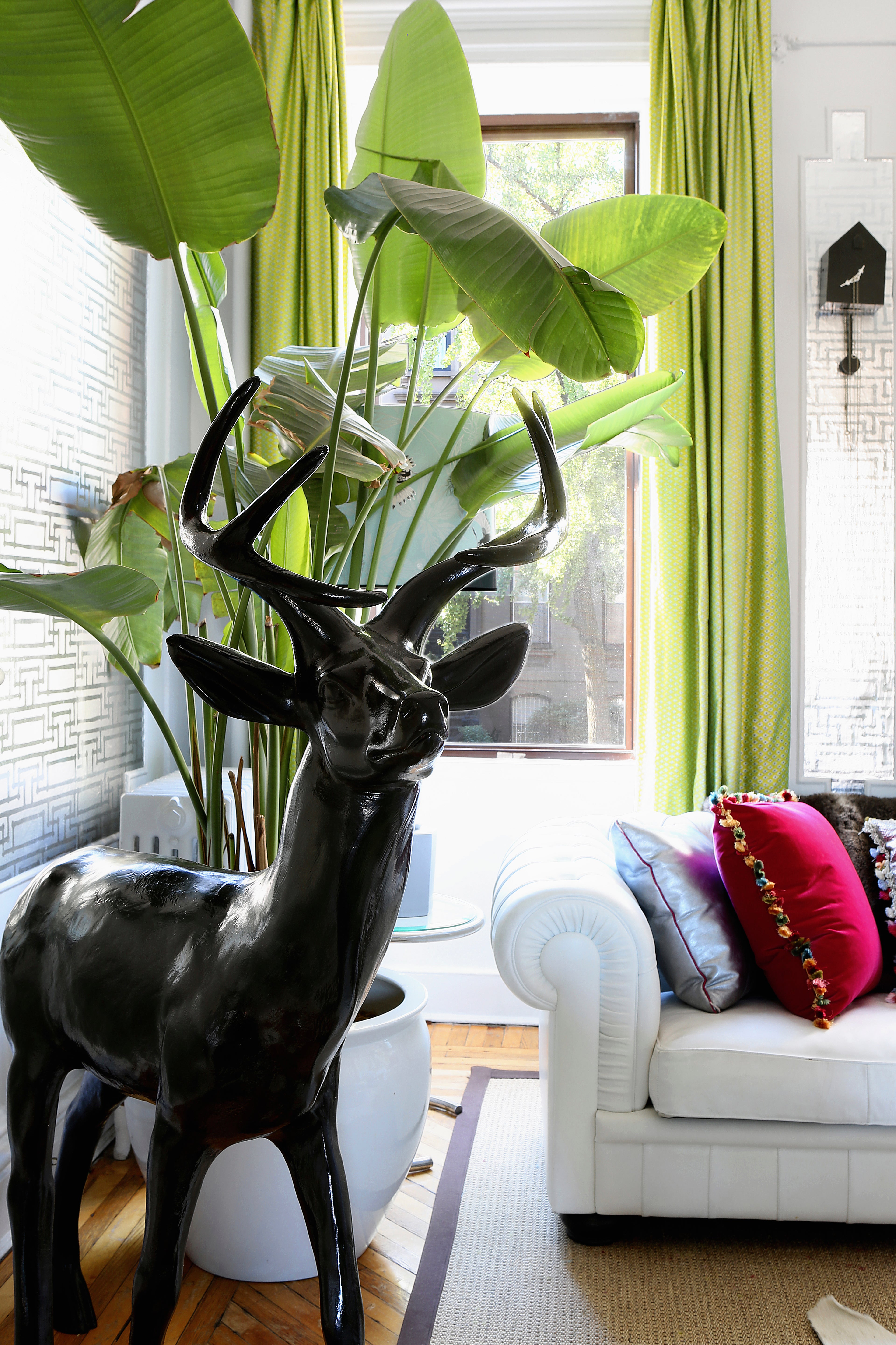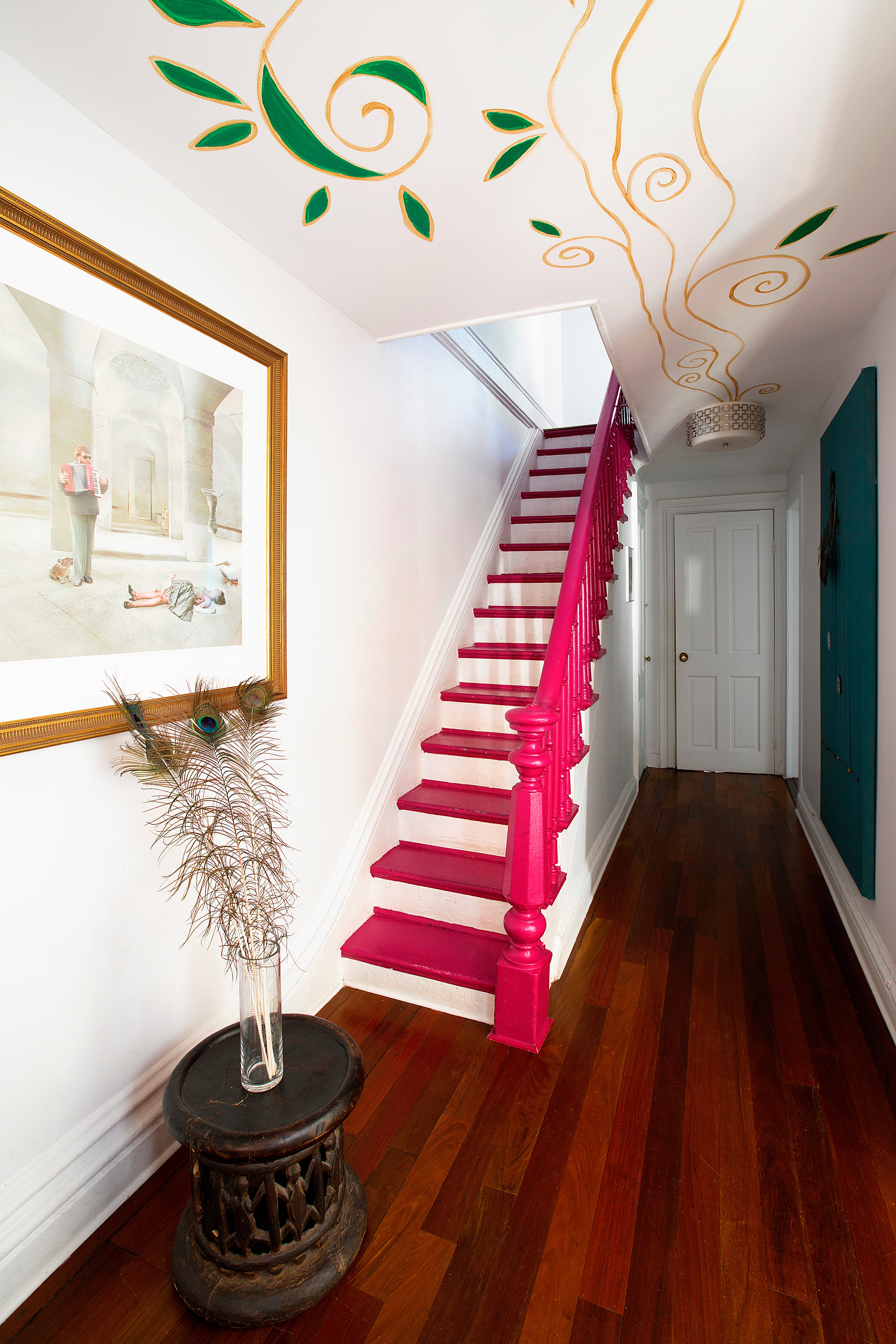 Alice in wonderland with a surrealist sensibility. This home is wild and comfortable with mostly vintage furnishings. The interior is meant to invoke a forest feeling with disco glamour mixed in. Hot pink and chartreuse green color scheme should be preppy but with this mix of furniture it feels wild.