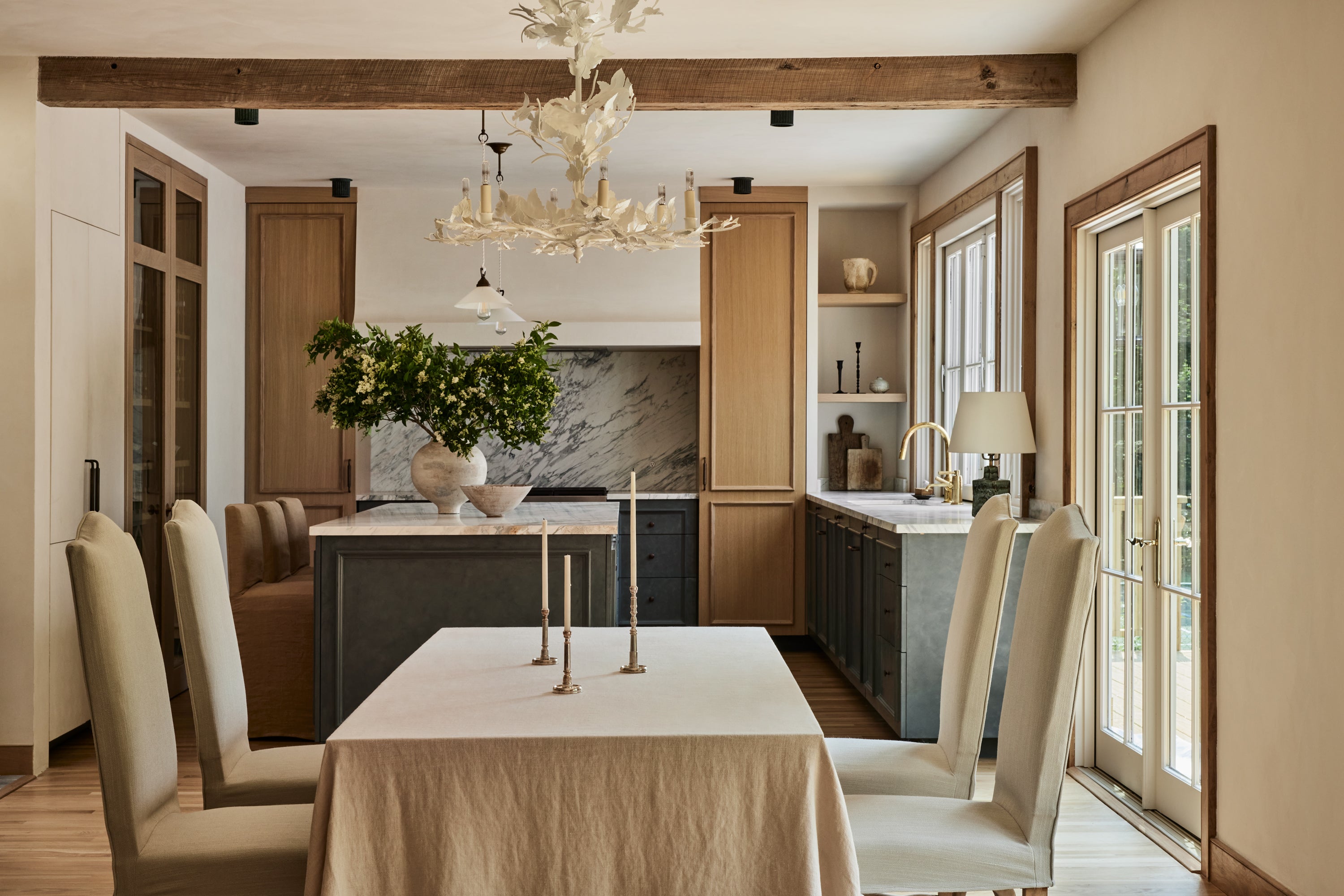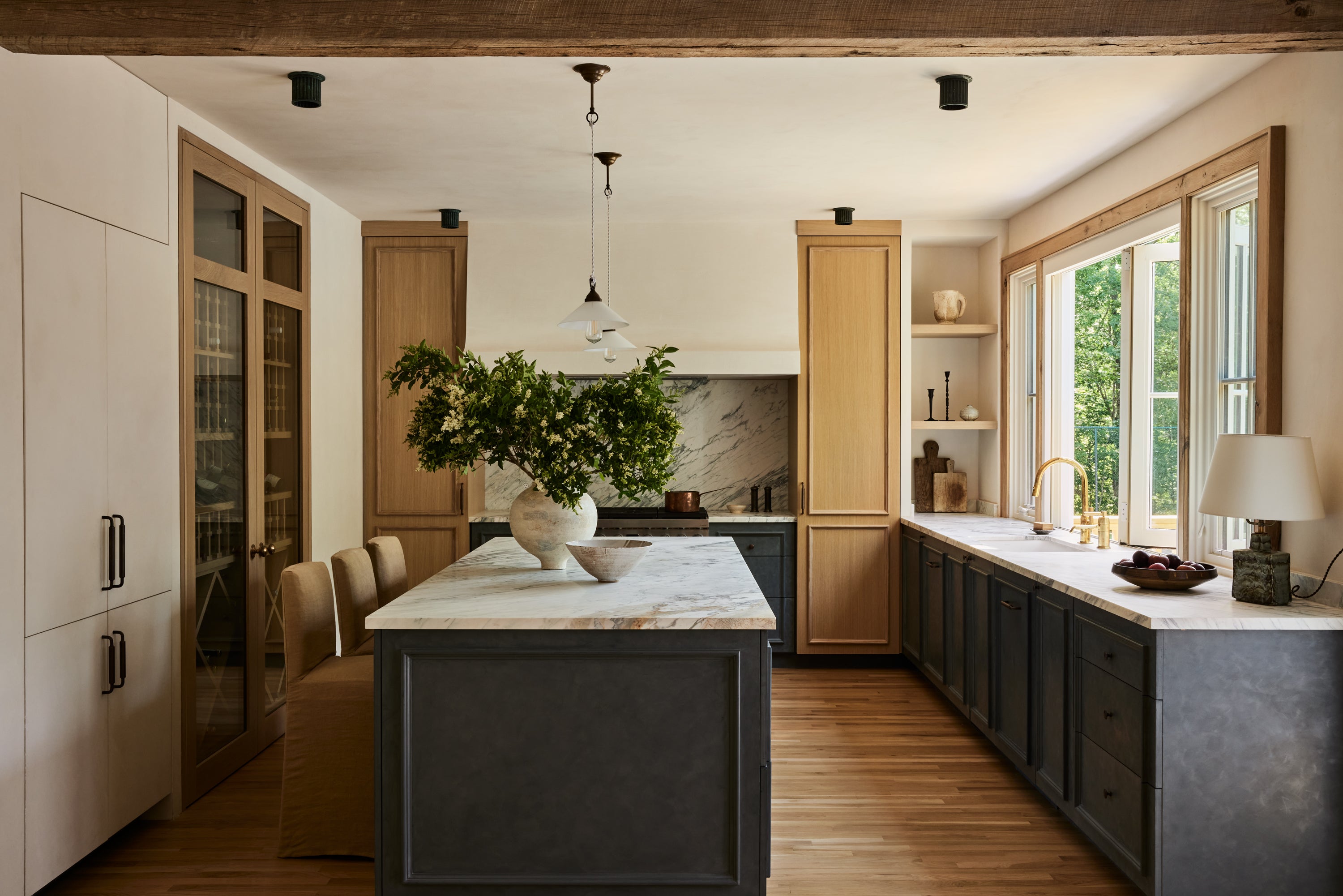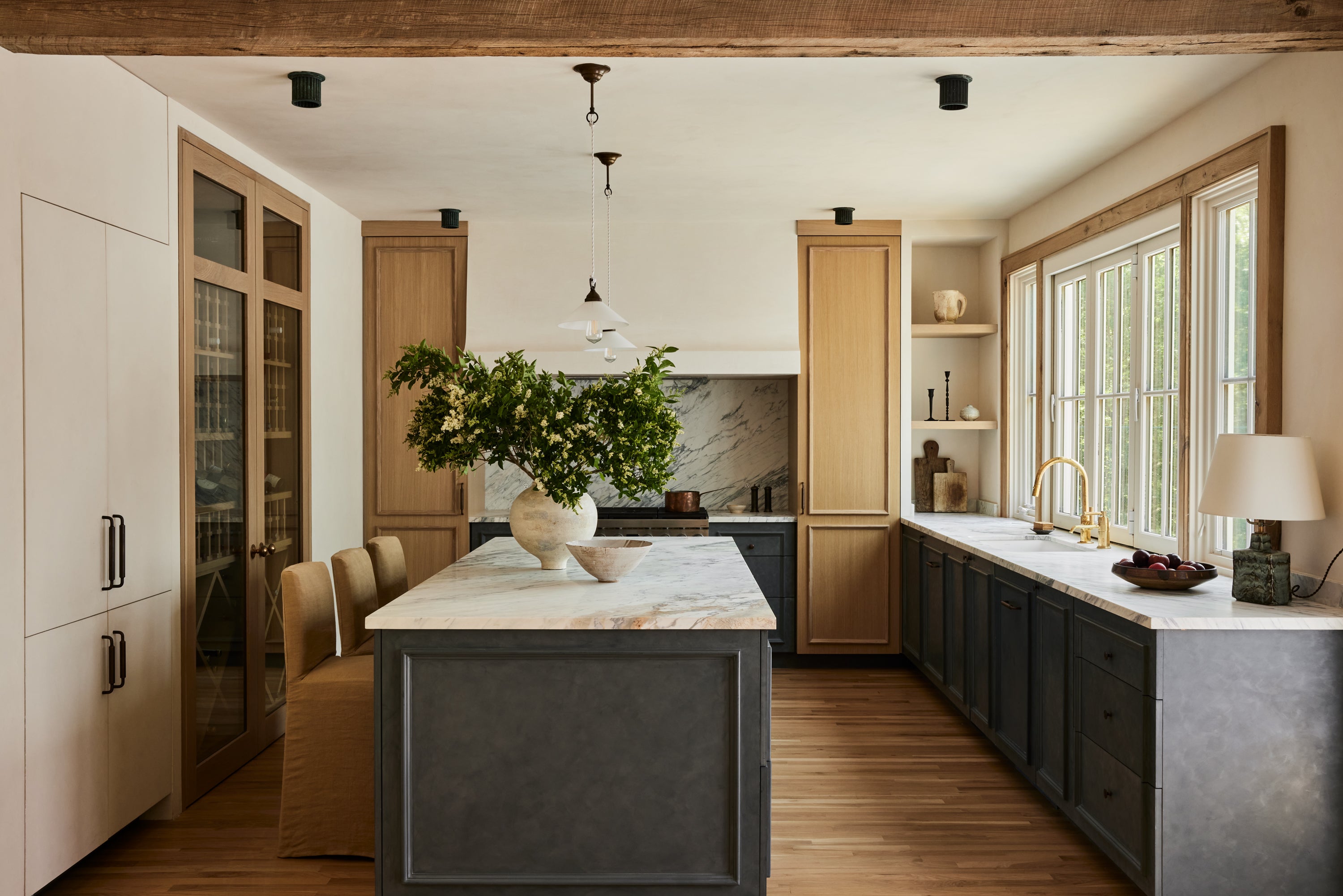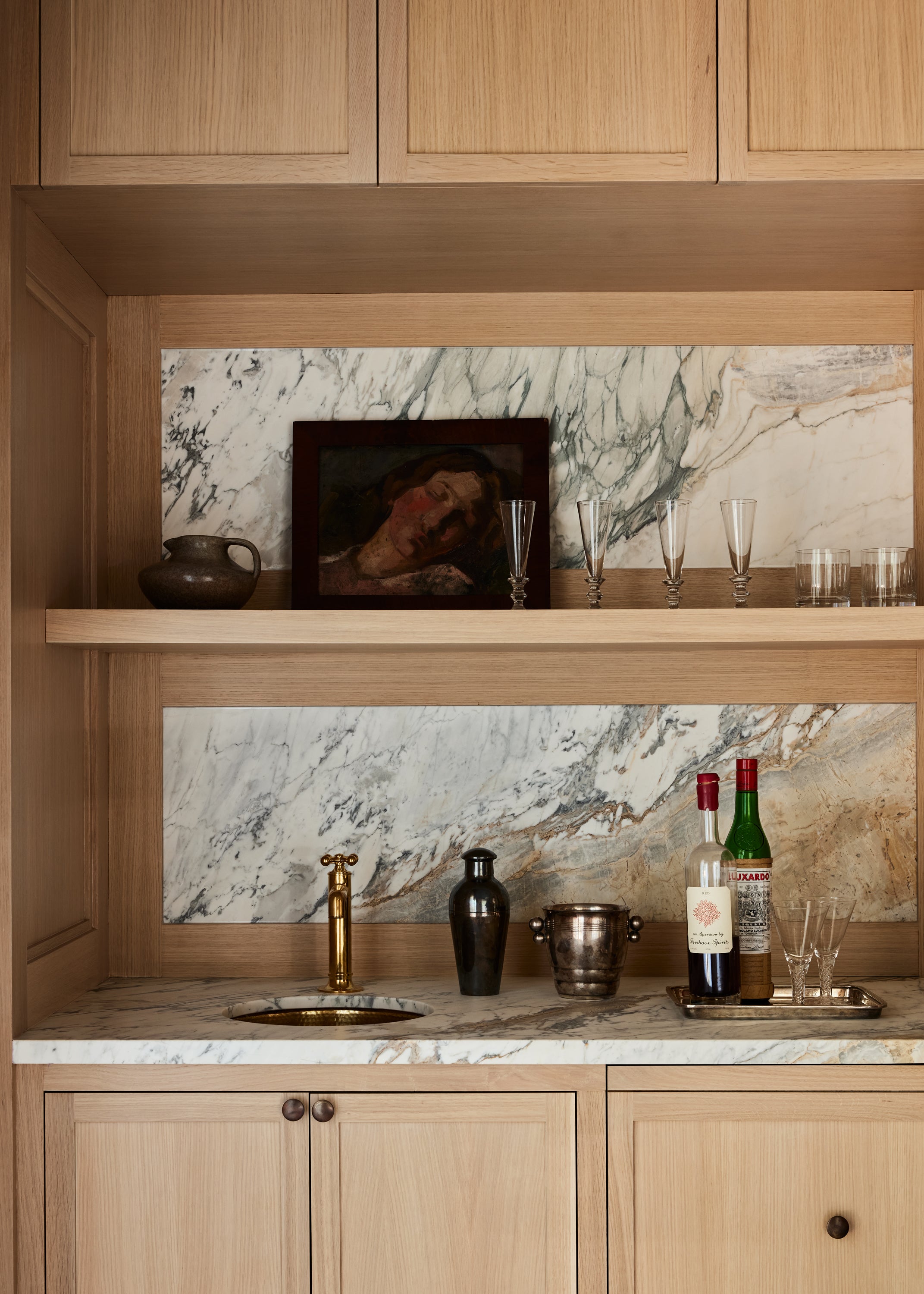 Some of the highlights are the antique oak french doors with original hardware to the bar room and the custom cabinetry throughout including an integrated wine cellar for my clients vast collection. My personal favourites are the mix of vintage and custom pieces like the 1950 s Italian sofa in the primary suite under a custom fixture covered in Zak Fox fabric or the custom designed limestone table in the bar room under a mid century French chandelier.