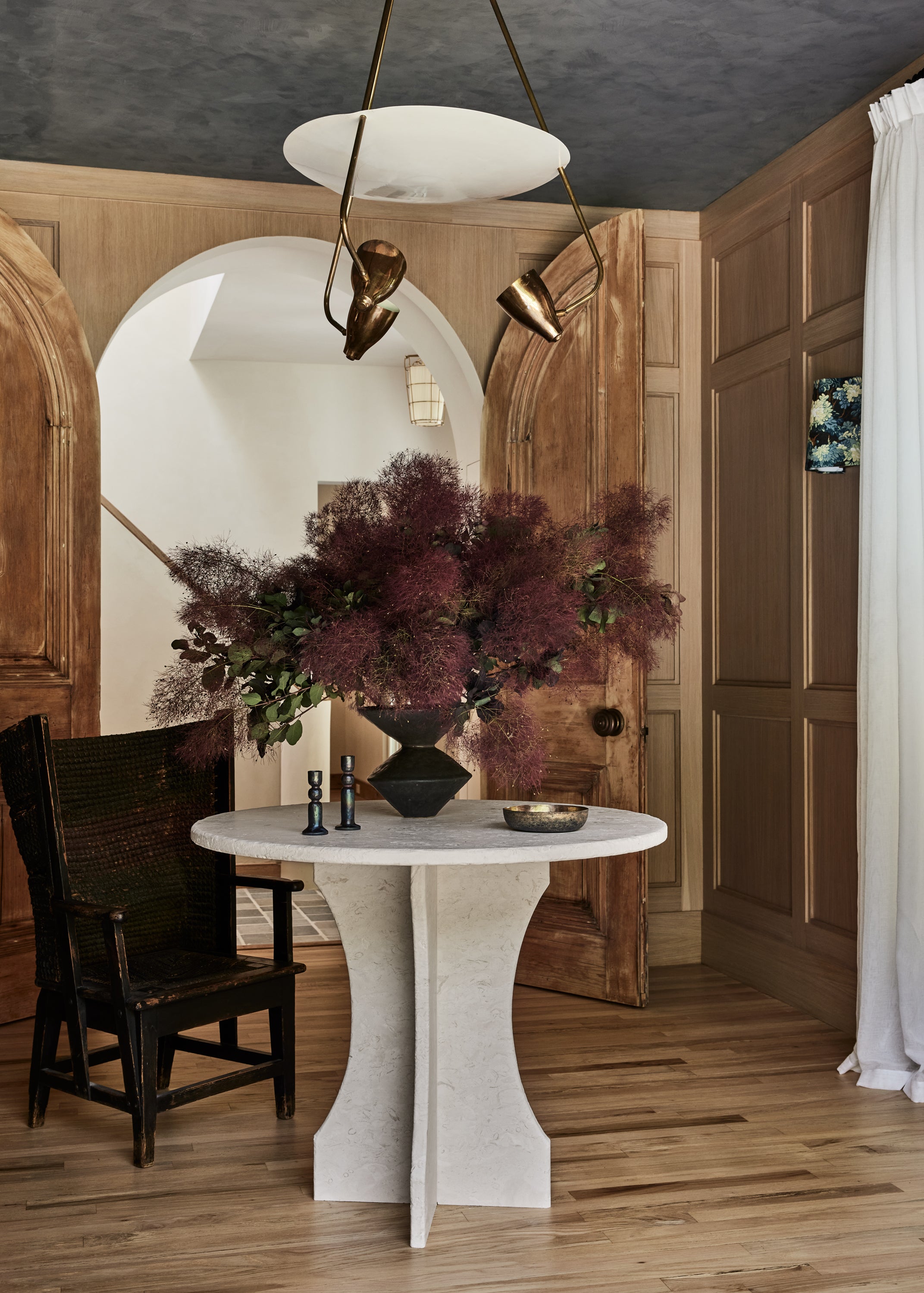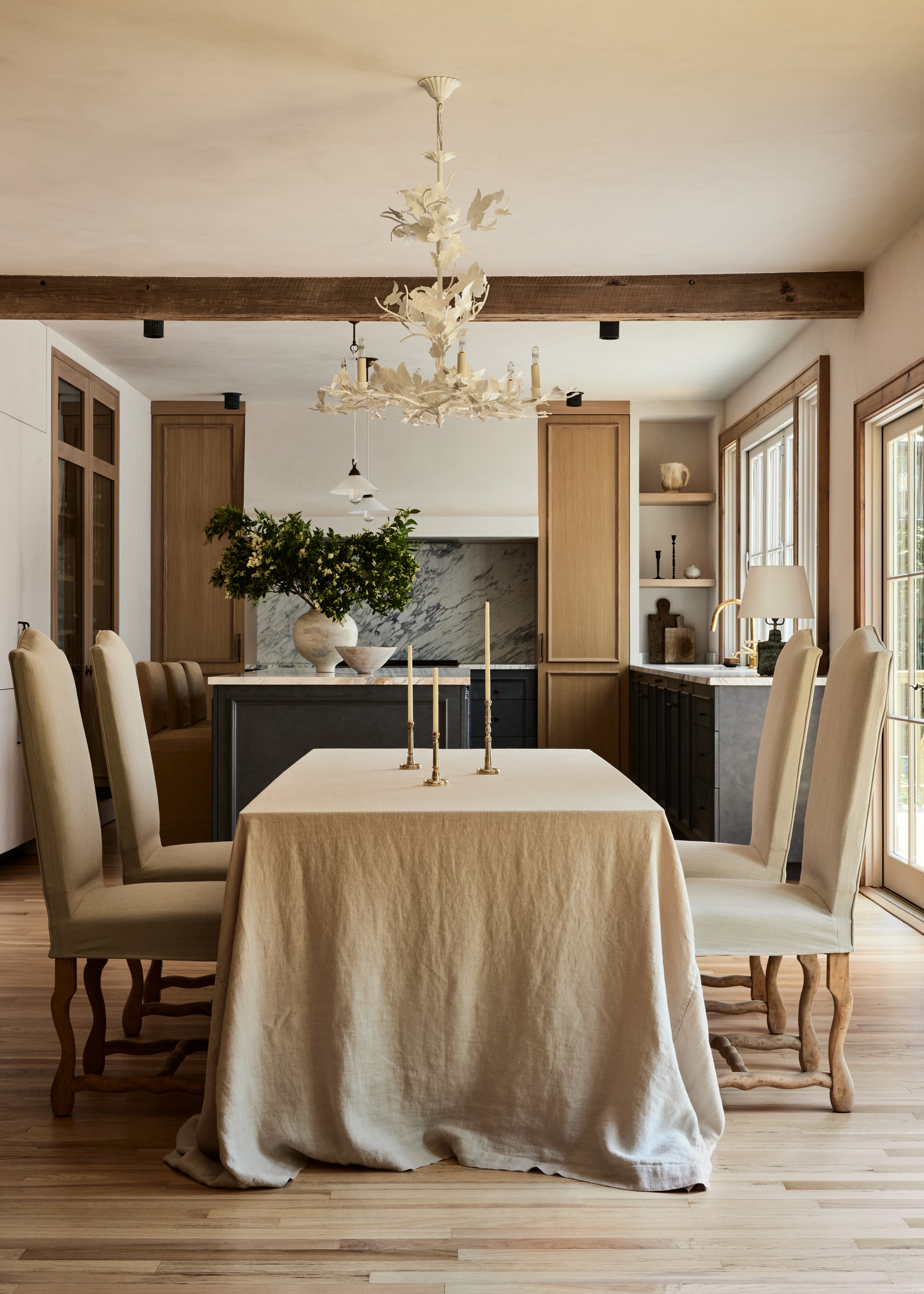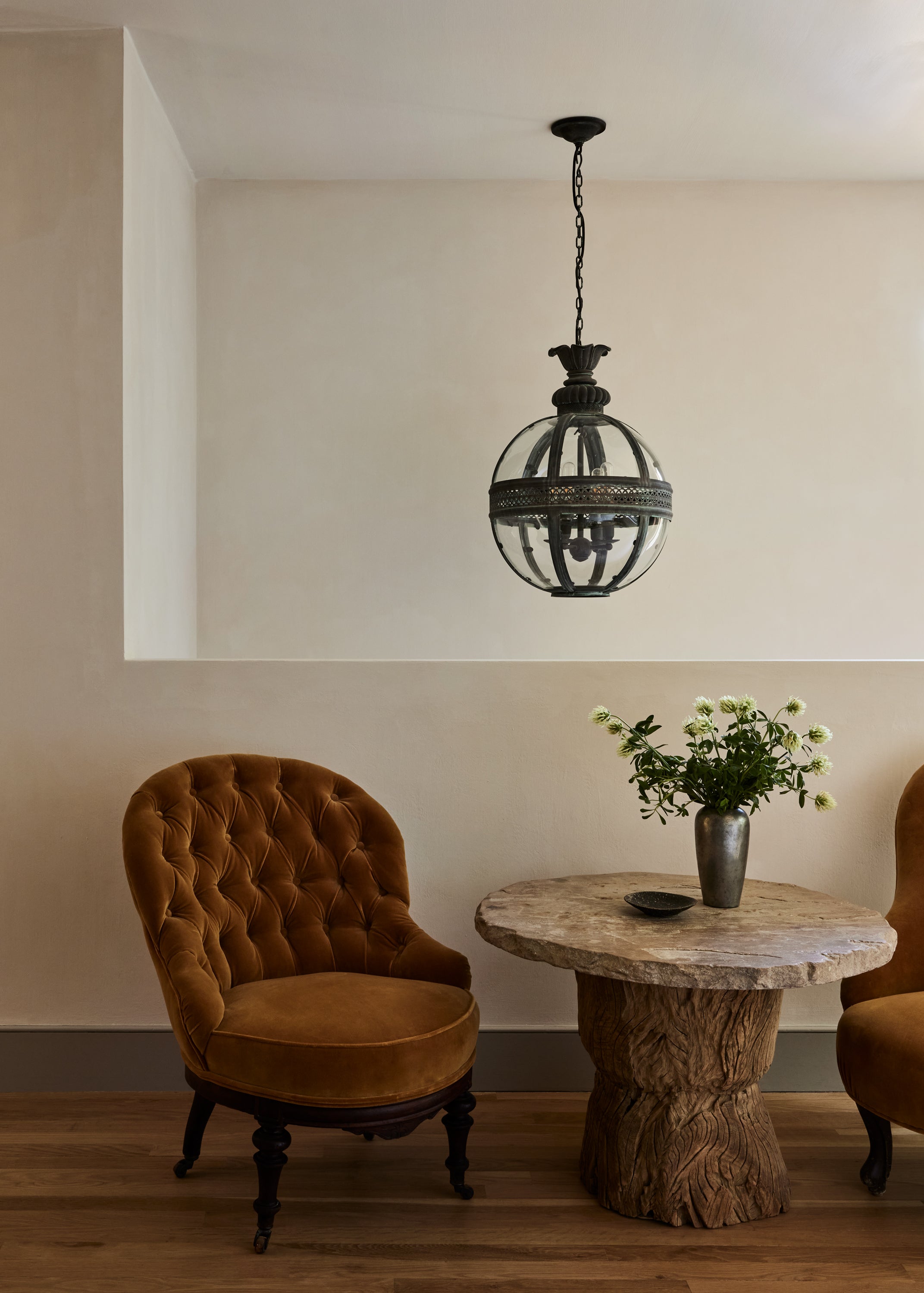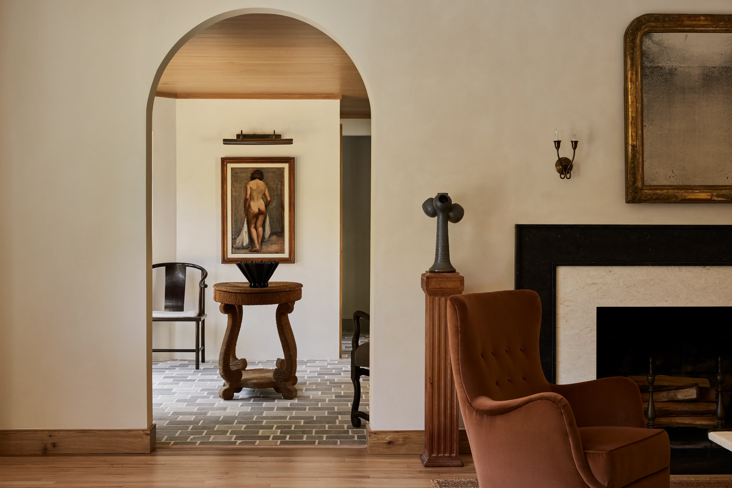 Some of the highlights are the antique oak french doors with original hardware to the bar room and the custom cabinetry throughout including an integrated wine cellar for my clients vast collection. My personal favourites are the mix of vintage and custom pieces like the 1950 s Italian sofa in the primary suite under a custom fixture covered in Zak Fox fabric or the custom designed limestone table in the bar room under a mid century French chandelier.