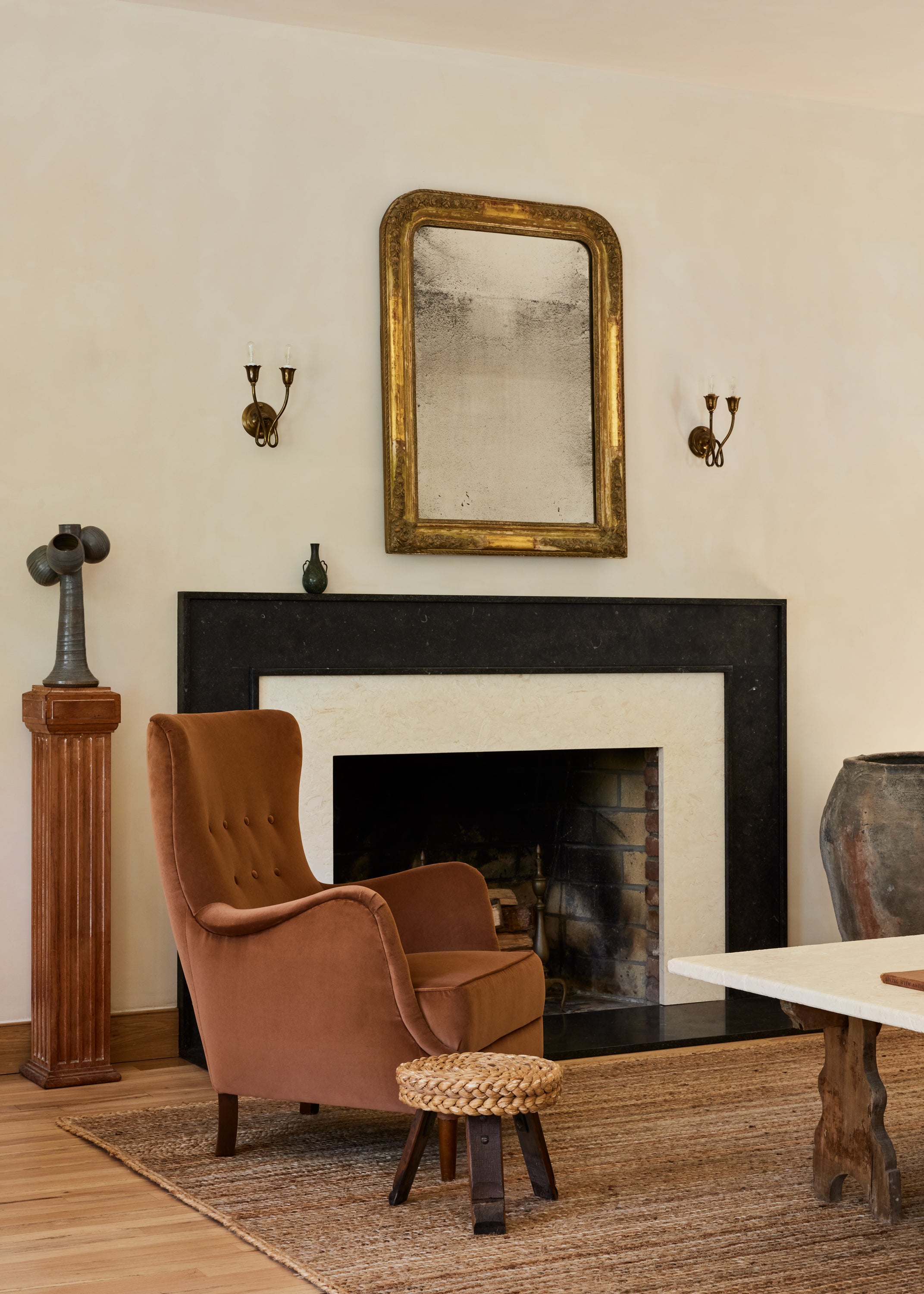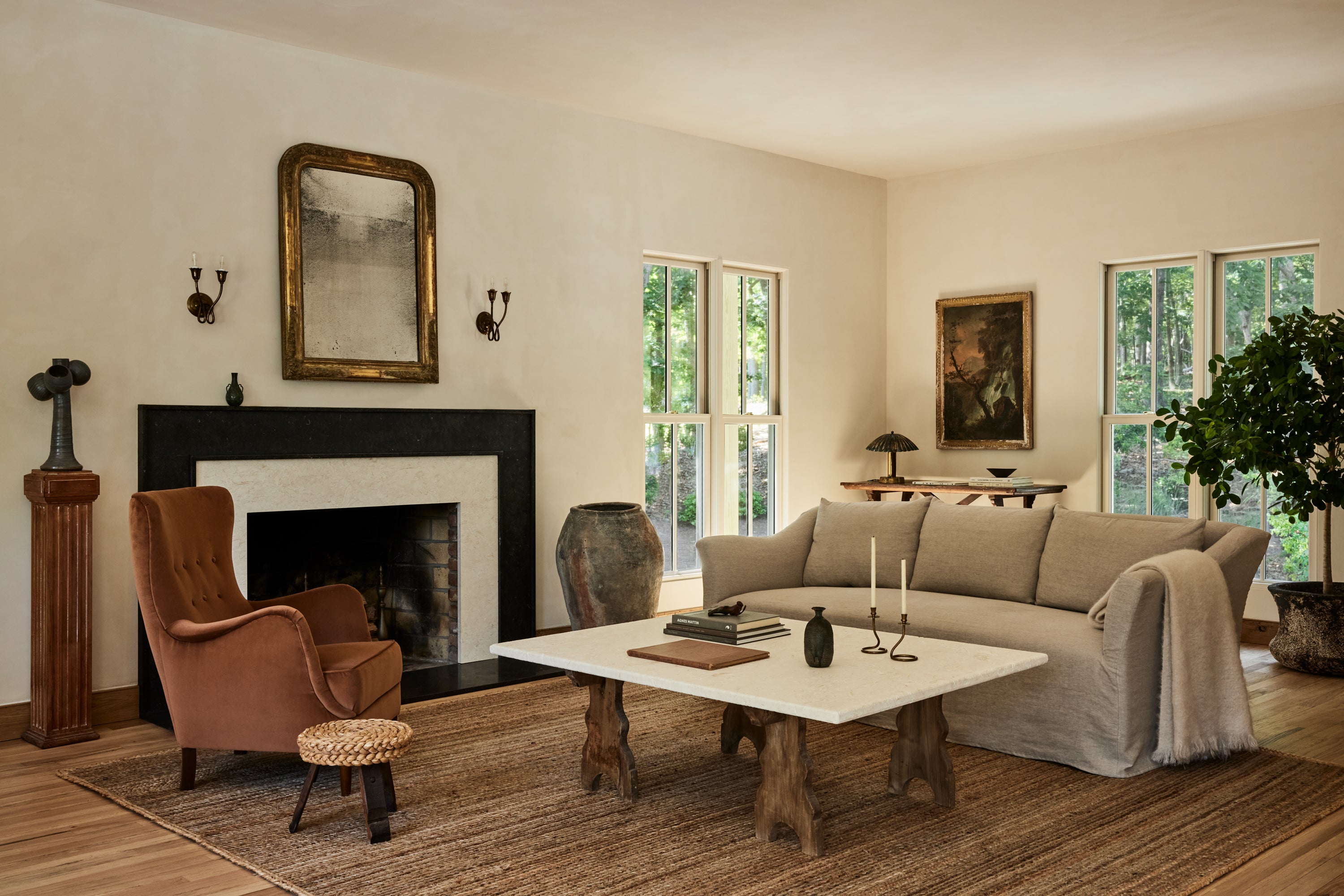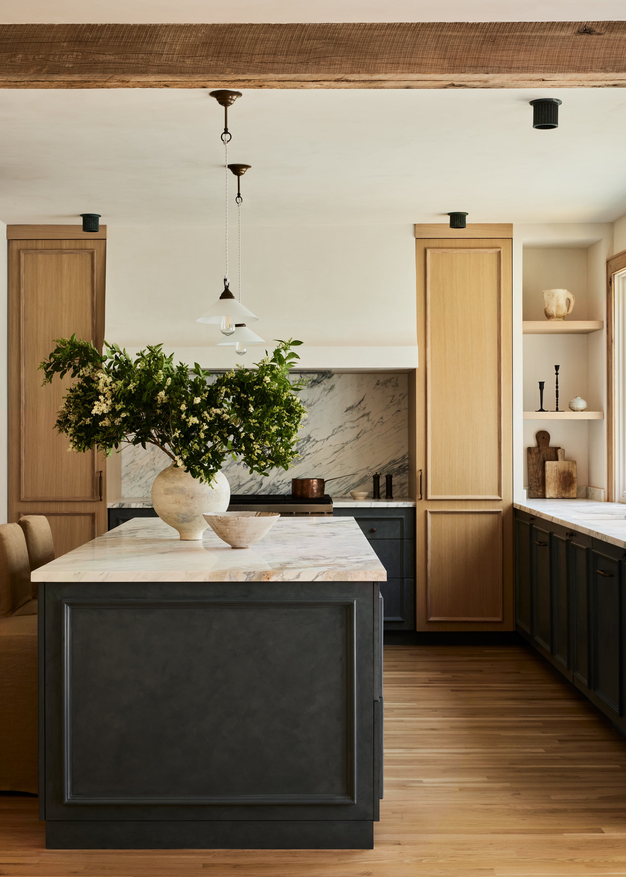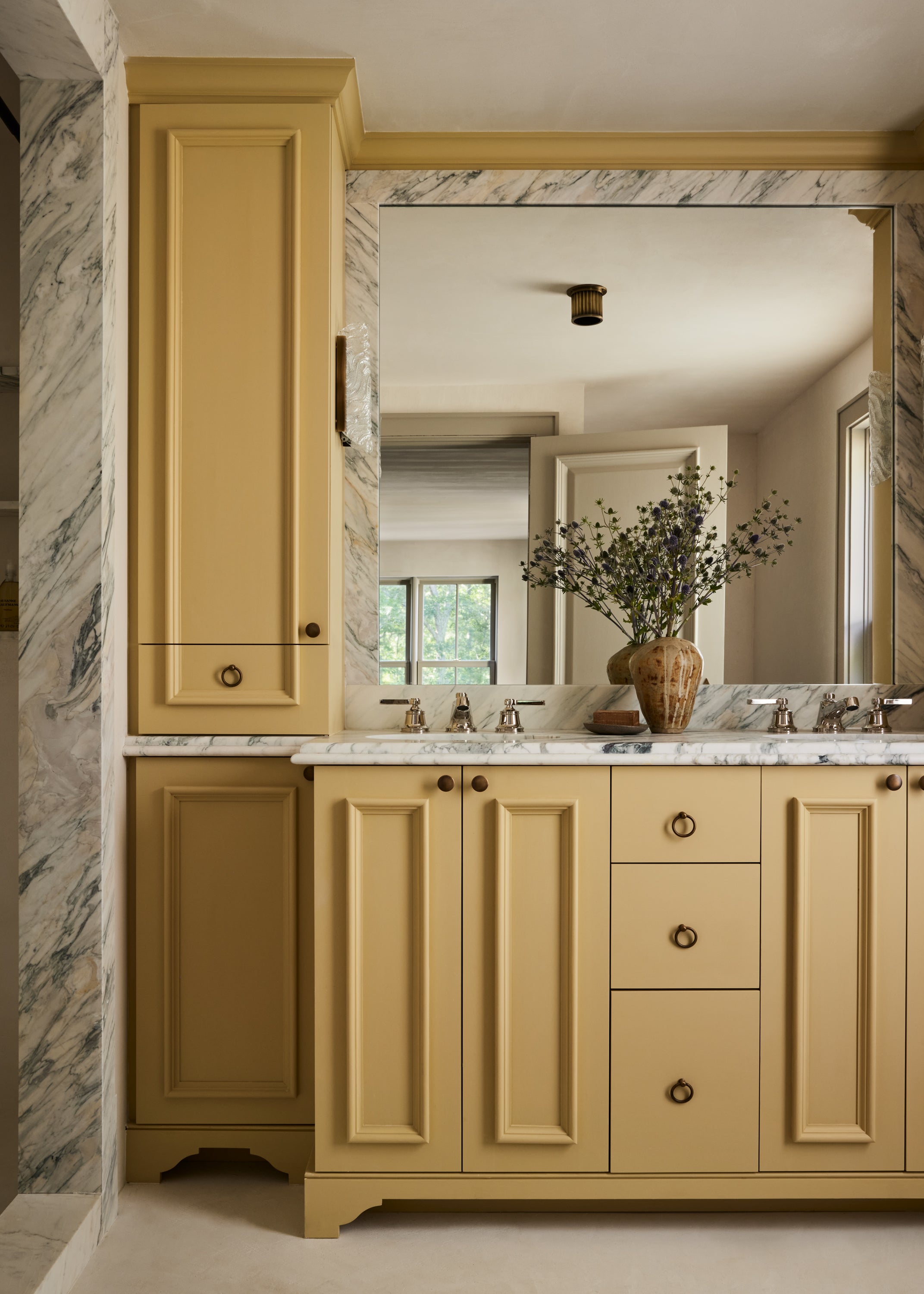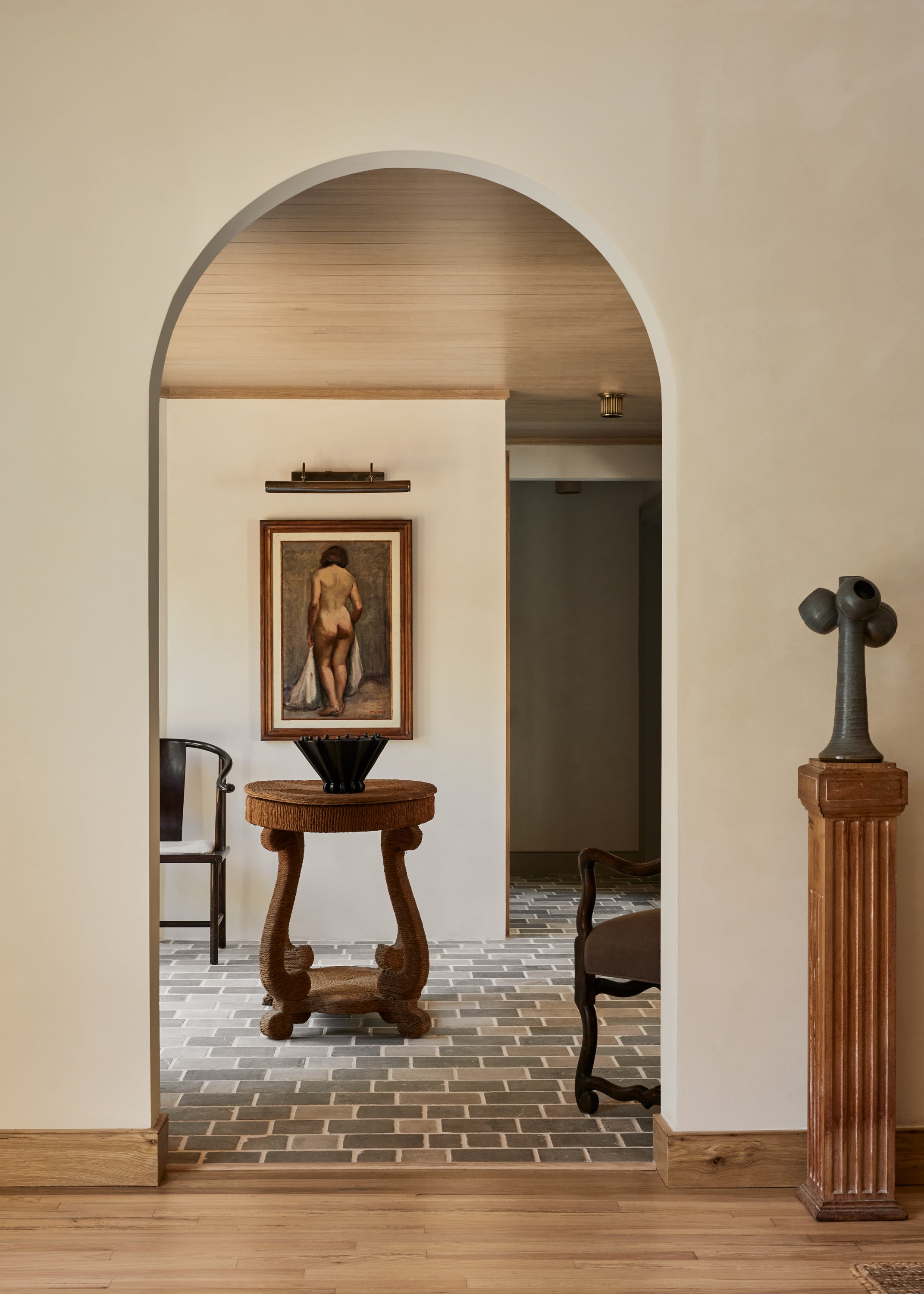 Some of the highlights are the antique oak french doors with original hardware to the bar room and the custom cabinetry throughout including an integrated wine cellar for my clients vast collection. My personal favourites are the mix of vintage and custom pieces like the 1950 s Italian sofa in the primary suite under a custom fixture covered in Zak Fox fabric or the custom designed limestone table in the bar room under a mid century French chandelier.