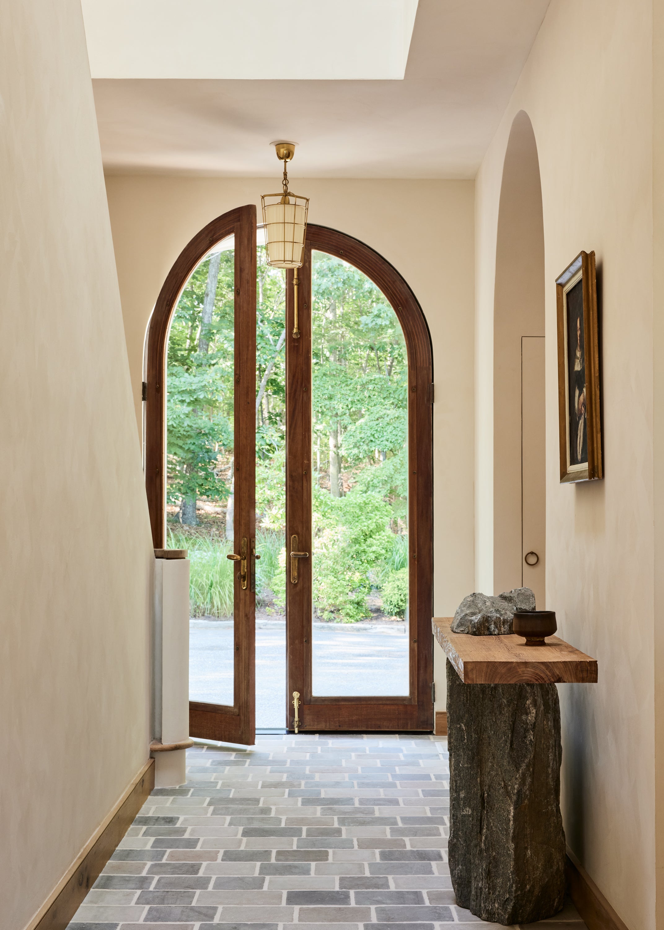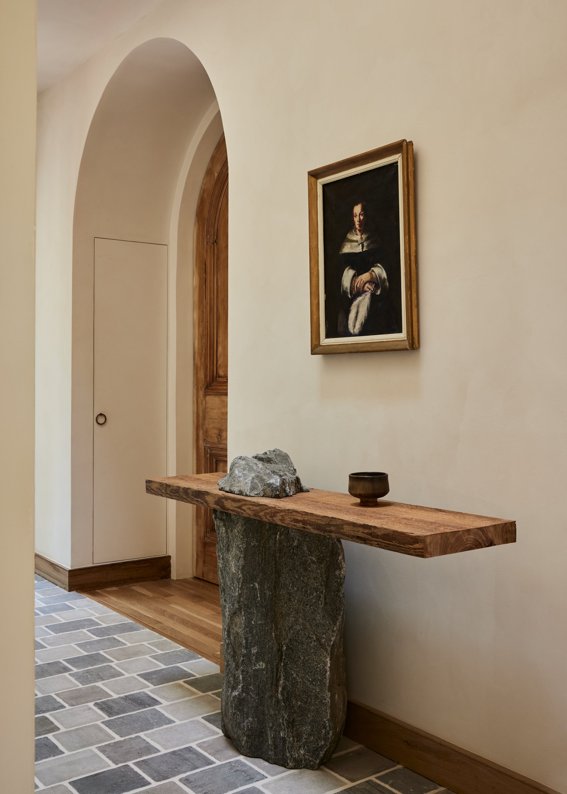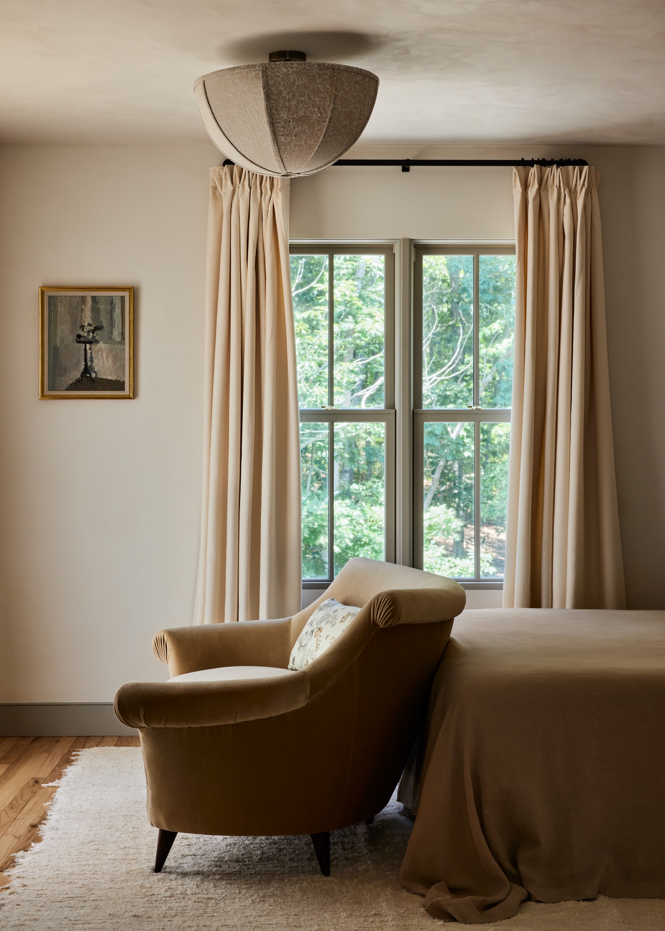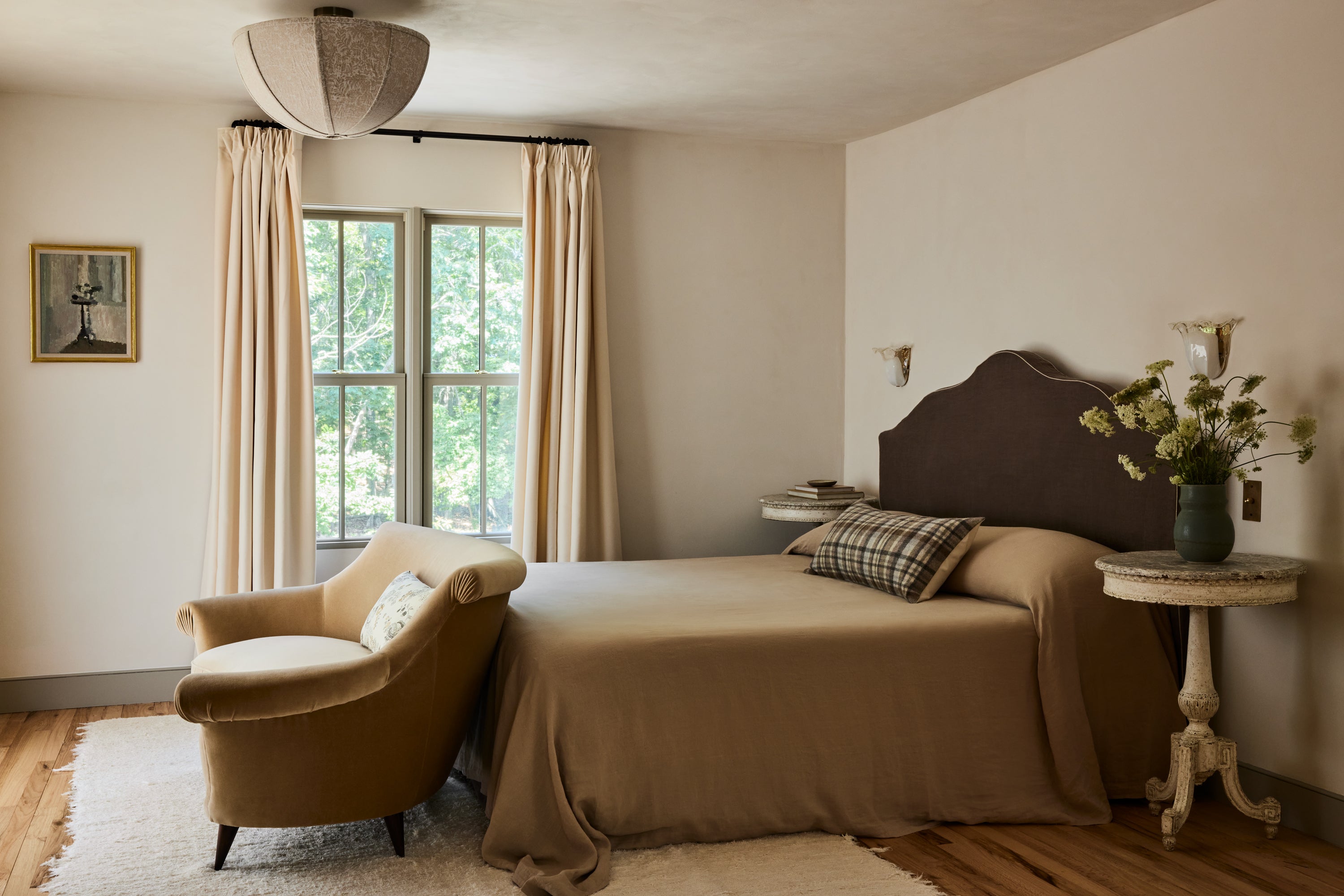 Some of the highlights are the antique oak french doors with original hardware to the bar room and the custom cabinetry throughout including an integrated wine cellar for my clients vast collection. My personal favourites are the mix of vintage and custom pieces like the 1950 s Italian sofa in the primary suite under a custom fixture covered in Zak Fox fabric or the custom designed limestone table in the bar room under a mid century French chandelier.