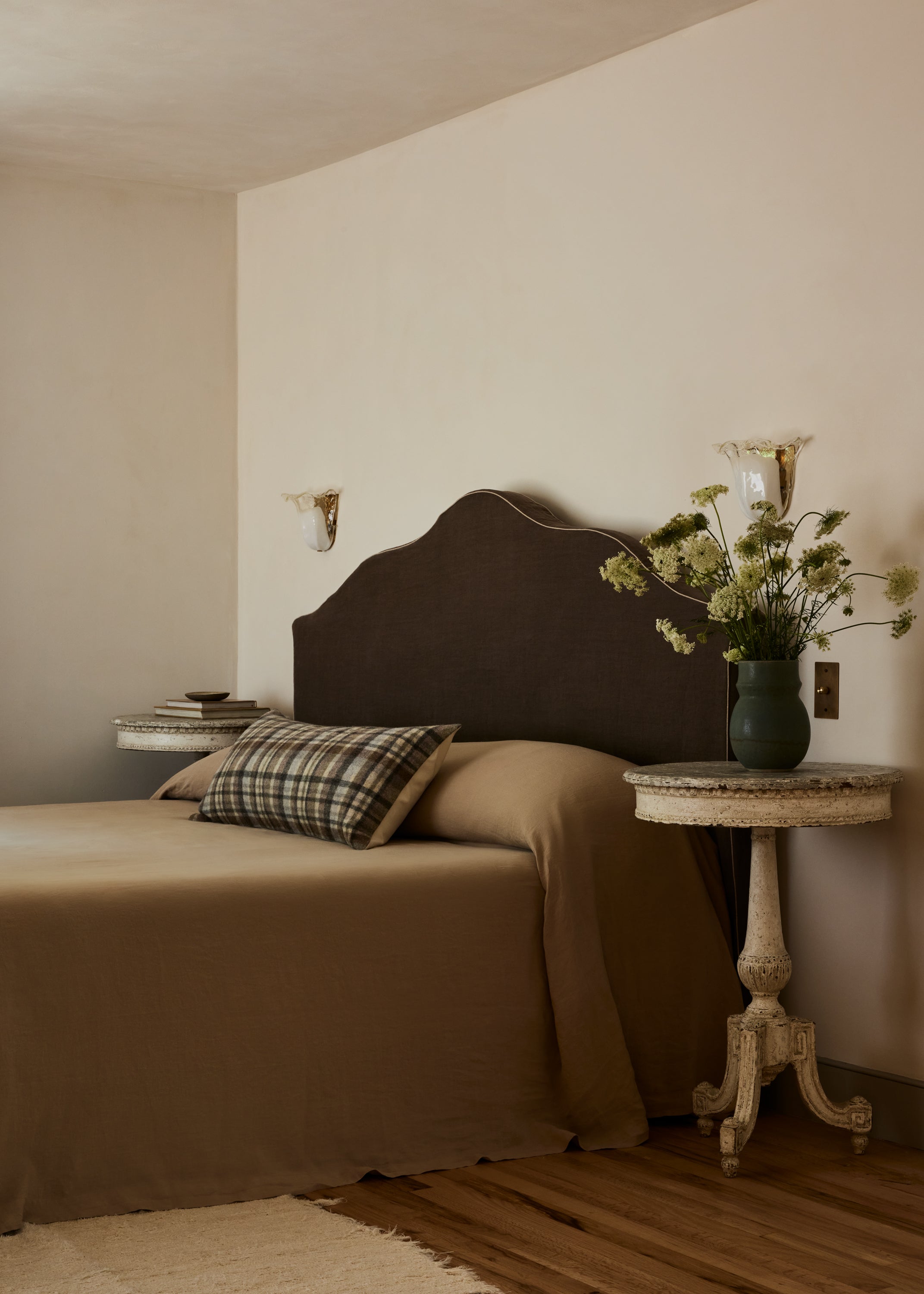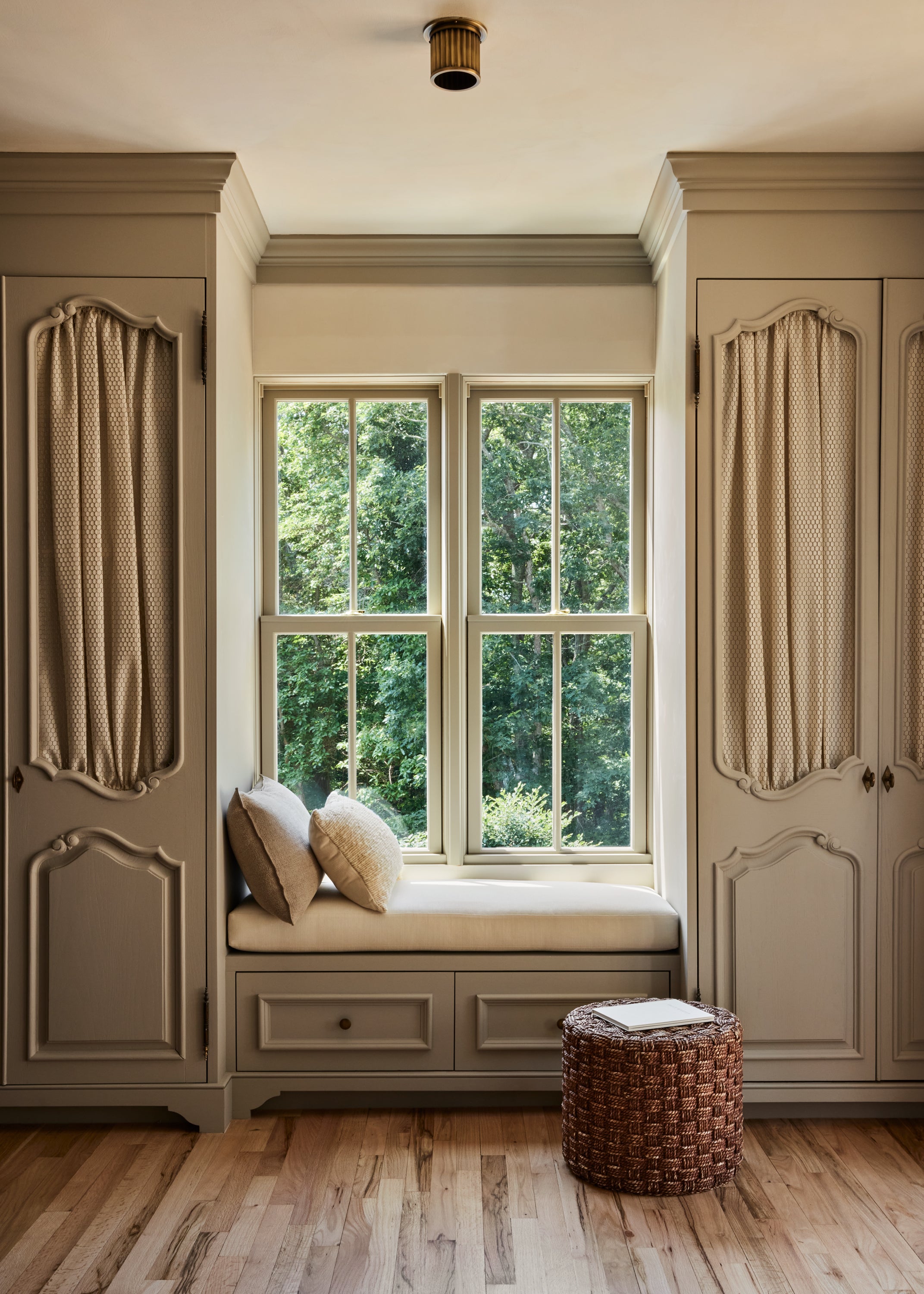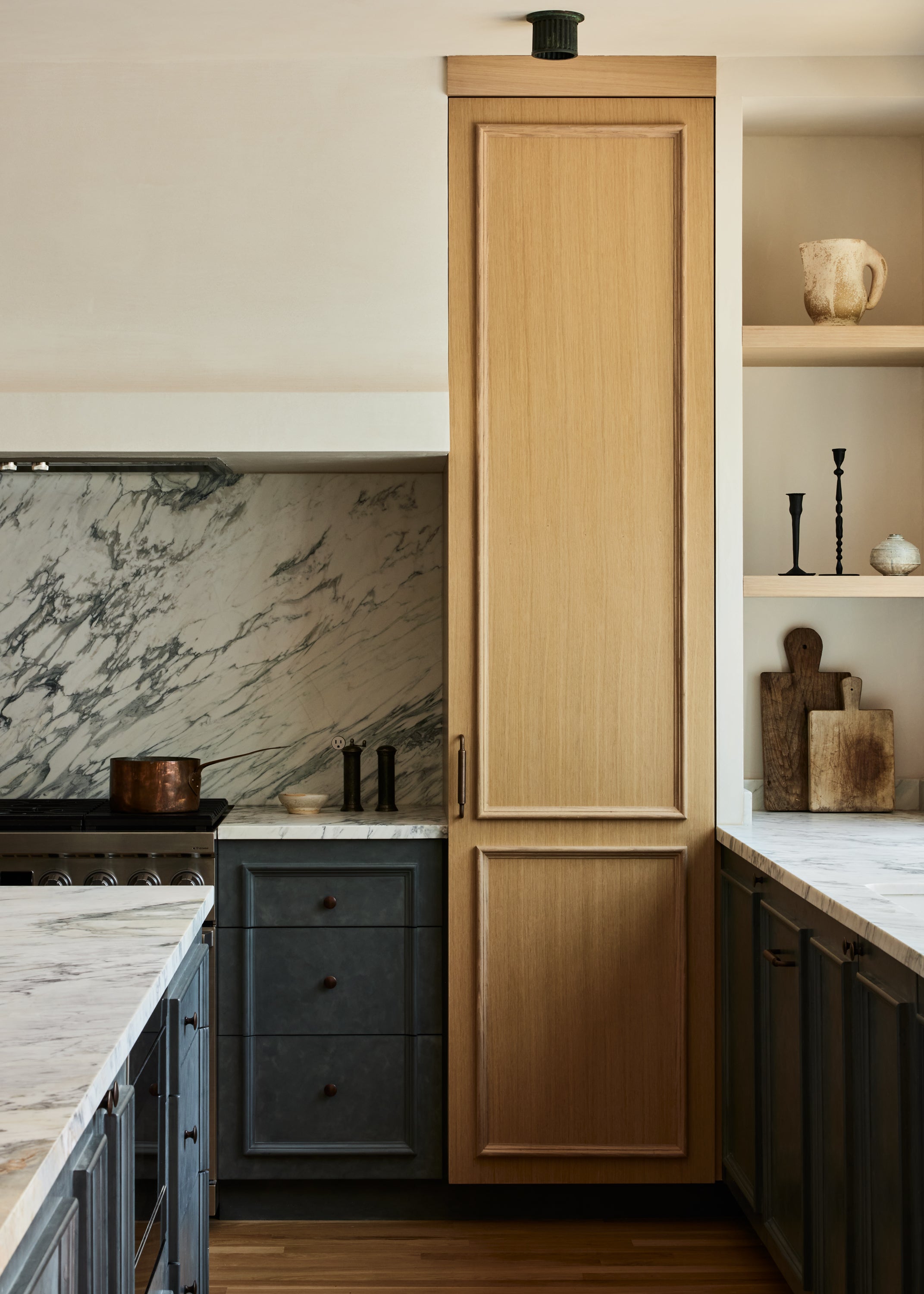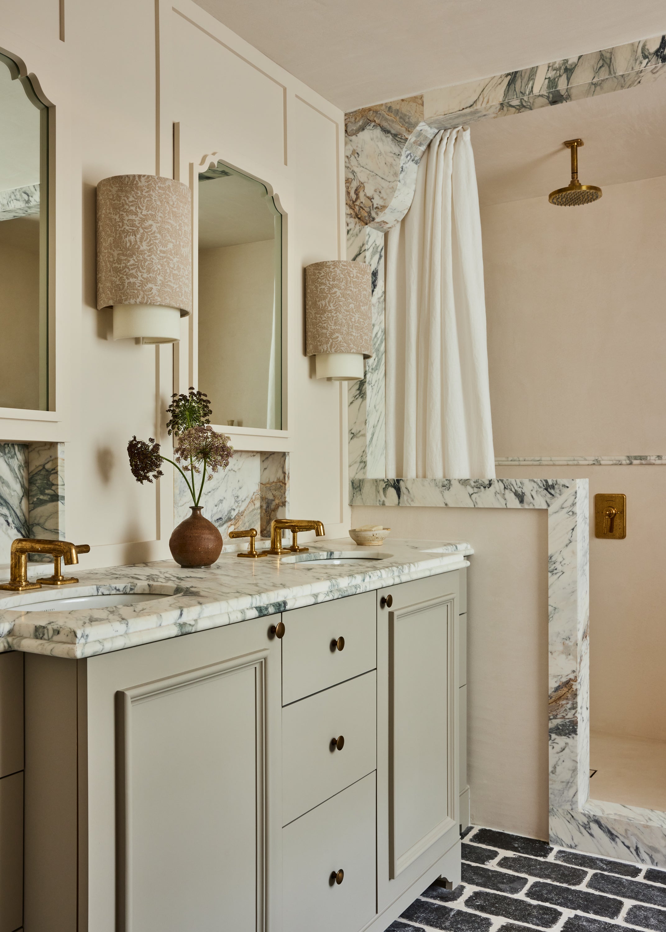 Some of the highlights are the antique oak french doors with original hardware to the bar room and the custom cabinetry throughout including an integrated wine cellar for my clients vast collection. My personal favourites are the mix of vintage and custom pieces like the 1950 s Italian sofa in the primary suite under a custom fixture covered in Zak Fox fabric or the custom designed limestone table in the bar room under a mid century French chandelier.