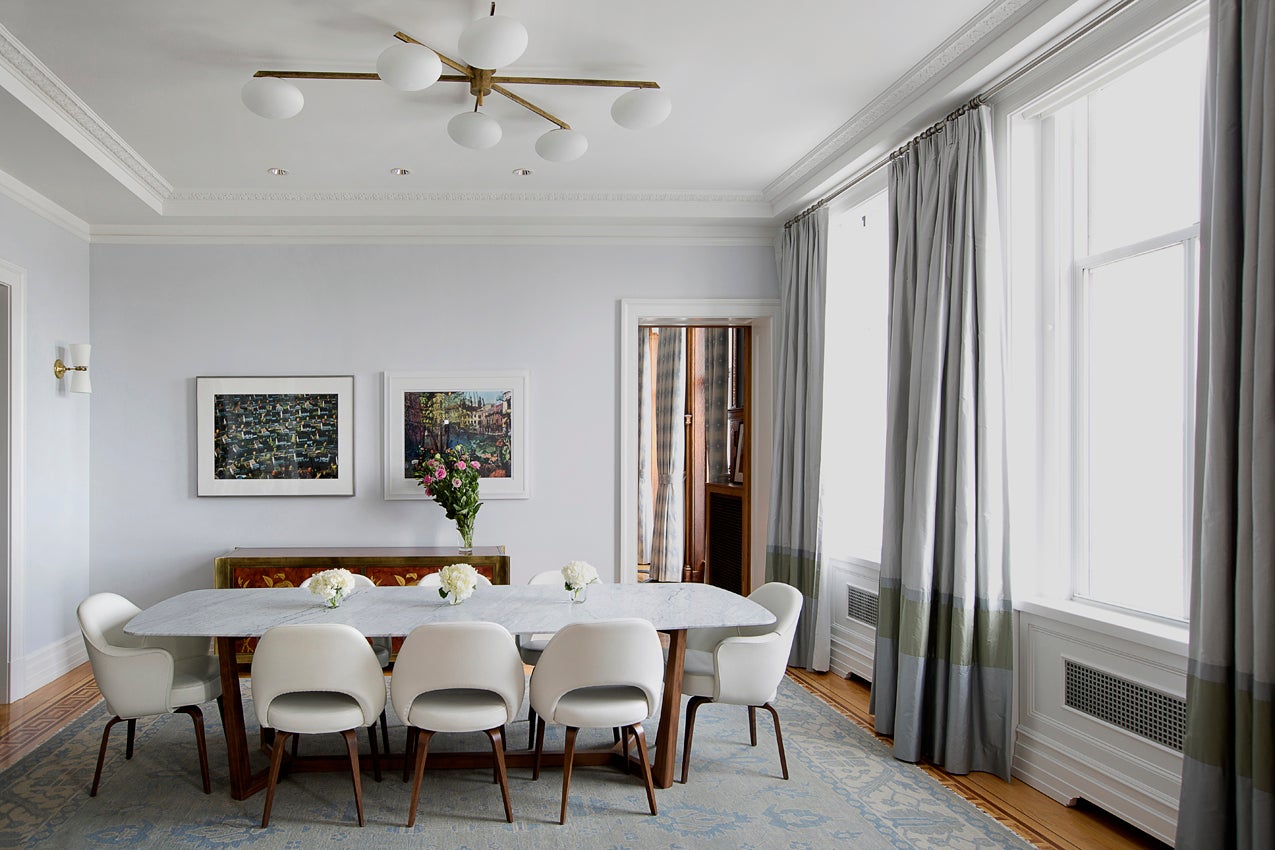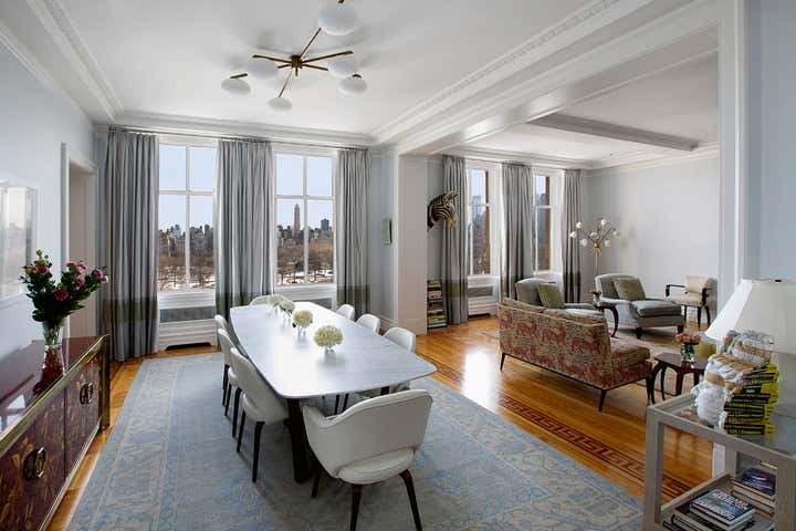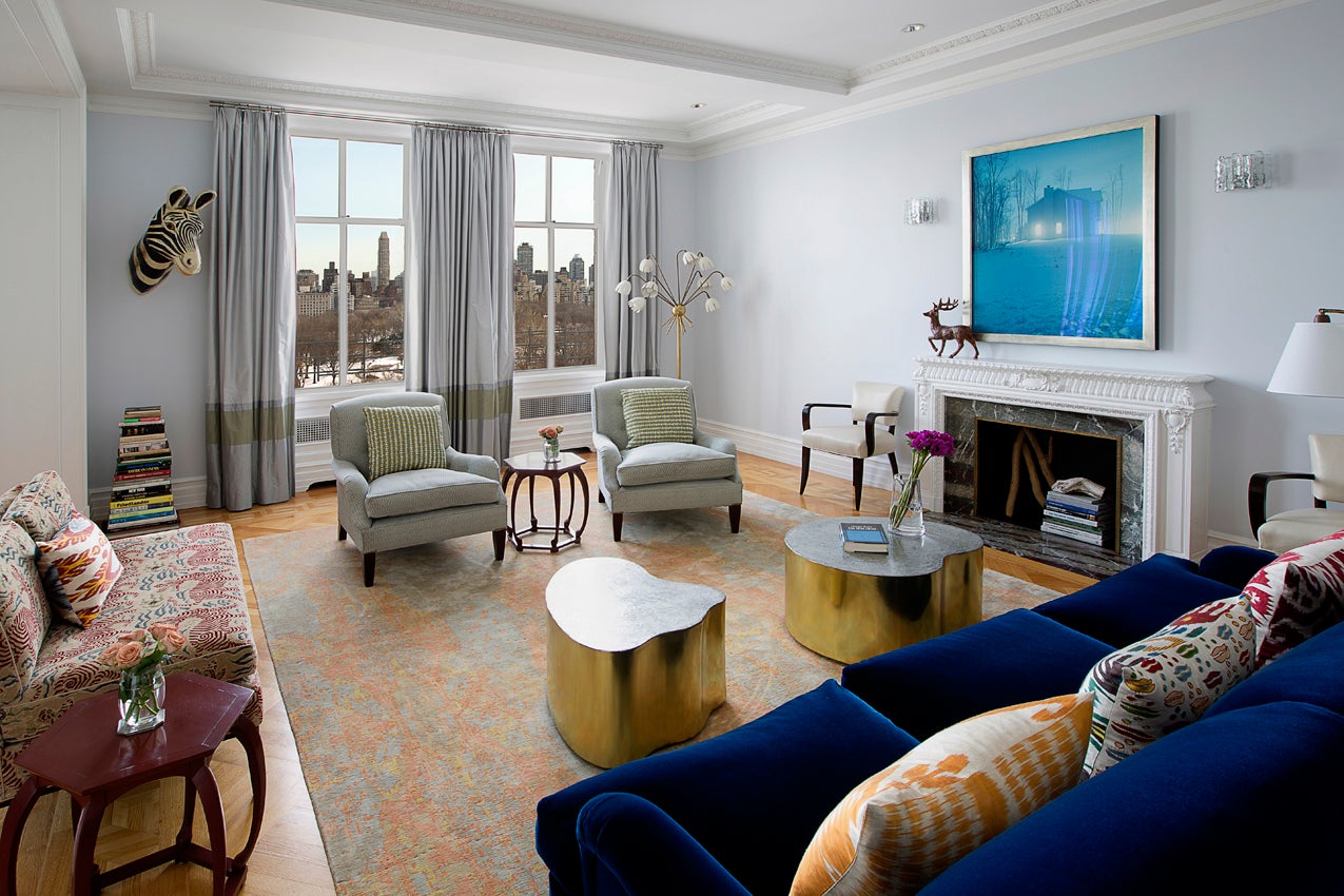 The clients decided to simplify their city life and move from their six-story townhouse to a four-bedroom rental apartment at Manhattan’s storied Langham residence, they wanted to make everything easier—horizontal, with a doorman. We definitely wanted the view and the landscape to have an opportunity to come into the space. We love pattern and color, but we like to use it against a backdrop of calmness.
