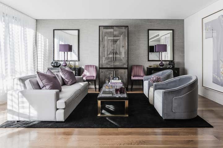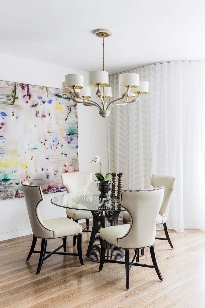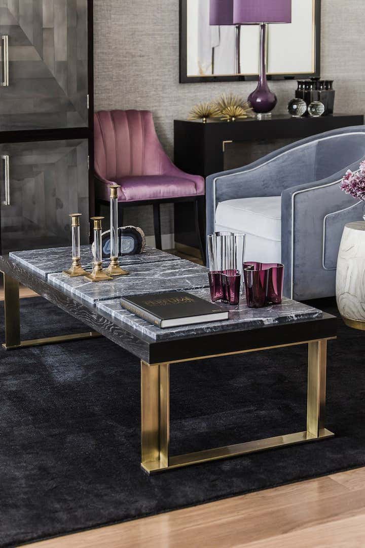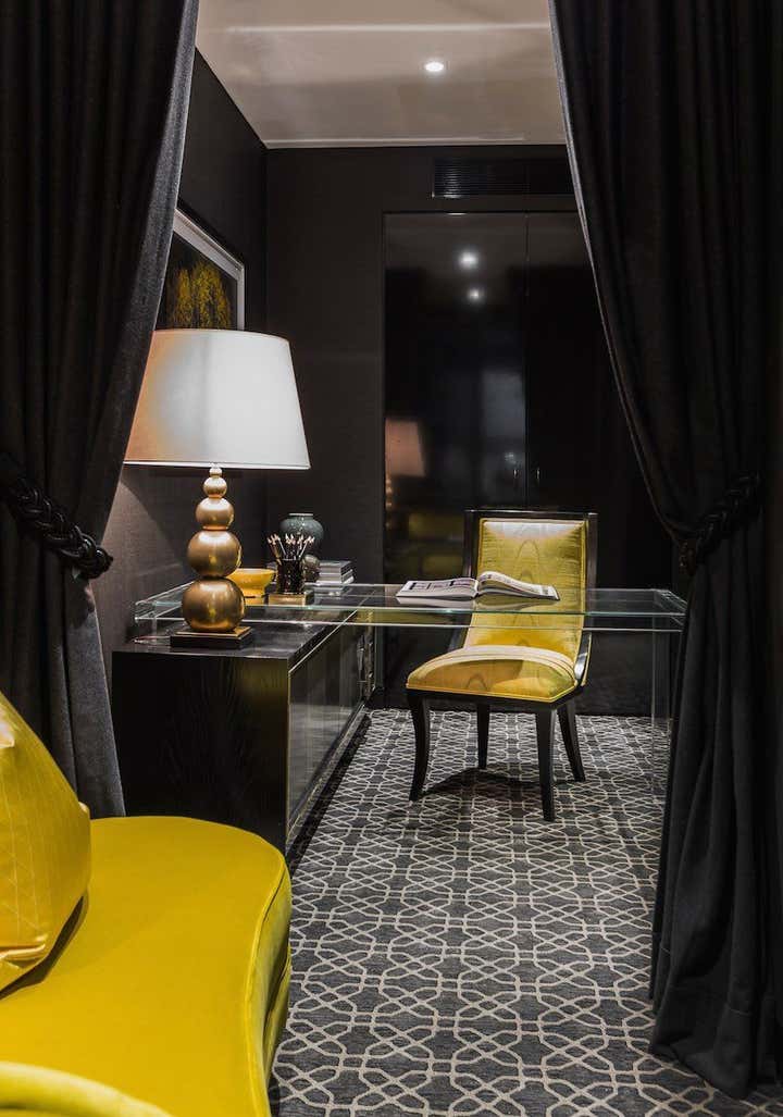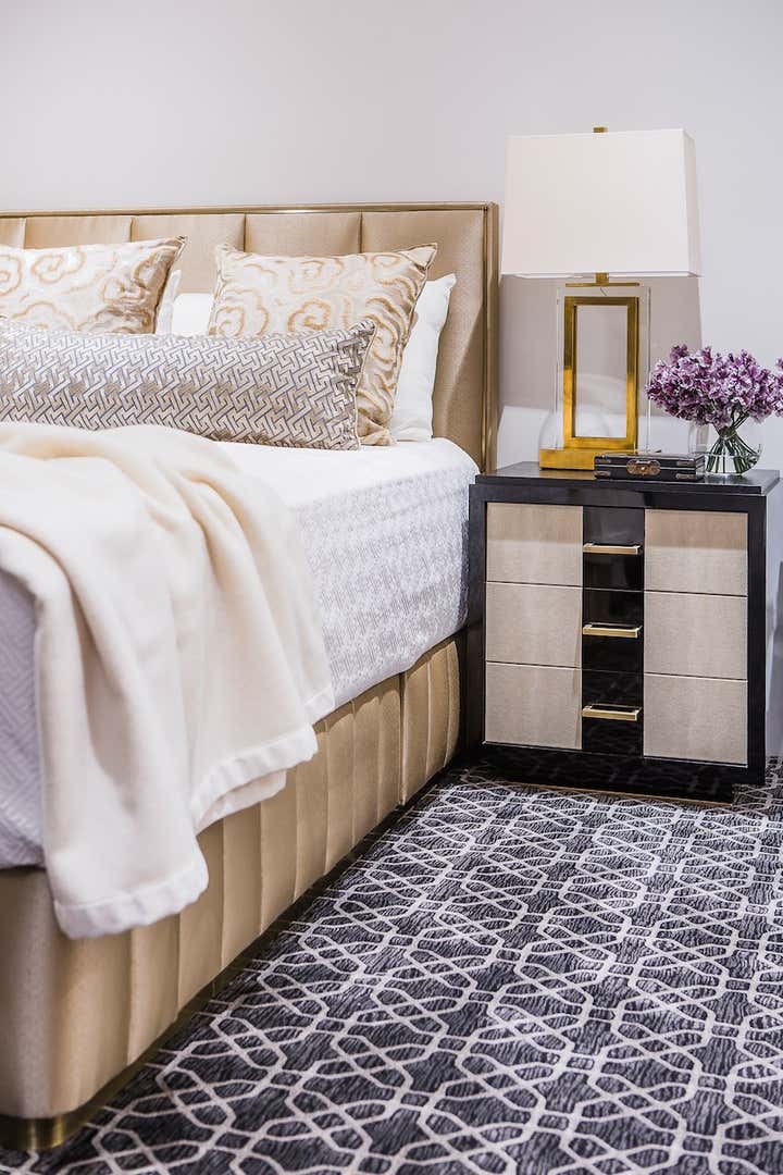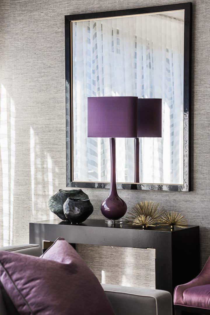 Designed as a serene oasis in which to work, relax and recharge. The symmetrical living space includes muted tones with brass highlights. Furniture was custom designed including the bold credenza and transparent desk in the study.