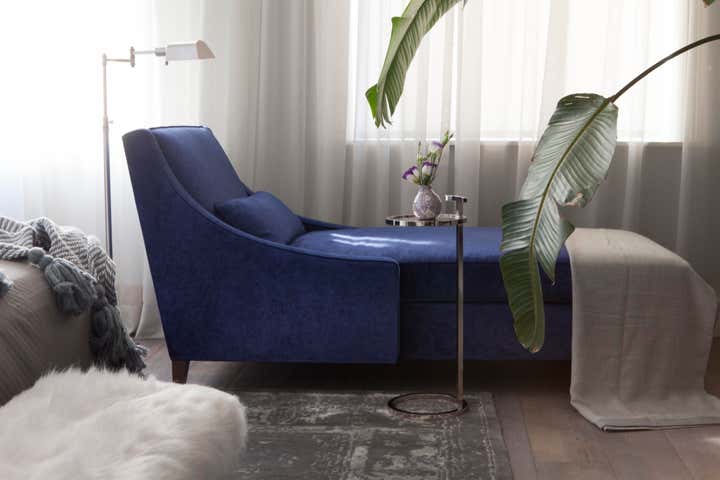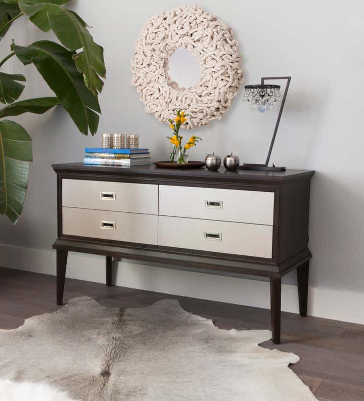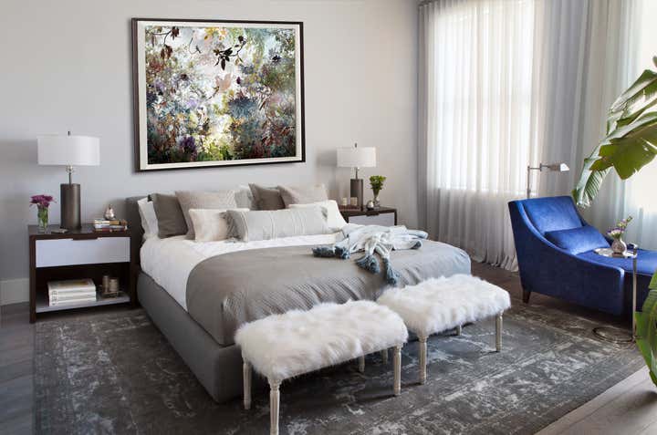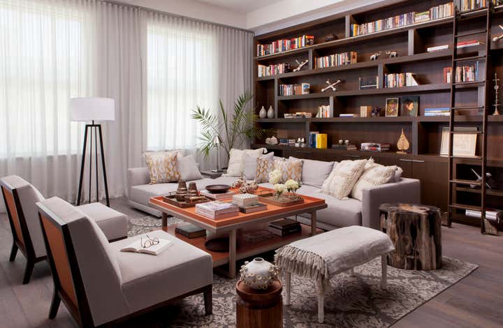 In the dining room, linear glass pendant lighting, leather side chairs and a pair of origami head chairs add to the modern, eclectic mood. A warm orange color way boldly accents the living room table and chairs, complemented by petrified wood side tables and a bespoke oak built-in complete with rolling library ladder. In the master bedroom, the charcoal color palette with nickel and cream accents sets off a lush navy velvet chaise lounge. A guest bedroom doubles as a mod lounge area, where we carried through the gray and cream palette, accented by a trio of turned walnut tables, brass lamps and a cowhide rug. These pieces work together to create a charismatic space that feels warm and layered.