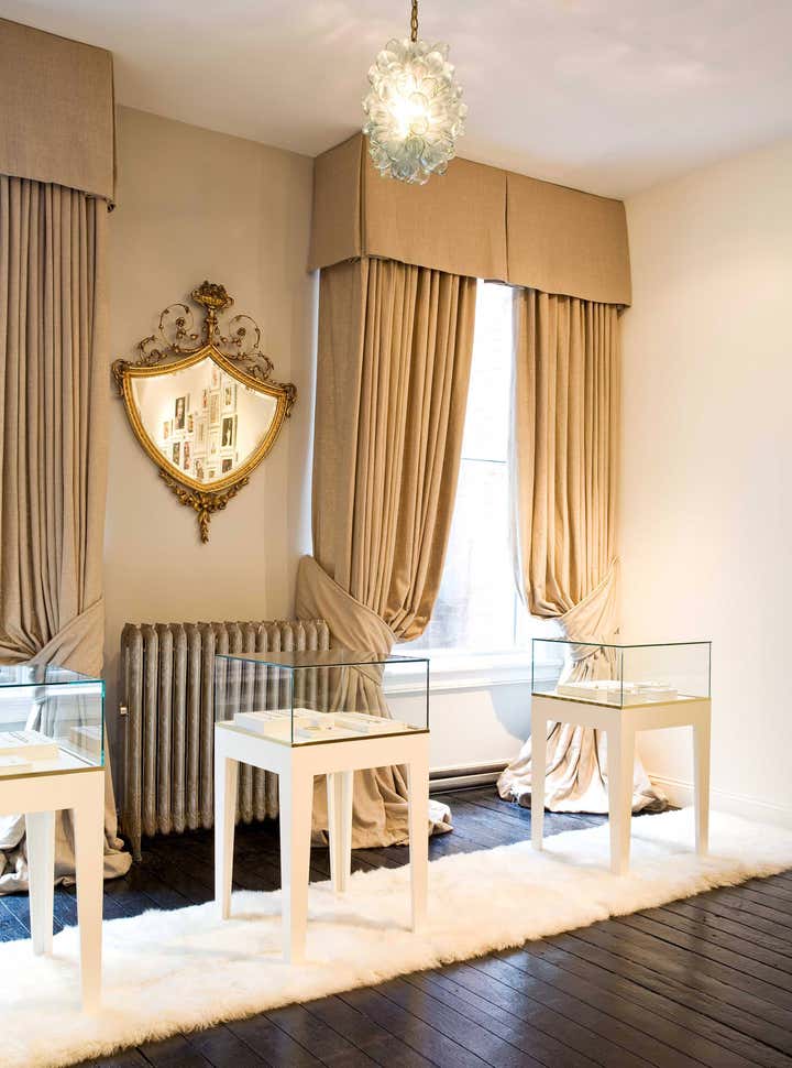 The Finn Jewelry showroom was envisioned by Nicole Fuller Interiors out of a dark, empty industrial loft on Great Jones Street in the trendy downtown NoHo neighborhood. As a brand, Finn embodies youthful luxury by fashioning whimsical designs out of serious precious materials. Fuller designed a mixed use space that fits this aesthetic by combining French-inspired finishes with modern elements against the structural backdrop of a cool New York loft. The result is a hip and luxurious shopping environment suitable for their celebrity clientele.