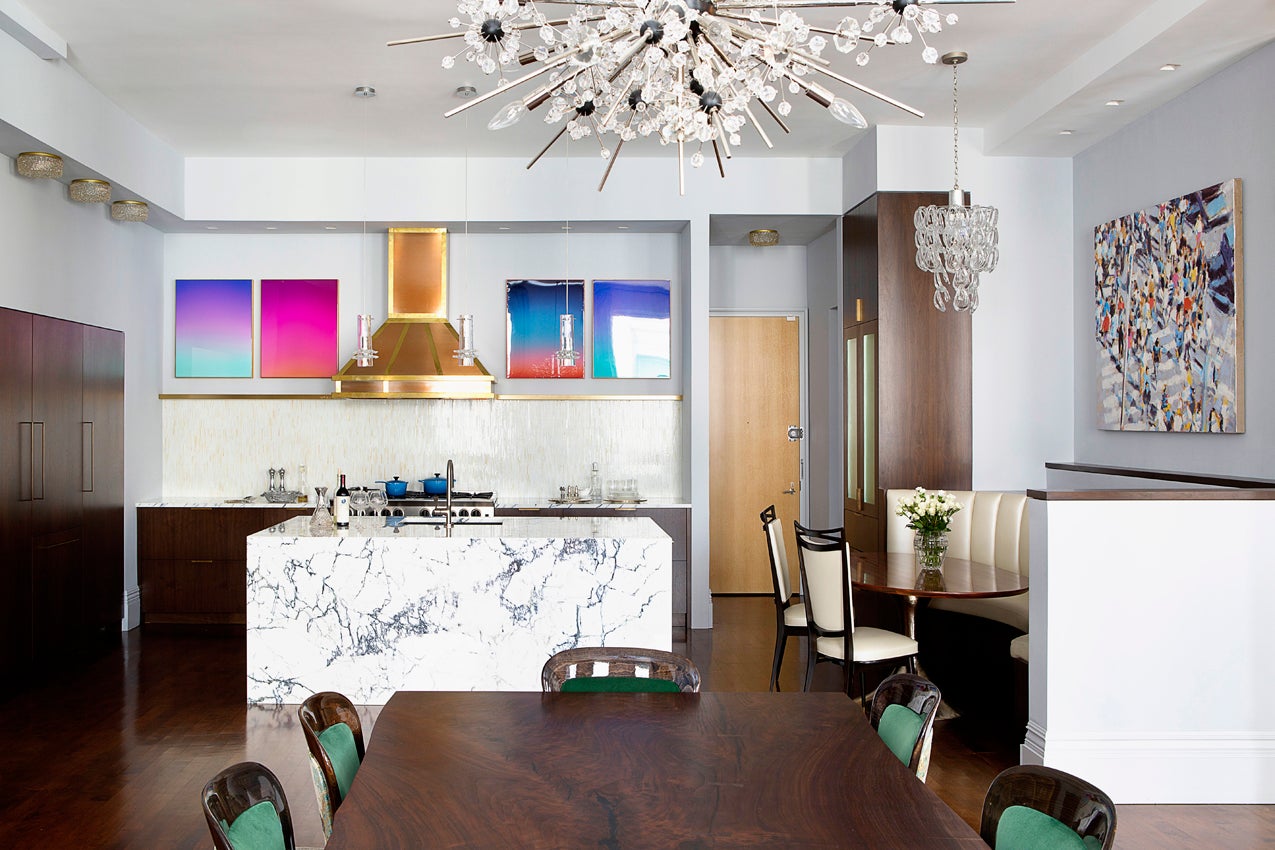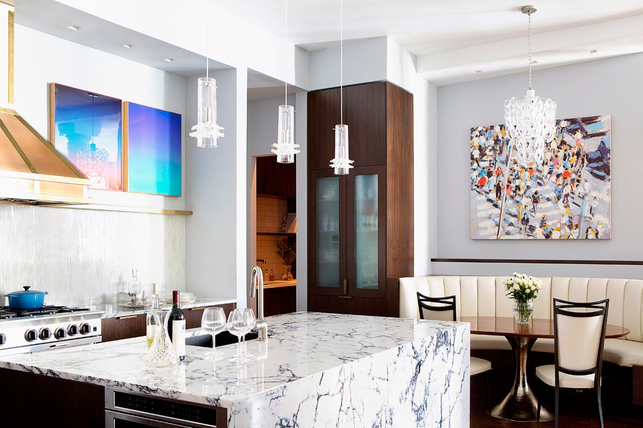 This family home is glamorous but practical and not precious for a family of five. The open plan allows for light and a stunning view of the Manhattan skyline. We mixed traditional furnishing with contemporary fabrics to make the home young and fresh. Many of the antiques were purchased from 1stdibs.