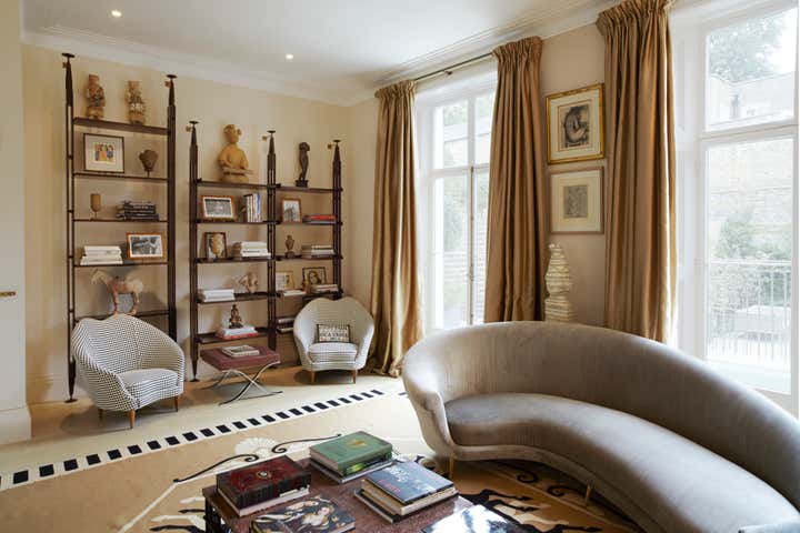 This house was created for an international family who have a very busy social life. They wanted very comfortable entertaining areas for many guests while maintaining a family atmosphere for their children. In the kitchen we commissioned an artist to create a feature wall out of the storage units giving a feeling of glamour.