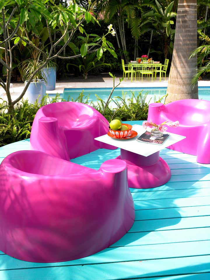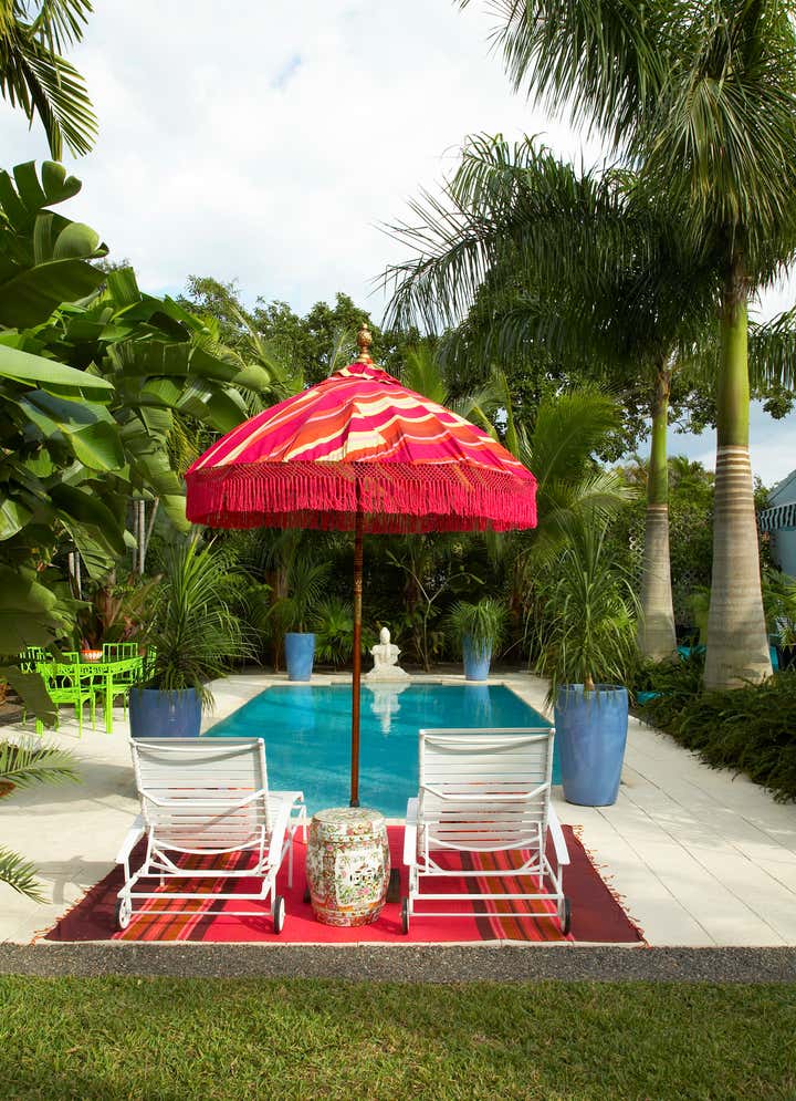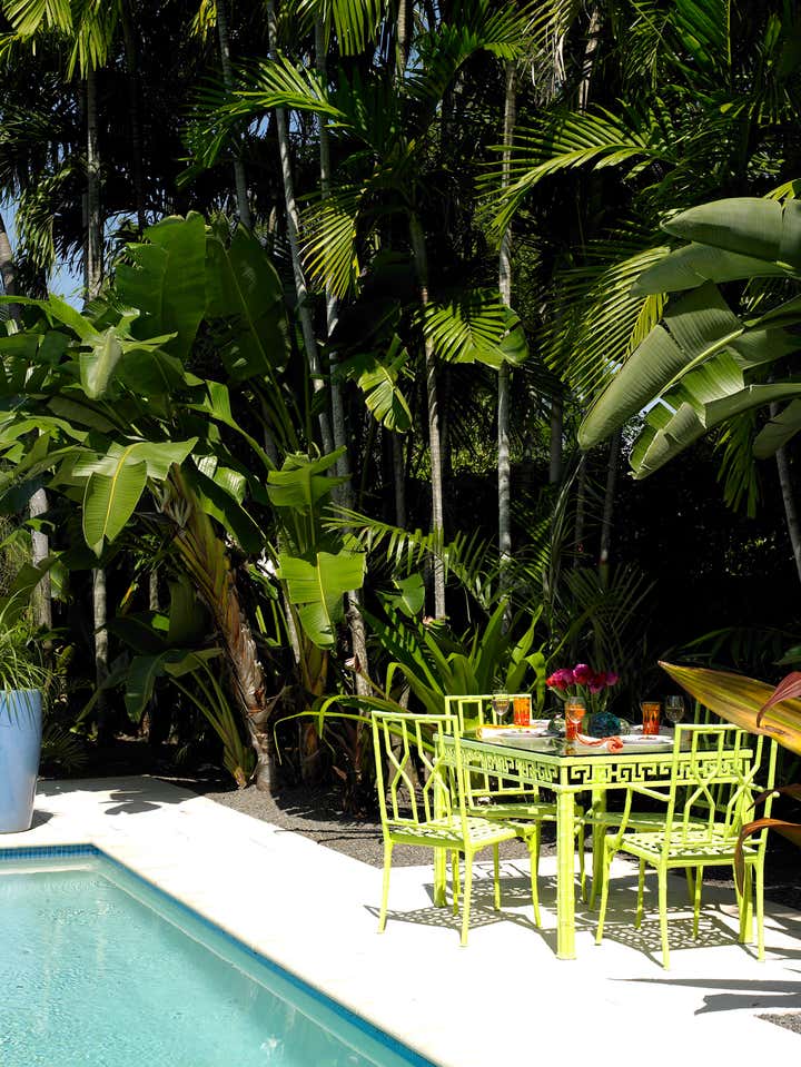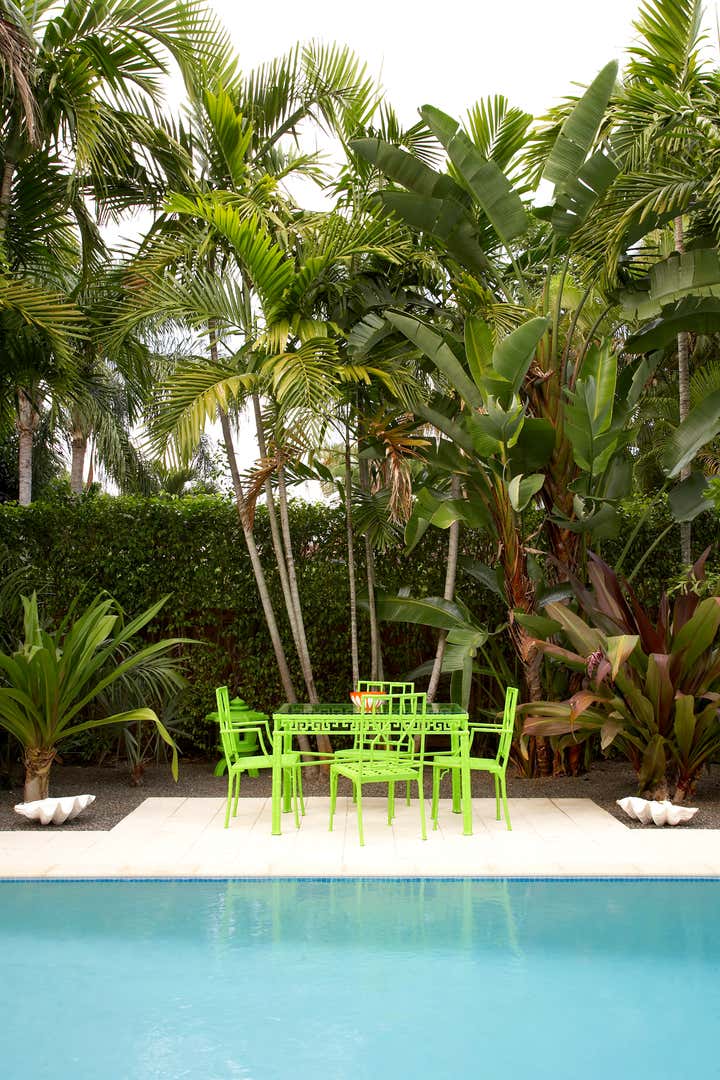 A backyard designed for entertaining and relaxing. An empty yard was the perfect canvas for Meyer to create tropical lush modern outdoor “rooms”. The clients love being outdoors. The pool areas are where everyone hangs out. The lanai, upper deck and the house can function many ways for entertaining – for example if there is a pool party – guests are instructed to enter through the back gate – therefore they do not go in the house – there is access to a full bath and outdoor shower, kitchen and bar. The main house is off limits for pool parties – people are soaked from the pool – and are not allowed inside. On the other hand if it’s a cocktail or dinner party – guests enter through the front and the pool area is more like a backdrop. It’s very glamorous and very fun.
