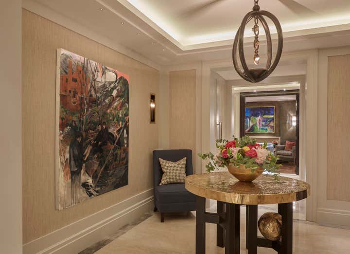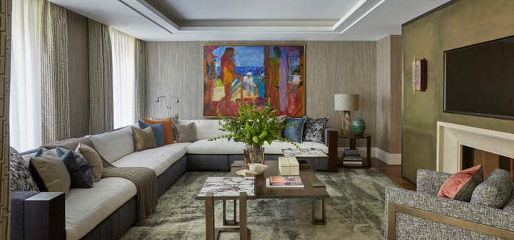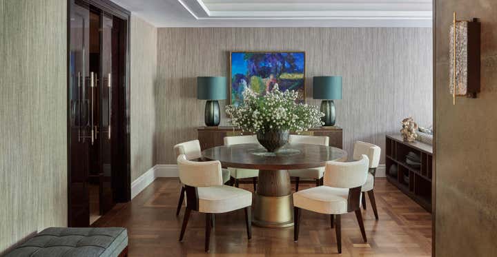A lateral apartment in Belgravia designed for Russian clients and their daughter as their London home; they the brief was to create a space which felt intimate but equally spacious for entertaining. An open plan living room was designed to be multi-functional with two rooms in one – each with its own distinctive aesthetic – which combine elegantly to complement and balance one another. The living spaces are designed as a subtly neutral backdrop to sophisticated art and a collection of feature pieces. Throughout the home, bespoke furniture and a unique layering of textures and colours combine to create a comfortable and liveable family apartment.