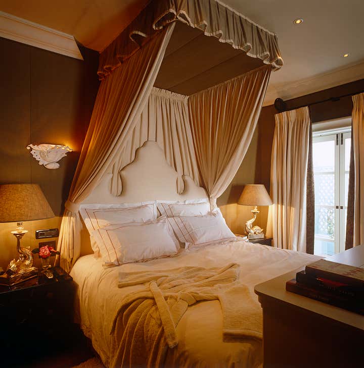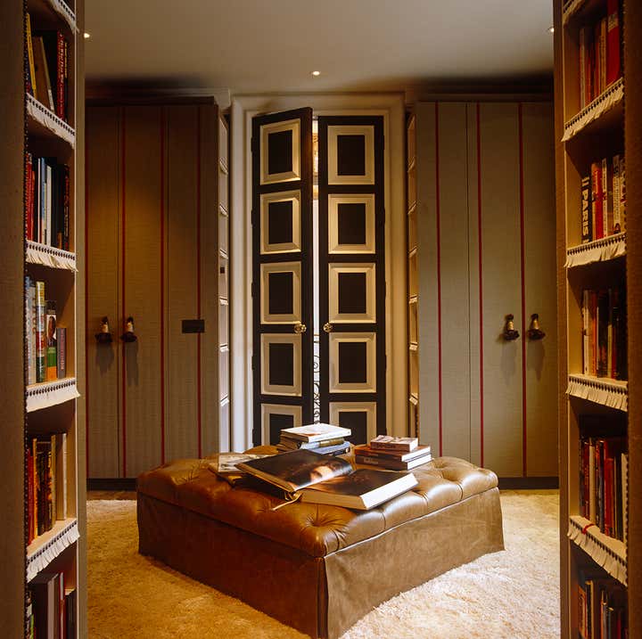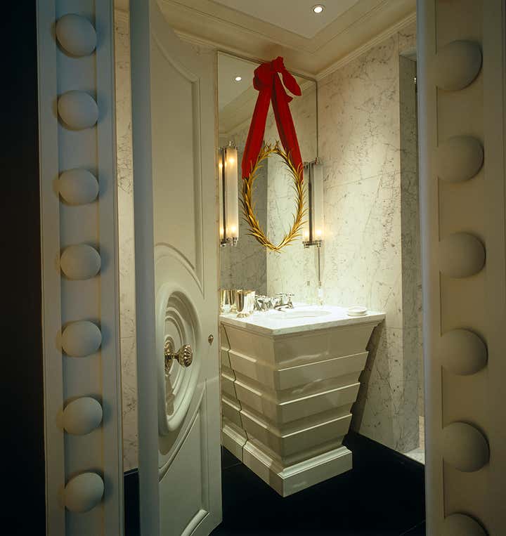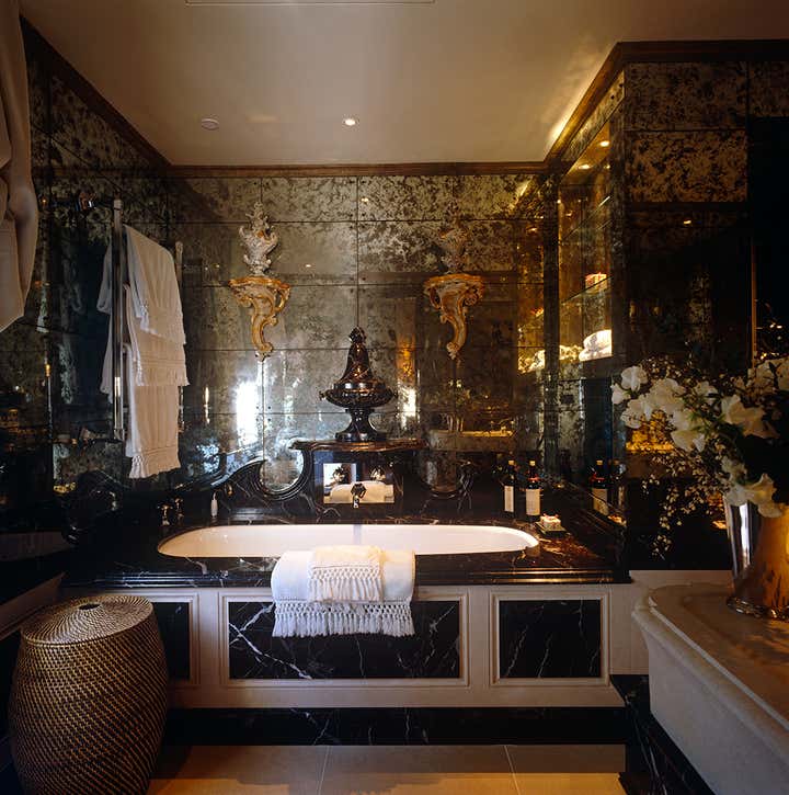 I designed this Belgravia townhouse for a rock-music mogul obsessed with 1940s New York, so it seemed obvious to reference the work of Dorothy Draper, one of my favorite decorators of that period. The over-scale plaster work, the black and white lacquer, the extensive use of mirror, and the earthy palette sharpened with zinging colour resulted in interiors that paid homage to the client’s preference, and created an ideal setting for his collection of contemporary art.