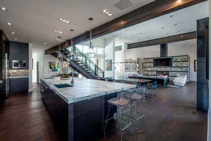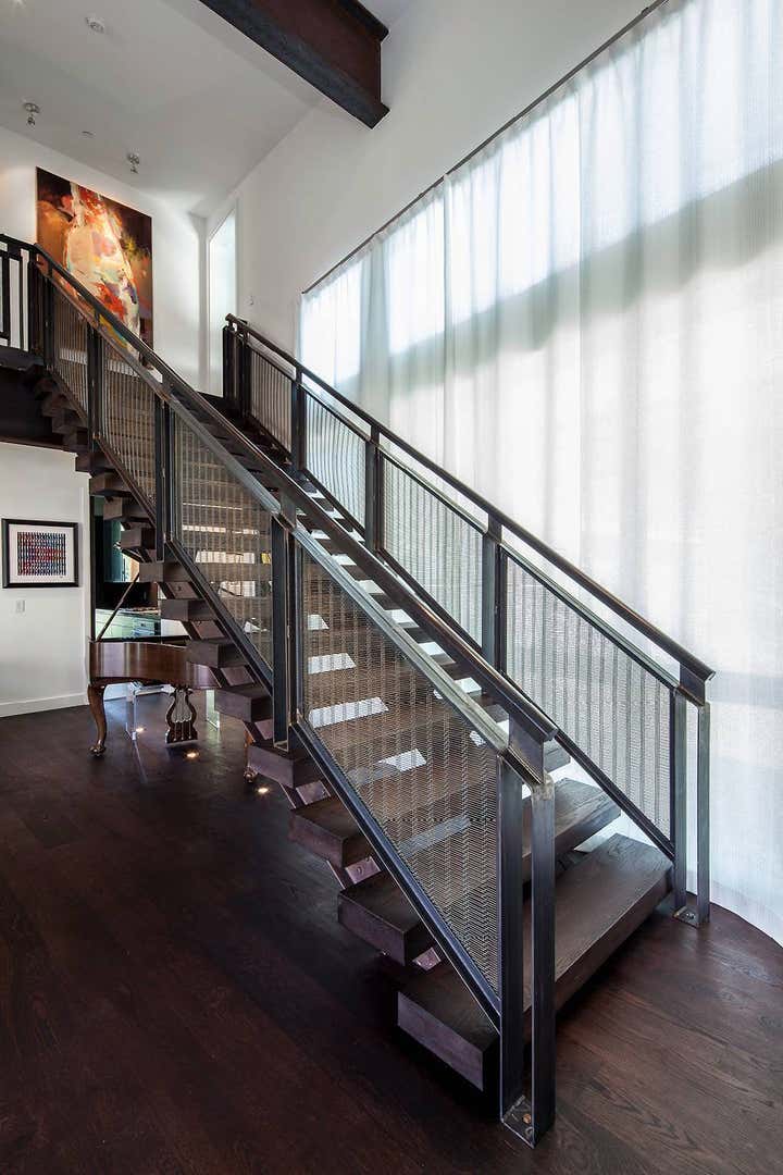 Most of the furniture for the 4 bedroom, 5 bath (plus office and gym) home was custom designed for the space ensuring a seamless aesthetic. The unique raw-steel staircase and railing anchor the great room with a stunning, sculptural effect while creating a niche for the family’s Steinway.