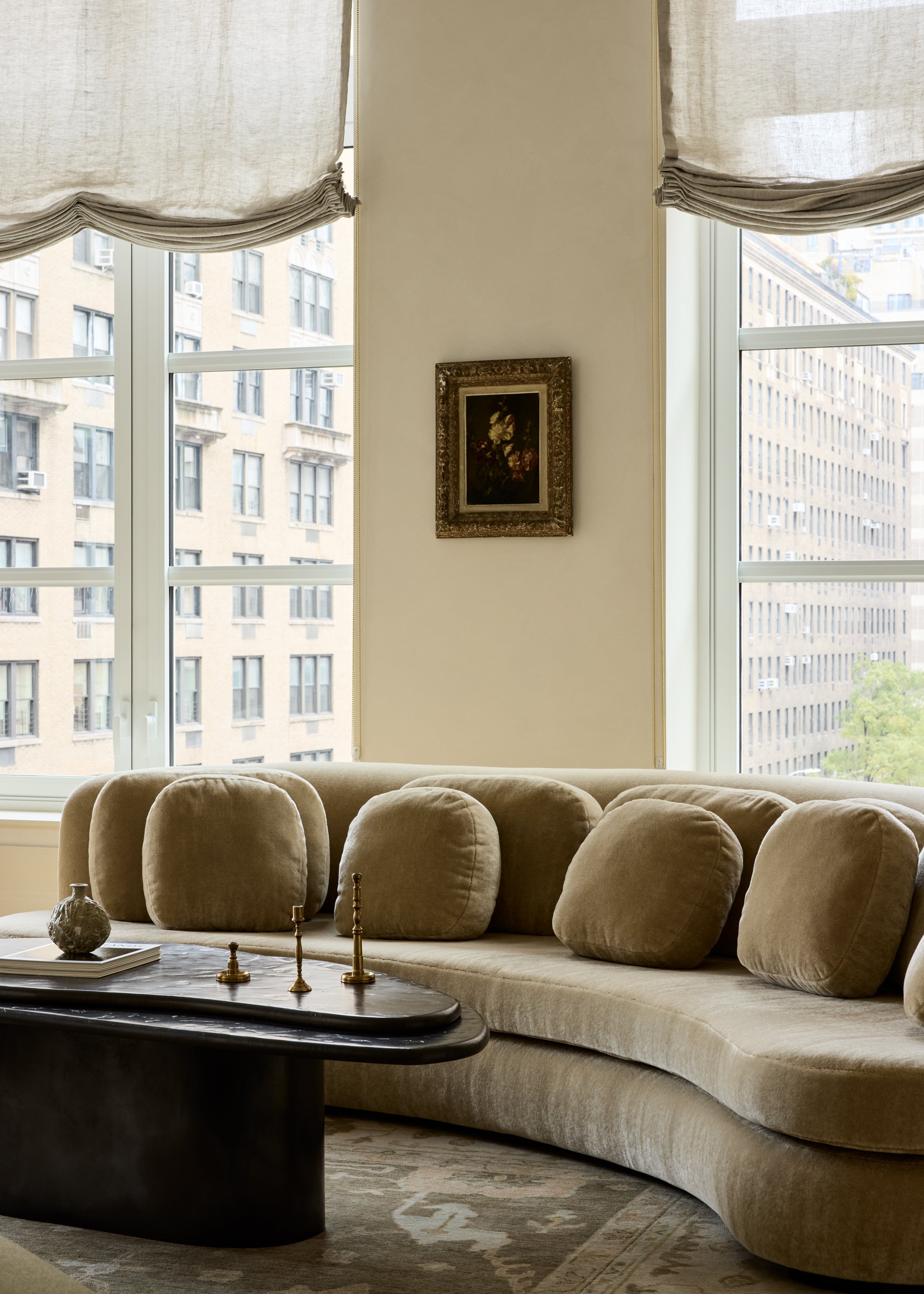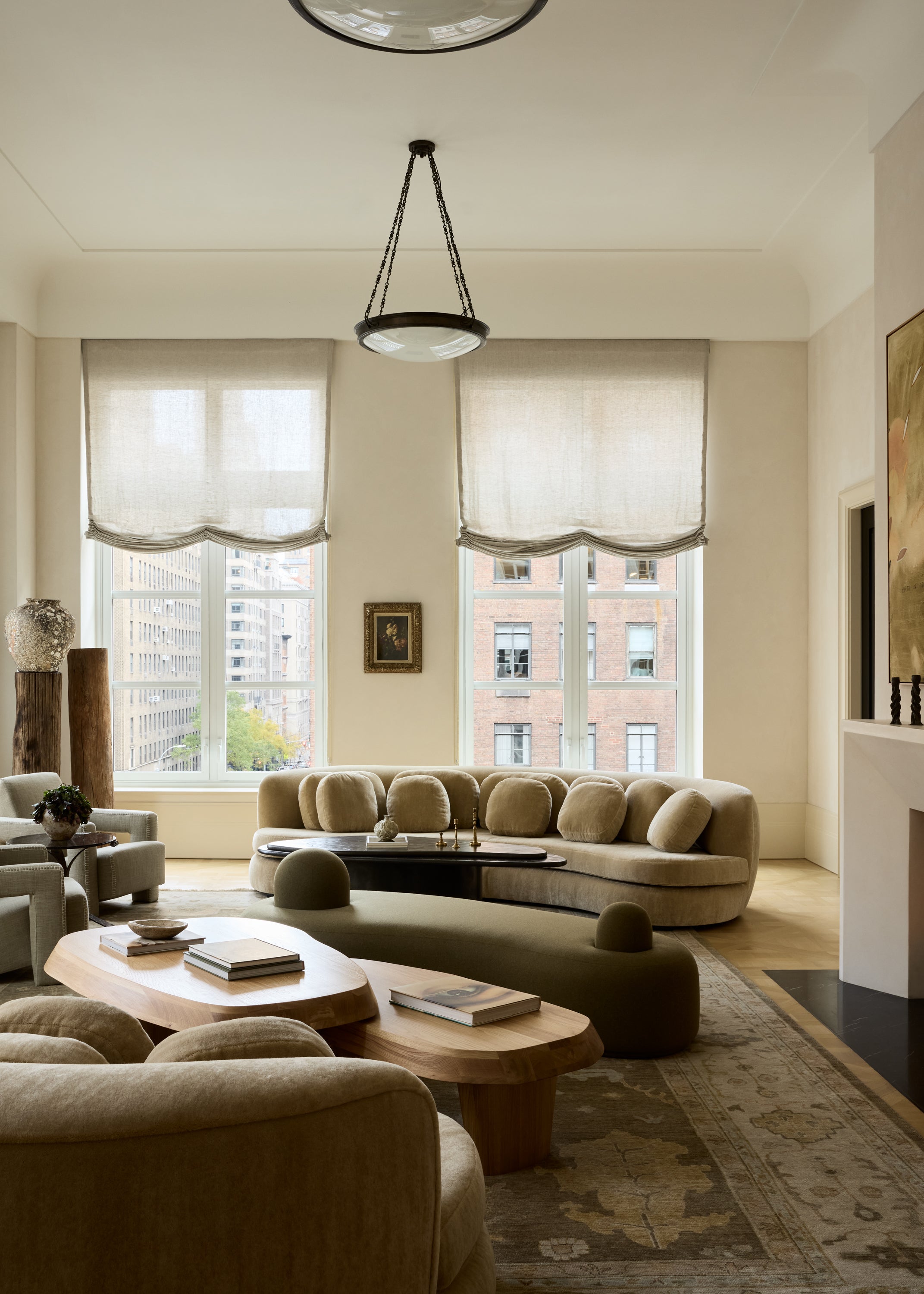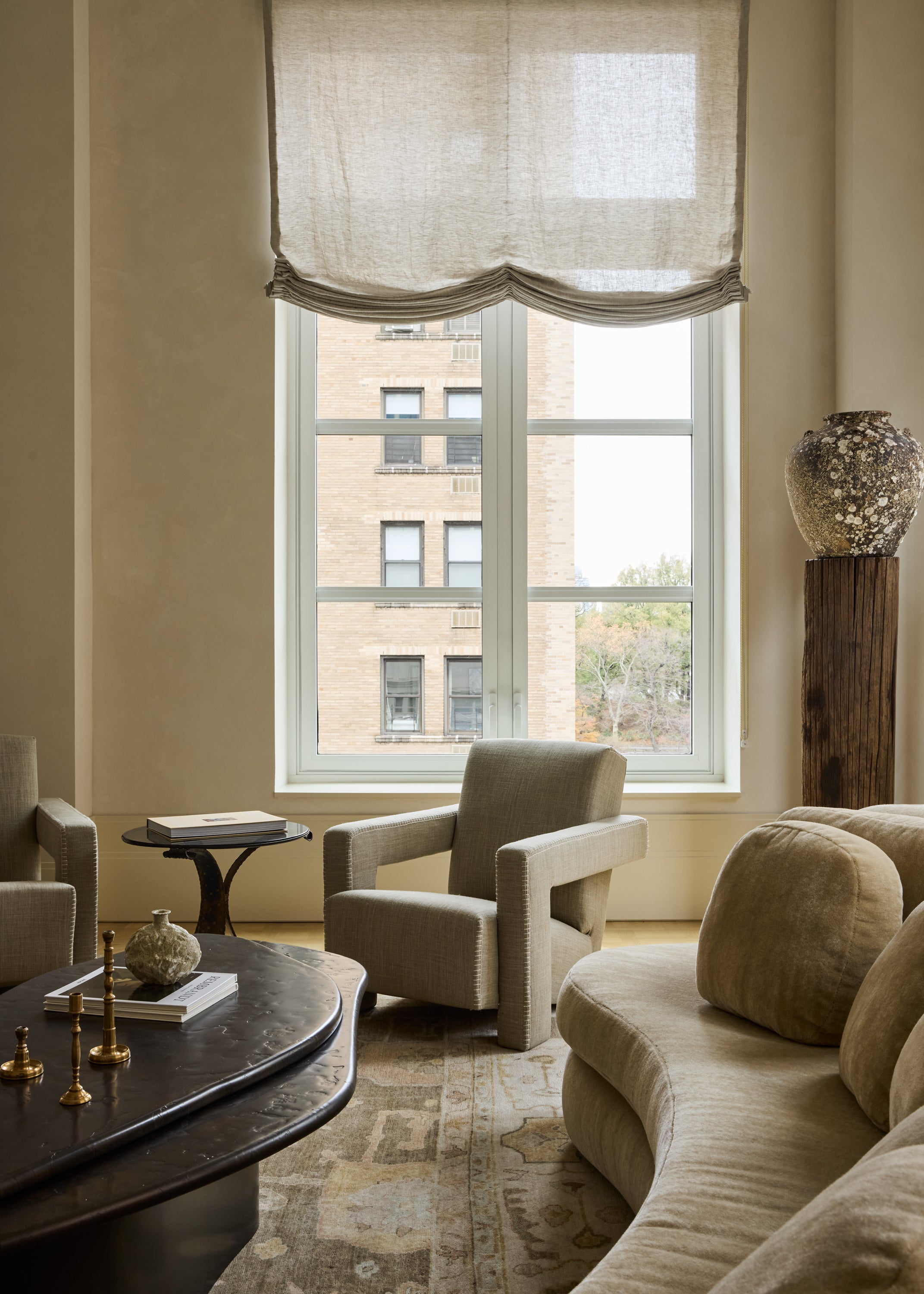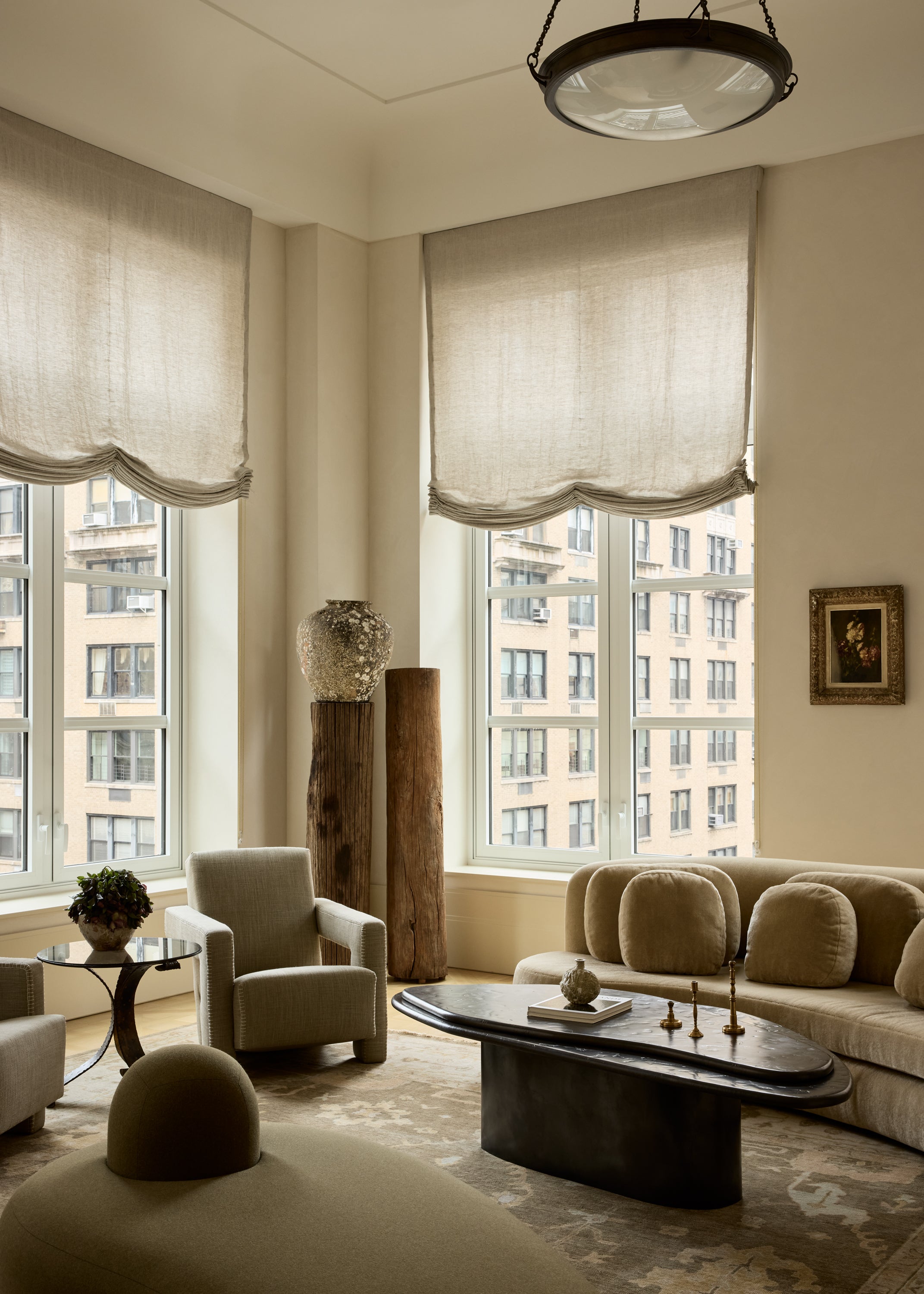 The apartment, located just one block from Central Park, offers an exceptional setting in a recently completed development designed by renowned architect Robert A.M. Stern. The property features light-filled spaces with wraparound windows in the Great Room and expansive ceiling heights, up to 13 feet. Our goal was to create a space that felt liveable and inviting while seamlessly integrating with the architecture. The base build of the home presents a clean, neutral palette, providing an ideal canvas for creating a warm and inviting family environment, resulting in a timeless family sanctuary that is both functional and reflective of the Clients needs and lifestyle.