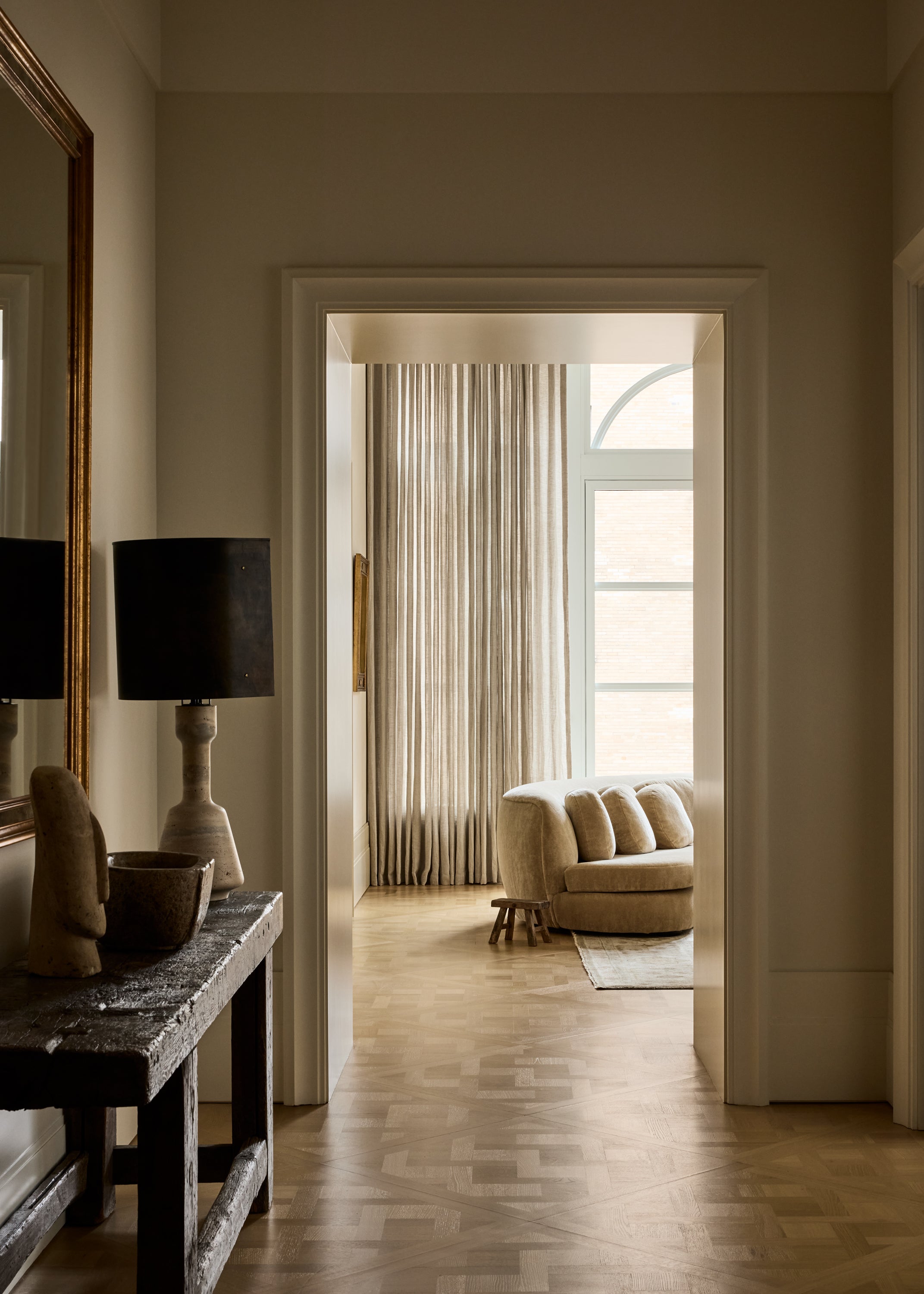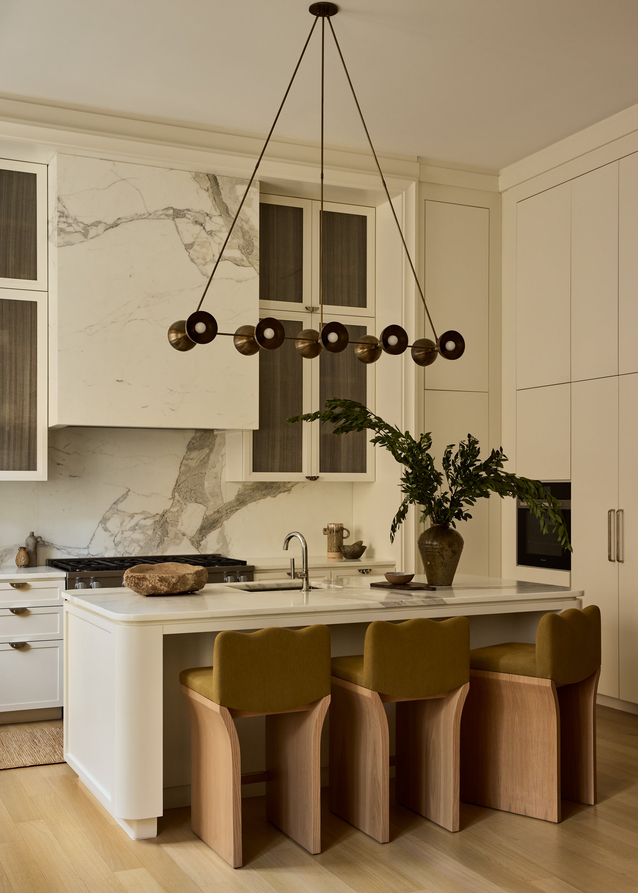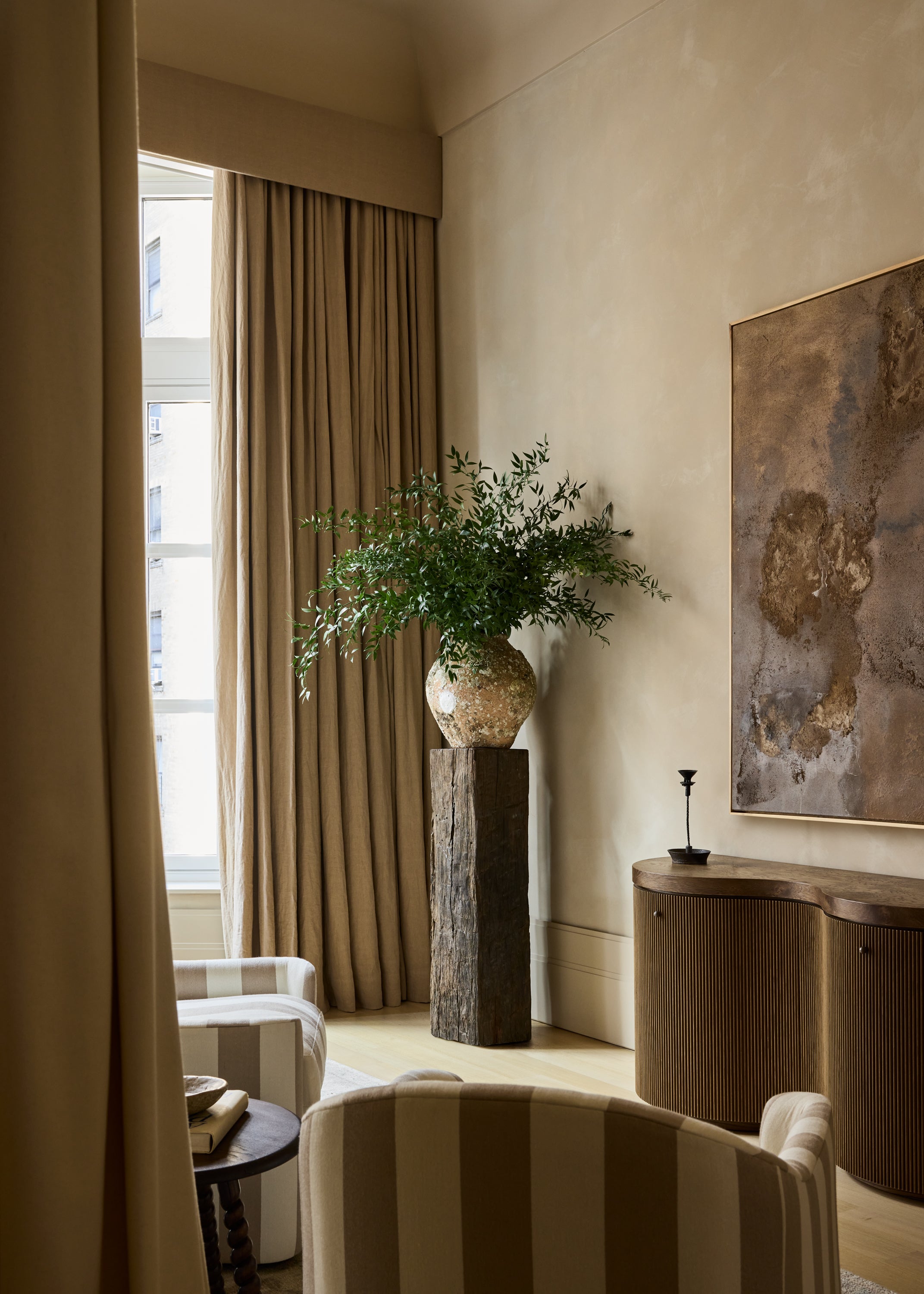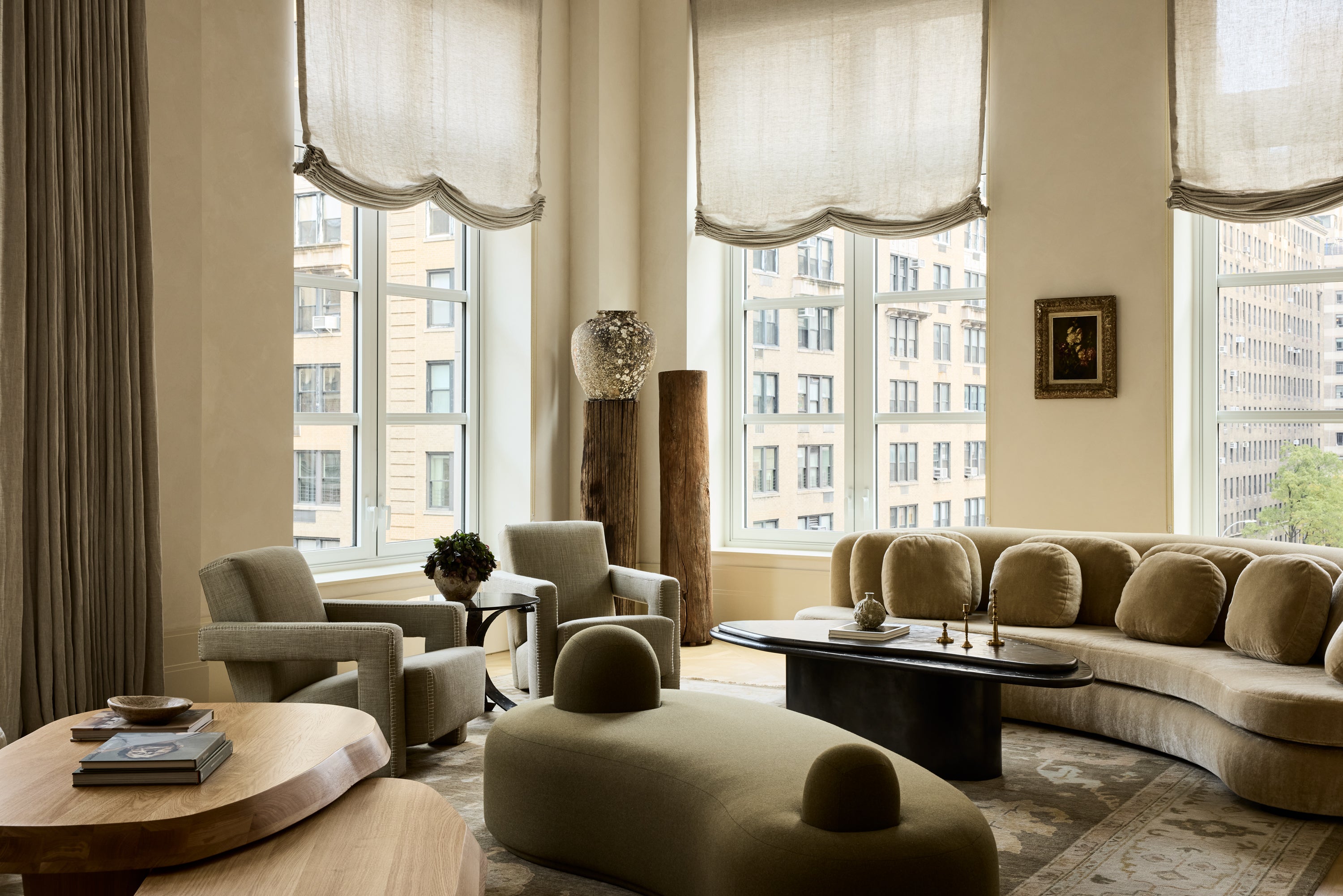 The apartment, located just one block from Central Park, offers an exceptional setting in a recently completed development designed by renowned architect Robert A.M. Stern. The property features light-filled spaces with wraparound windows in the Great Room and expansive ceiling heights, up to 13 feet. Our goal was to create a space that felt liveable and inviting while seamlessly integrating with the architecture. The base build of the home presents a clean, neutral palette, providing an ideal canvas for creating a warm and inviting family environment, resulting in a timeless family sanctuary that is both functional and reflective of the Clients needs and lifestyle.