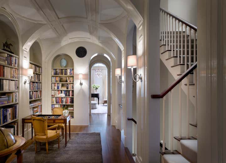 In restoring this townhouse to a single family house for a young family, Peter Pennoyer Architects reconstructed the entire building down to the party walls, creating a new structure set between a restored street facade and a newly designed garden facade. The focal point of the modern traditional interior, decorated by Matthew Patrick Smyth in cool shades, is the central stair with an atypical double approach from the ground floor foyer to the parlor level. It leads to the vaulted library on the second-floor, inspired by James Wyatt’s Heveningham Hall, with Art Deco circular grilles, walls of books, glossy ribbing, and a series of three arches that articulate the stair. As the stair ascends under the simple fifth-floor laylight, the interior architecture of the upper floors becomes even more abstract, reflecting contemporary tastes.
