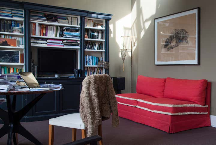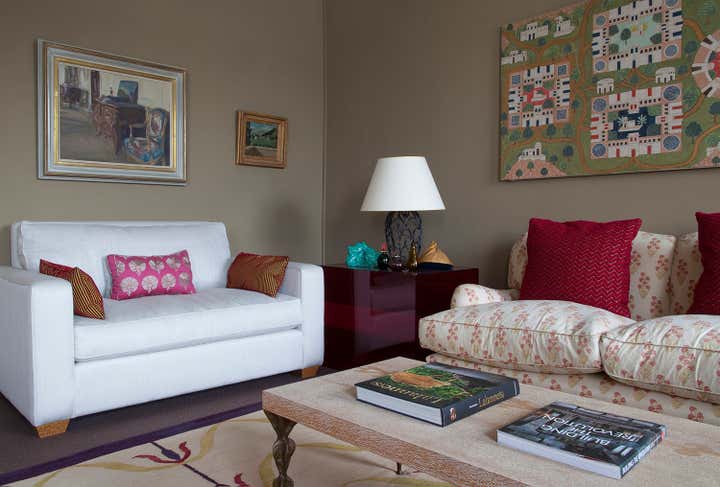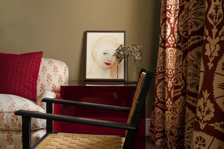 An apartment for a glamorous young lady in Notting Hill, the living room walls painted in olive drab, against which a carnation red sofa and perspex table sing. The curtains are in my custom printed Turkish Flower . The small dining room is divided from the kitchen by a screen of blackened oak with brass nail decoration, walls lacquered a deep aubergine and my Agile dining table, its steel base gilded, holding a black oak top.