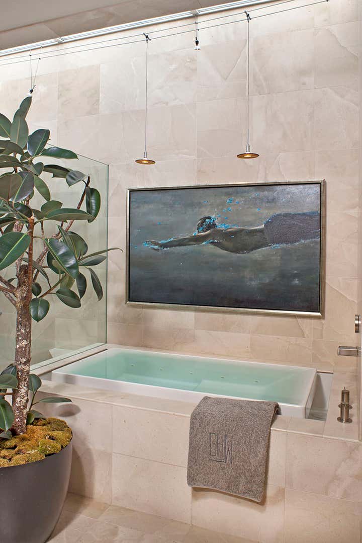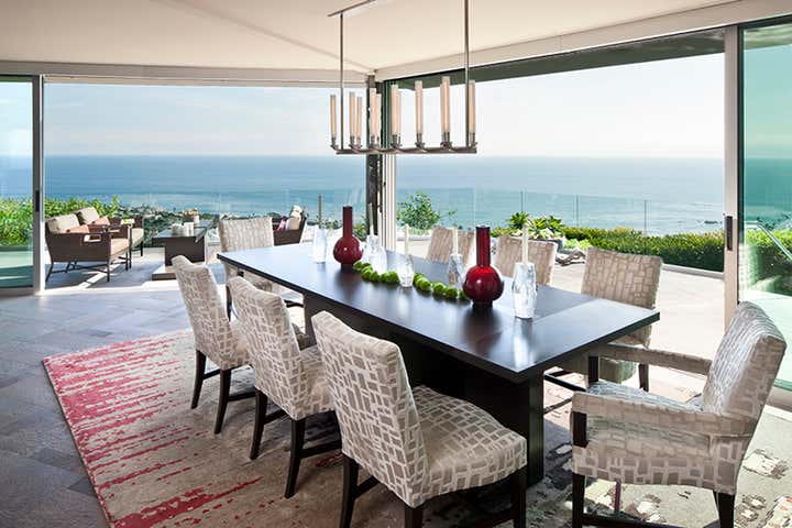 The owner of this modest-size home, a single man with a Porsche and fastidious taste in art and furnishings, wanted to enjoy the beauty of the beach, but also the vibe of a penthouse. When he brought on Sheldon Harte to help him achieve his goals, he got both: a wraparound deck overlooking a verdant cliffside and the ocean, and a bachelor pad complete with silk throw pillows on velvet, dark woods, and rock crystal. With the client’s preference for deep colors, Harte chose taupe limestone for the floors and Zebrano wood cabinets for the kitchen. For the furnishings, he created a palette of gray and taupe to complement the client’s color-rich art collection. In the bedrooms, the designer was more adventurous, selecting a handmade Barkskin wallcovering for a toffee-and-gold-hue guest room with a floating Antoine Proulx bed. The result: a house that’s a textural masterpiece down to the floors, where custom artistic silk rugs add an additional layer of richness to the luxe interiors.