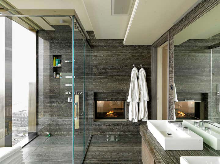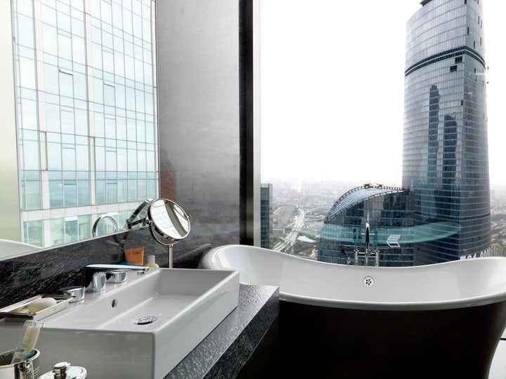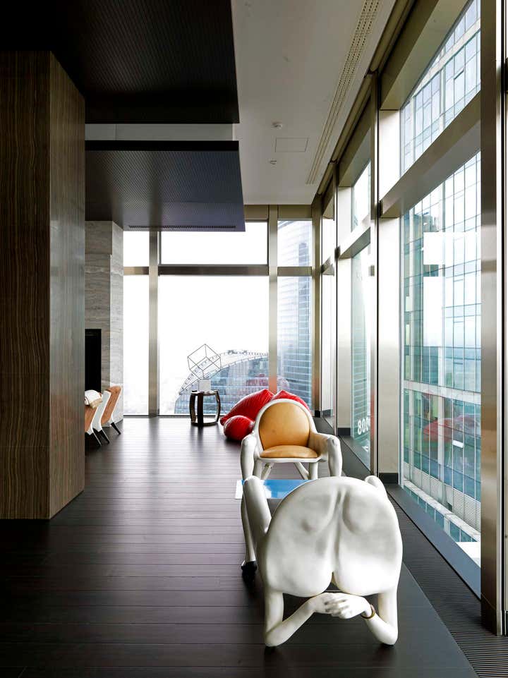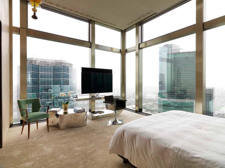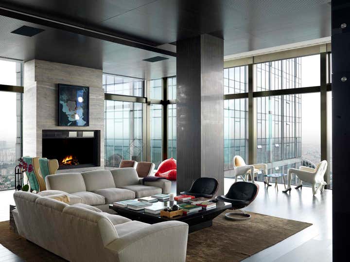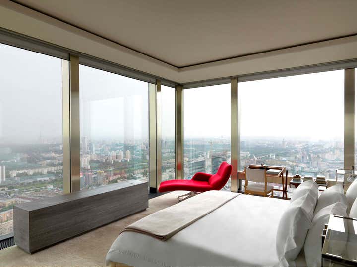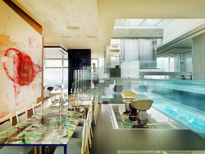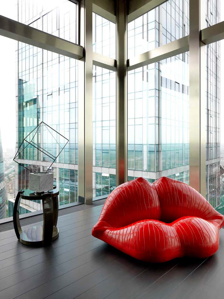 A cube of 12 meters per side lies at the 64th floor of the so-called St Petersburg Tower, one of Capital City towers in Moscow. For the design of the penthouse, Massimo Iosa Ghini worked using different scales, combining bold architectural solutions with refined interior design. The volume of over 600 square meters is divided into four levels with a long swimming pool acting as a central plug; walkways, stairs and glass ceilings are used as a physical and visual connection between the different levels and environments, in an effort to separate each functional area of the house while continuously interacting with one another.