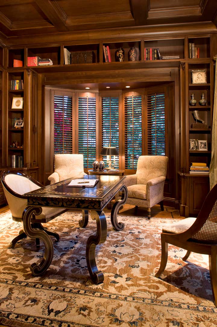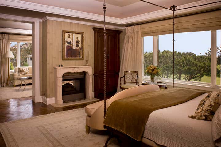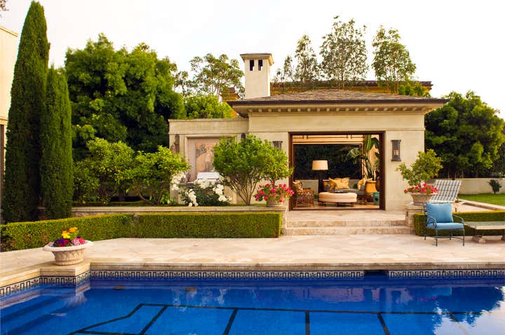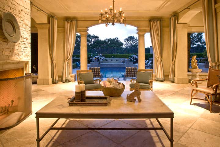 This Mediterranean-style house in an exclusive coastal area of Orange County called Pelican Point was designed from top to bottom by Sheldon Harte for an executive in the fashion world who wanted traditional interiors. Mixing select antiques with luxurious furniture and fabrics, Harte created a "tailored" look, like his client s own fashion style. The interiors are elegant, not opulent, with dashes of formality and whimsy. The grills flanking the entry to the dining room are Asian-inspired, while the furnishings are European, many of them well-appointed antiques, including the living room rug from Mansour. The dining room displays a touch of Italy, with walls covered in luxurious Fortuny silk, and the master bedroom walls are sheathed in faux bamboo. The house has an abundance of outdoor loggias and a pool house – which Harte designed with furniture suitable for year-round entertaining.