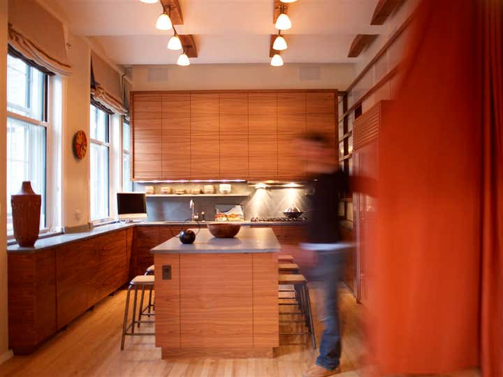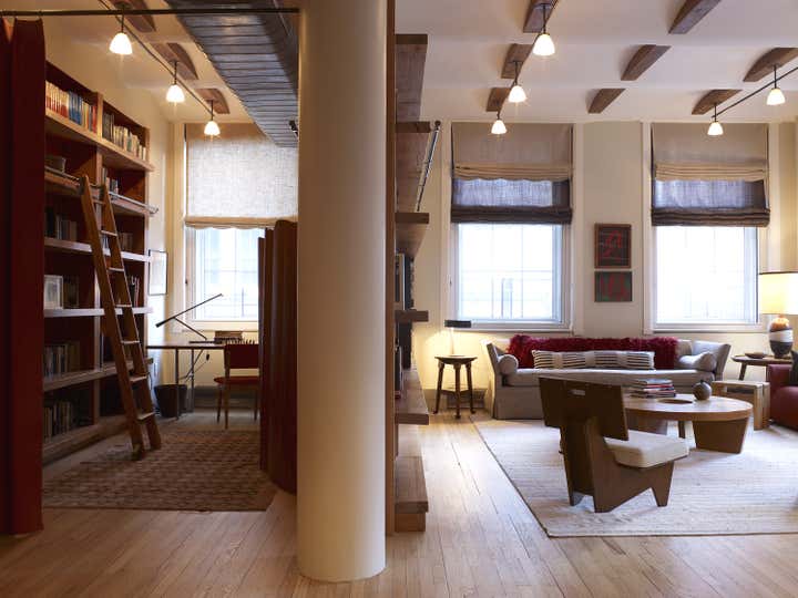Housed in one of Tribeca’s premier iconic landmarked buildings, this 3,500 square foot loft was gut renovated and carefully reimagined by 2Michaels. The custom kitchen was designed for a growing family with hand crafted butternut cabinets and stone counter tops. Floor to ceiling bookshelves were made from solid Douglas fir, one bookcase serves as a screen divider between the study and living area. Walnut closets line the hallways, detailed with compartments for every member of the family.