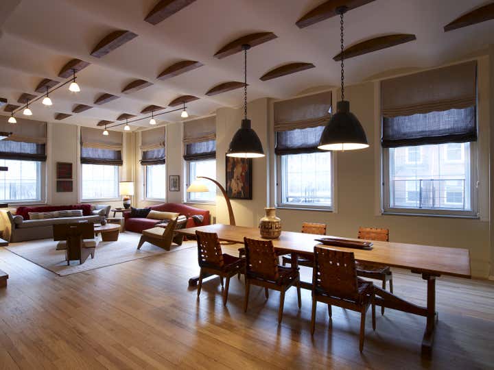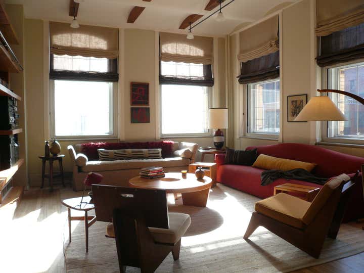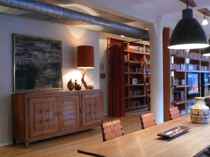 2Michaels selected 20th century pieces such as George Nakashima, Frank Lloyd Wright, Charles Dudouyt and Le Corbusier. Pairing them with custom made sofas, an 18th century English dining table and leather woven chairs from Abel Sorenson 1940 s. Vintage lighting from Belgium and France enhance the architectural elements. A double set of horsehair window shades provide both translucency and privacy in the living room. Vintage tribal rugs and soft fabrics add texture and warmth throughout the space.