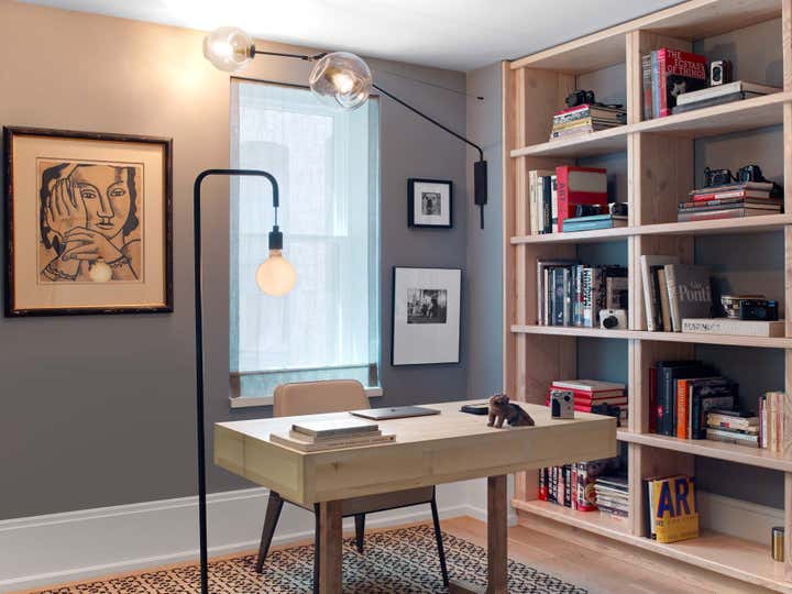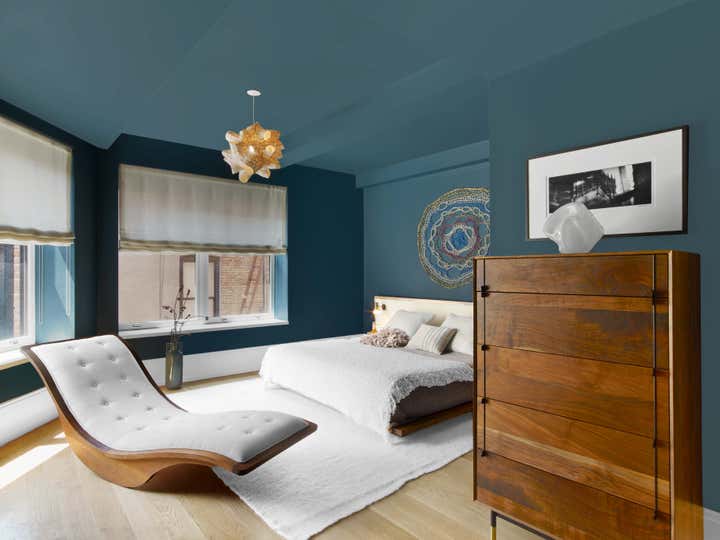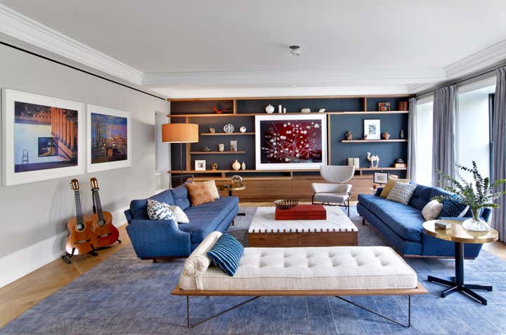 The new apartment is located in a brownstone building that a developer converted from dozens of small units into a few large ones. The couple wanted a home that was warm and welcoming not clinical and cold. 2Michaels played off the stark white walls and dark wood work choosing hues of indigo blue, ochre and grey as their palette. The couple didn t want too many antique pieces of furniture instead they gravitated to current craftsmen - BBDW, Asher Israelow, Lindsey Adelman and KGBL.