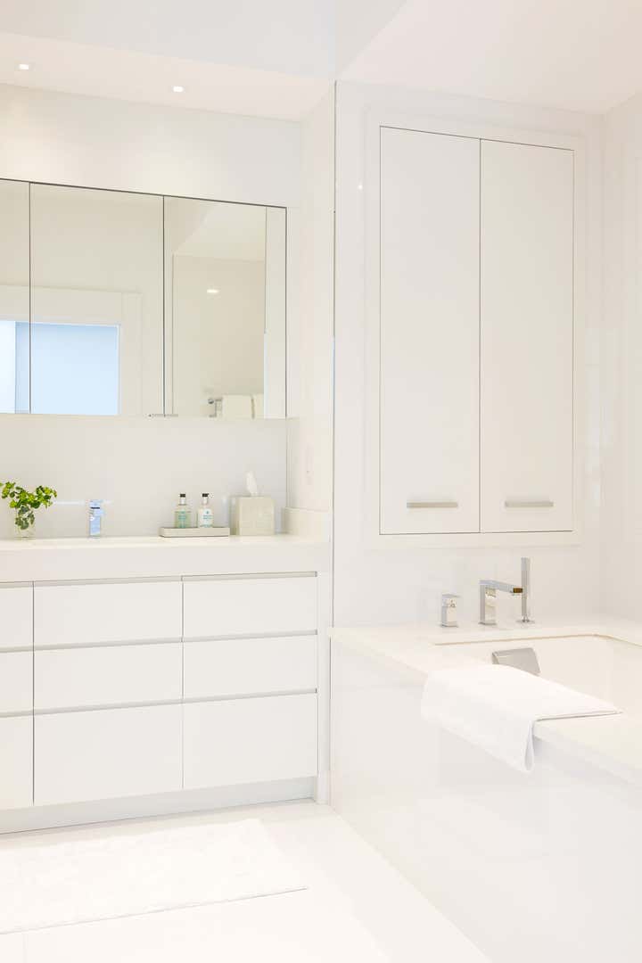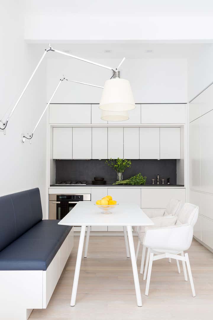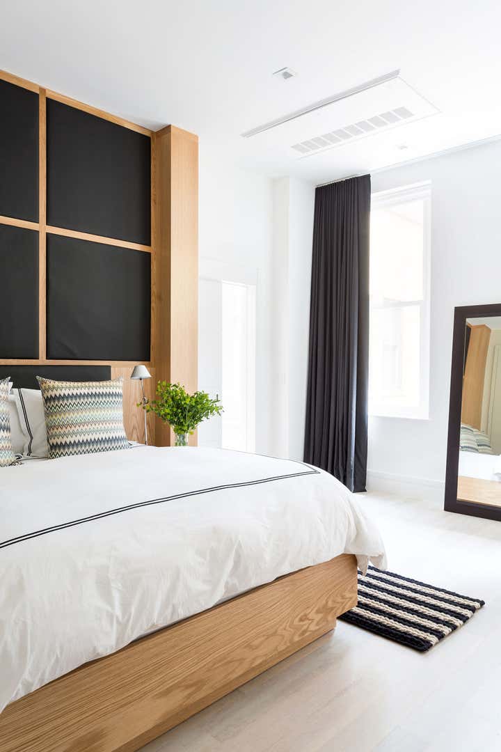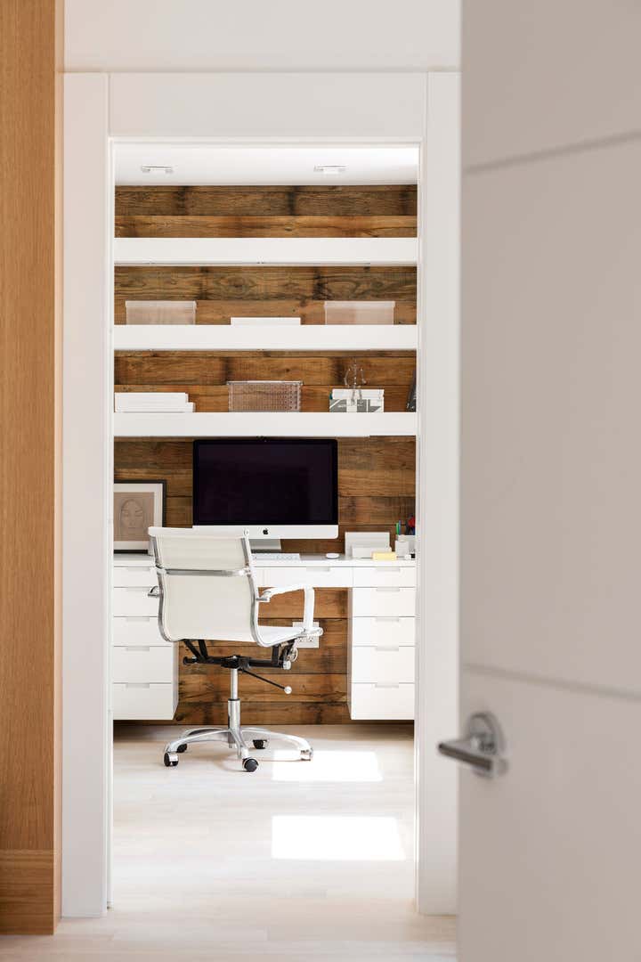 This pied-a-terre for an international student is located in a downtown New York City pre-War building. The client asked Marcia Tucker to create a calm oasis, a place where this student could find and express her creativity. To inspire a sense of calm order throughout the apartment, Marcia designed built-ins to minimize clutter. She selected crisp colors (black, white, and gray with hits of yellow and blue accents), with very little pattern, to bring in some happy energy, and complemented this with the warmth of wood and leather. The wall- mounted, black leather-clad squares that create a headboard in the master bedroom are a clever and chic space saver. The reclaimed wood wall in the office adds warmth and acts as a nice counterpoint to the all-white office and adjacent bathroom.