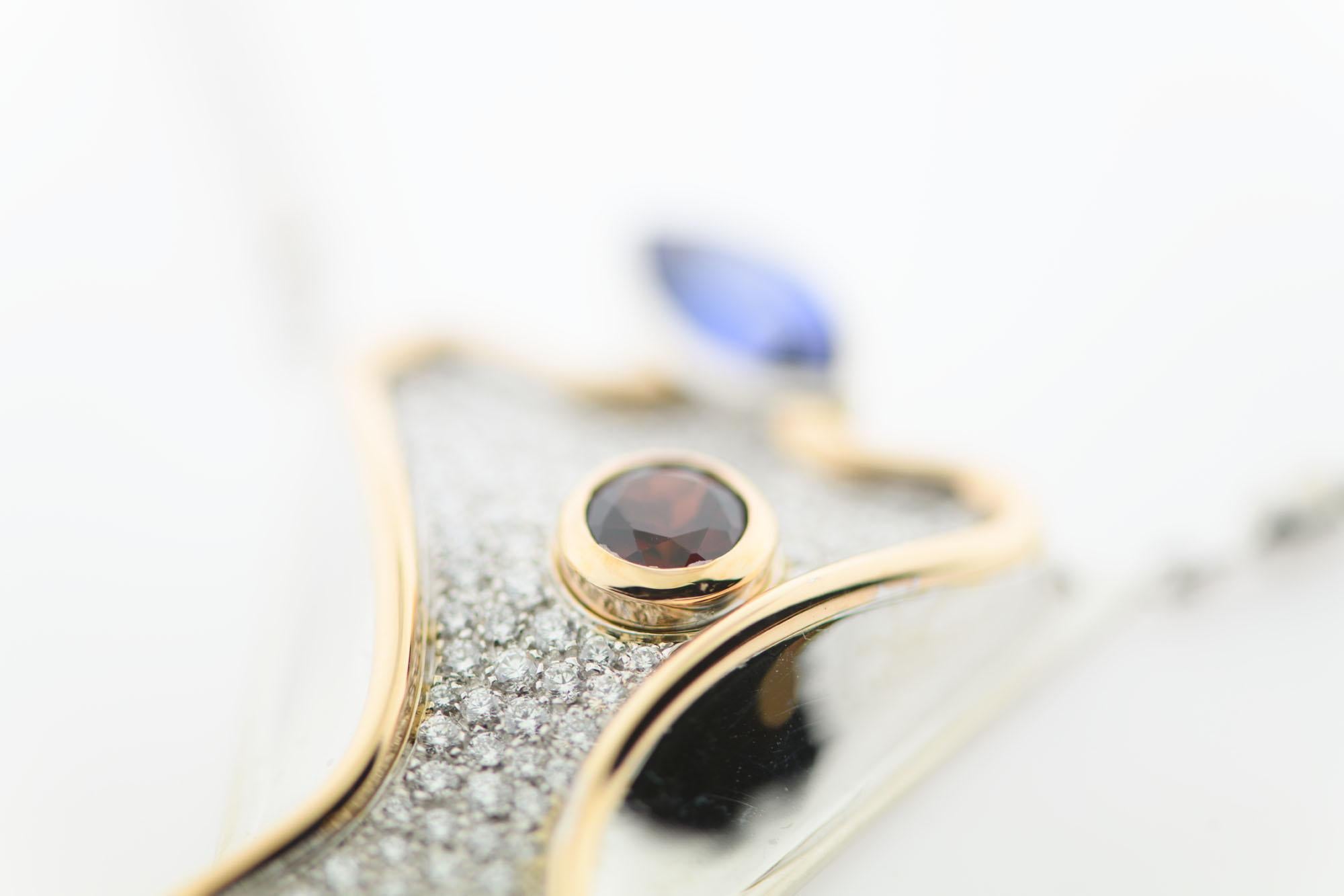 White golden necklace is A PIECE OF THE SET called "3 Punti" out of the Love Collection by SigridB. including: 1,84ct. of brilliants VVS1 E/F, 2,30ct. Tanzanite and Garnet Stone.