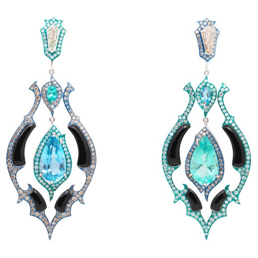 Der Tanz der fünf Kaiser-Ohrringe aus der 'The Garden of Myth Collection'S von Austy Lee. Diese Das schillernde Paar Ohrringe ist mit natürlichen gelben Diamanten, Onxy und weißen D...