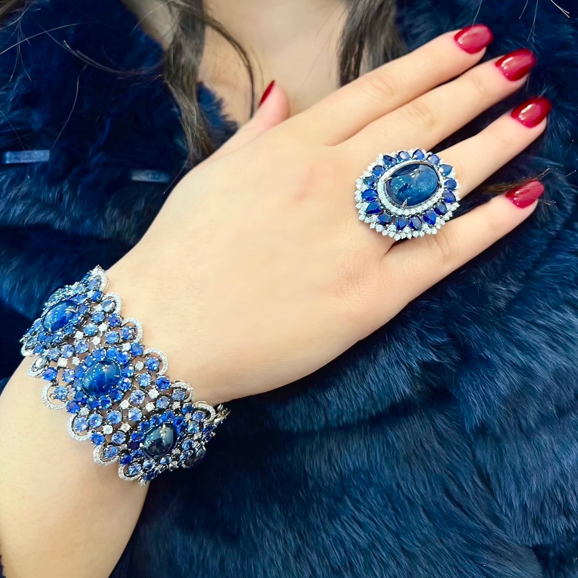 An exquisite display of cabochon sapphires, accented with ombré tones of Ceylon blue sapphires and round brilliant-cut diamonds