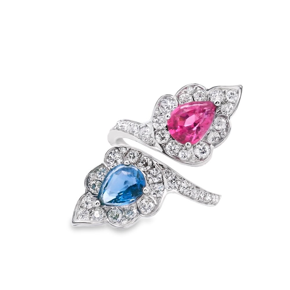 Toi et Moi Double Pink and Blue Ceylon, Burma Spinel, 18k White gold Bypass Ring