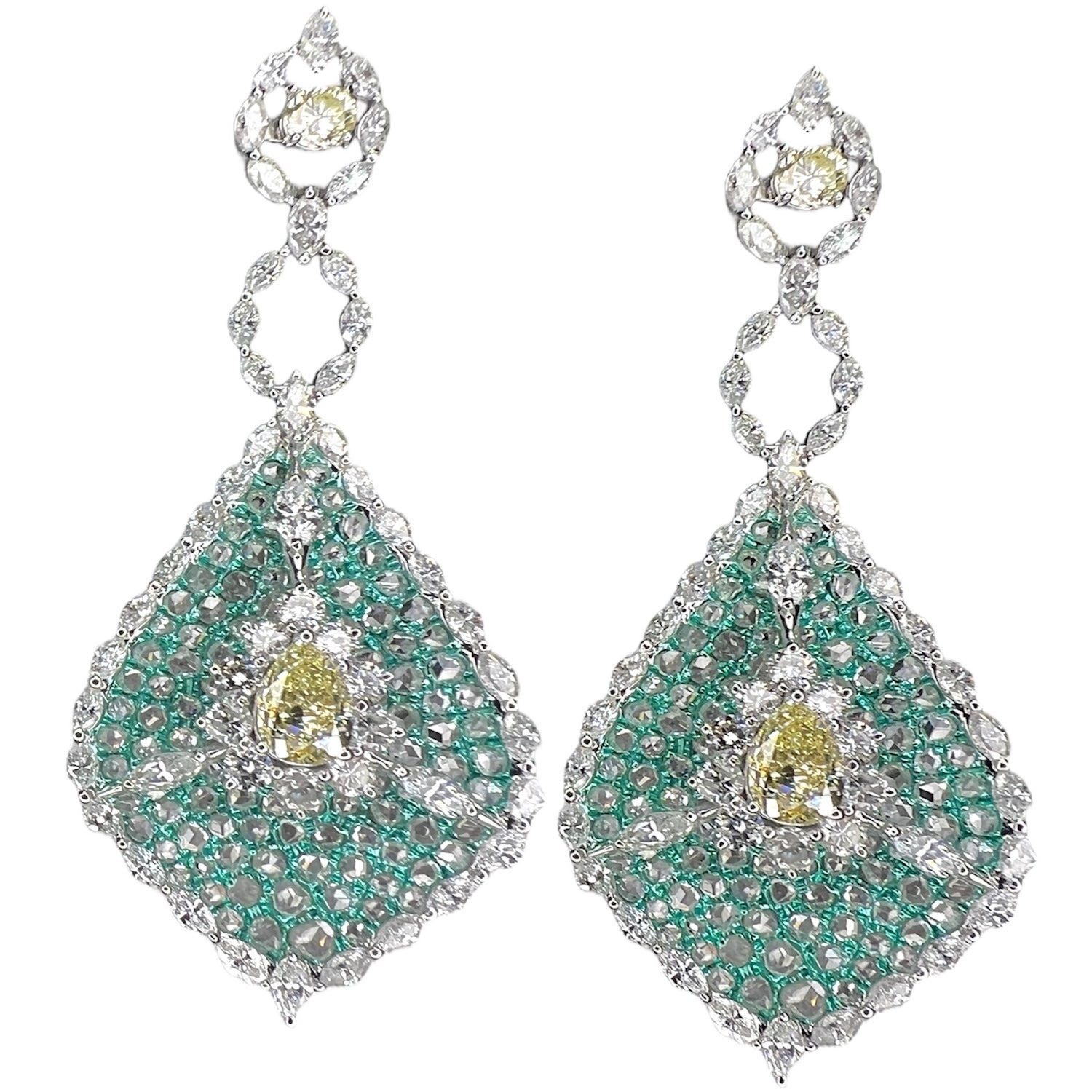 Custom Platinum Diamond Earring 14.00 carat Fancy Yellow and White Rose Cut Chandelier.